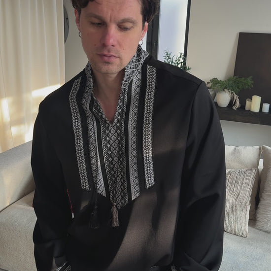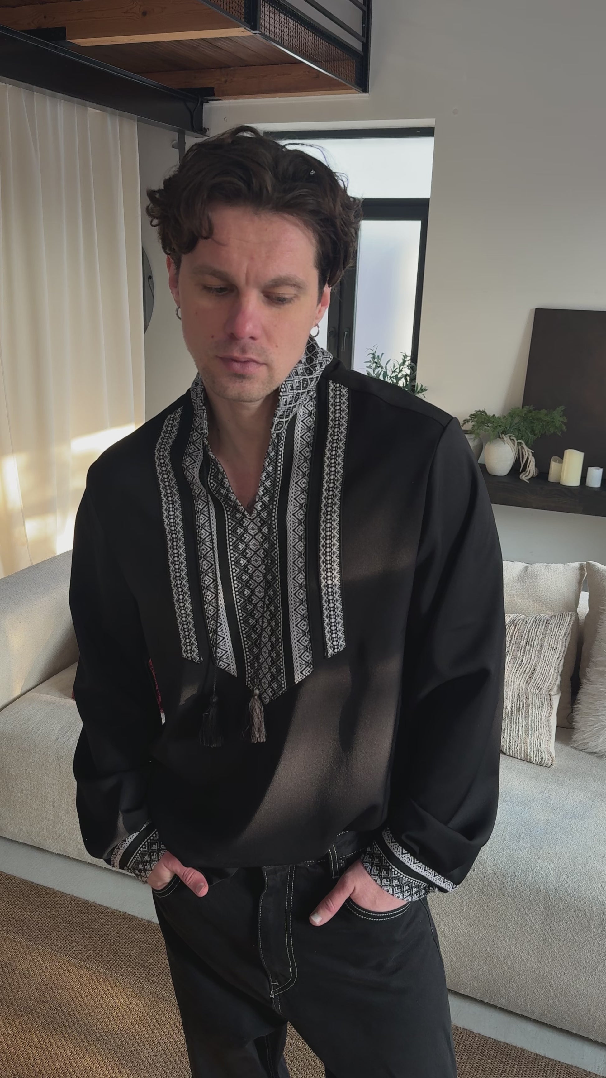 SKU:Нова Чоловіча чорна вишиванка Спадок,біла вишивка