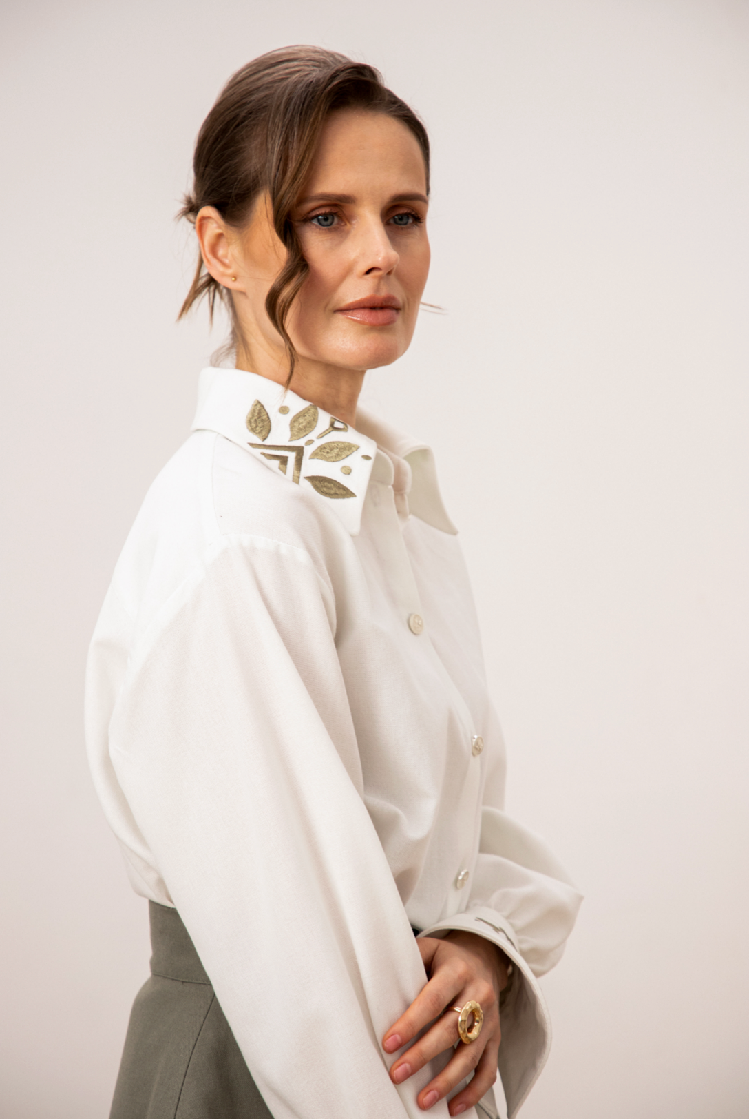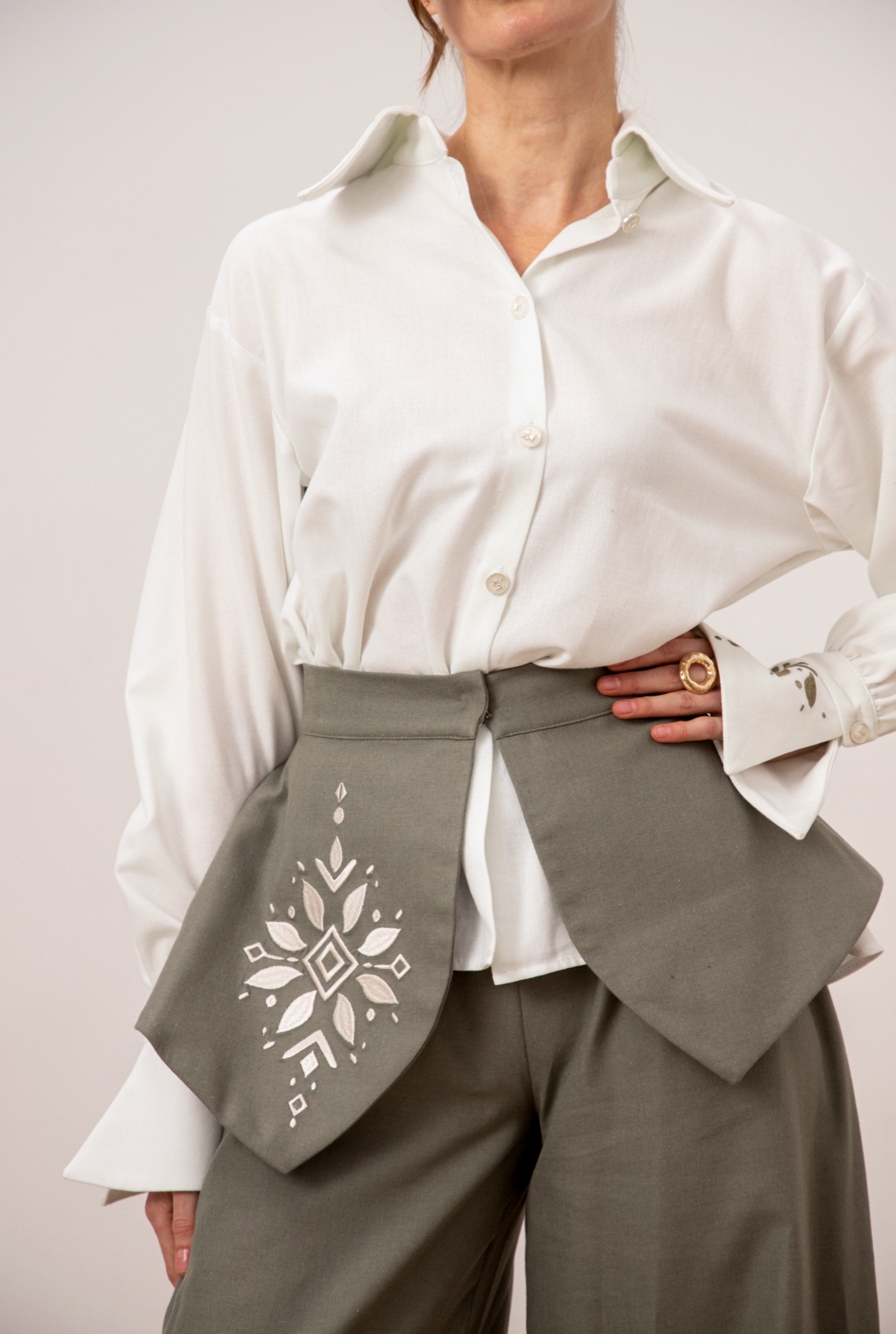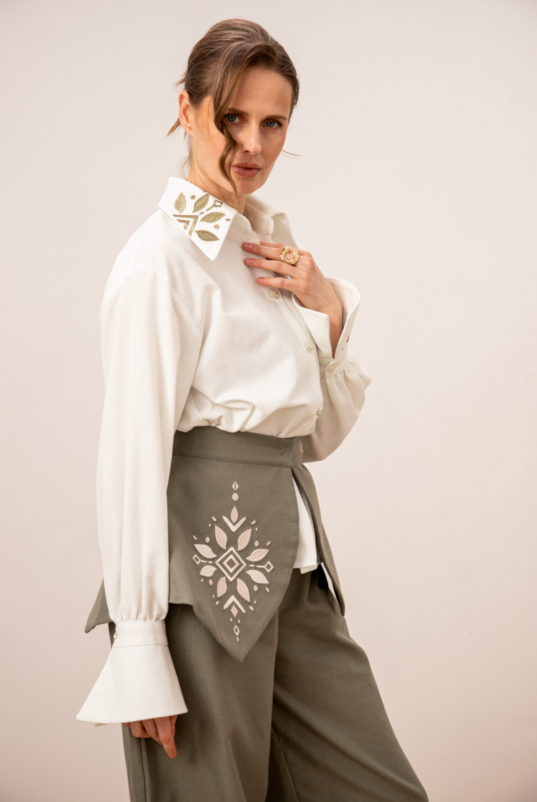 Цей образ — ідеальне поєднання сили та спокою, створене для вашої впевненості. Головним акцентом моделі є вишукані квіти, вишиті технікою гладдю, що додають виробу індивідуальності та перетворюють його на справжній ексклюзив вашого гардероба.