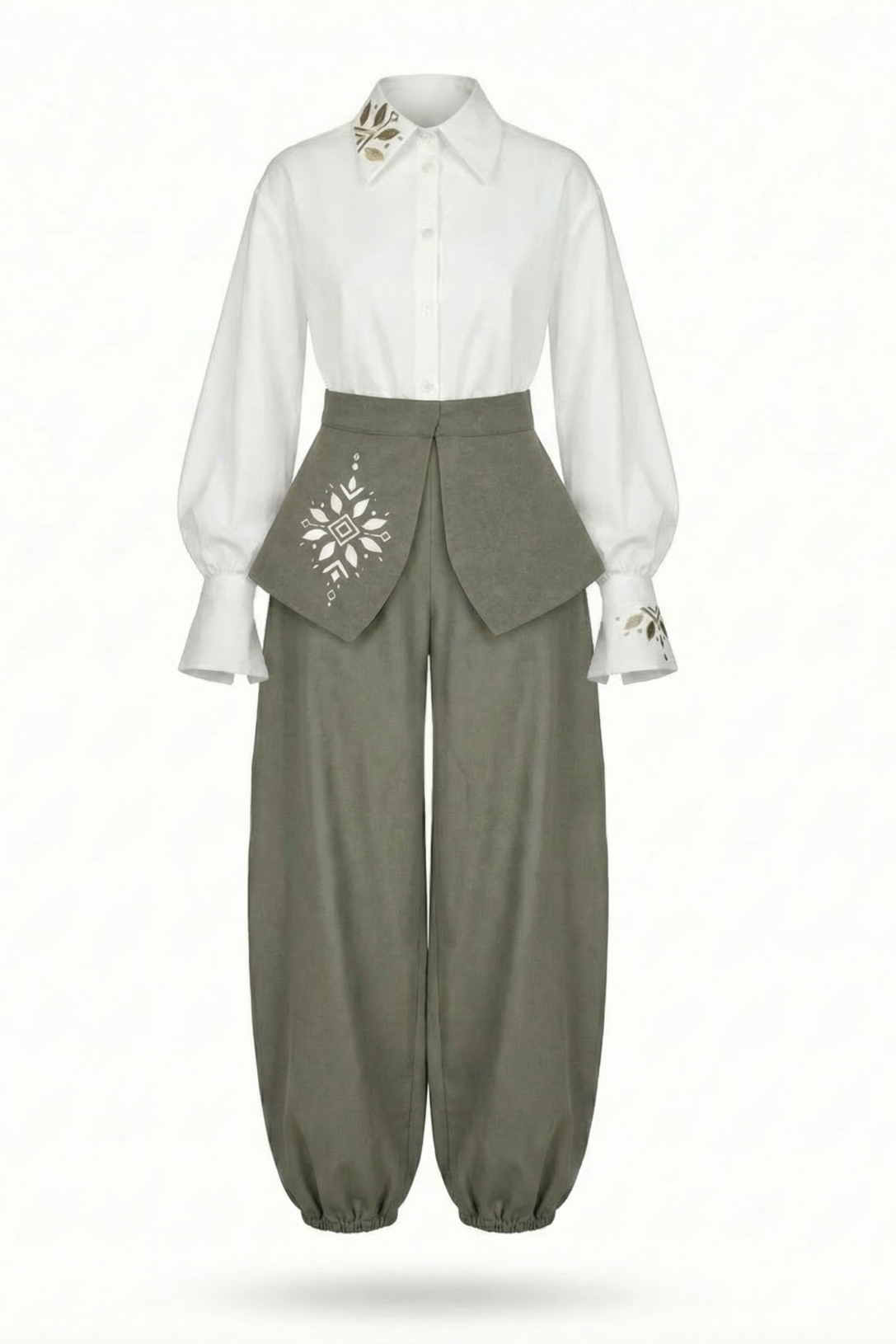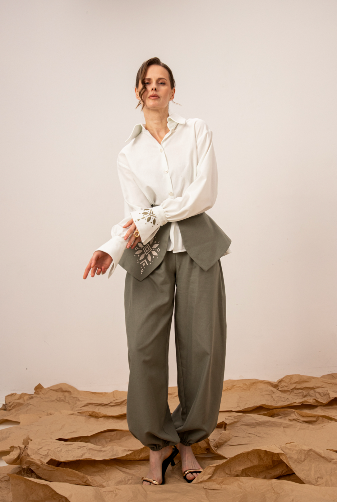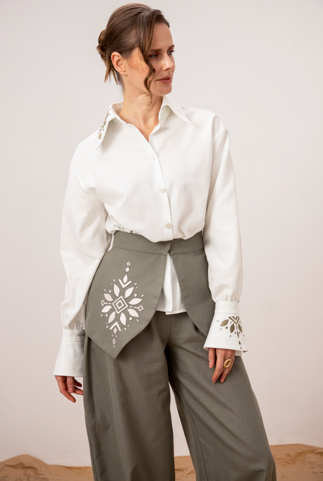 Цей образ — ідеальне поєднання сили та спокою, створене для вашої впевненості. Головним акцентом моделі є вишукані квіти, вишиті технікою гладдю, що додають виробу індивідуальності та перетворюють його на справжній ексклюзив вашого гардероба.