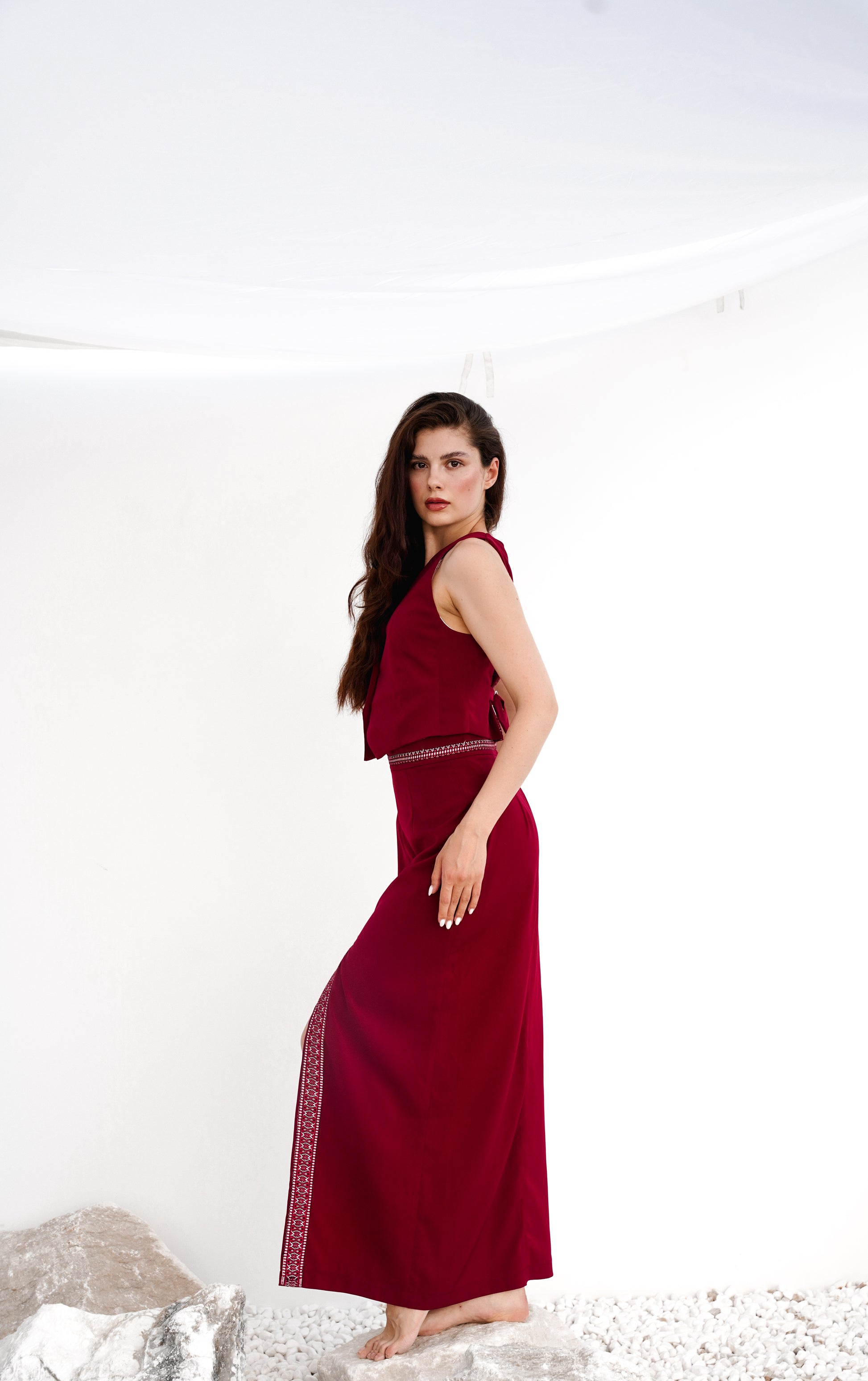 This suit is the true embodiment of elegance and strength. The rich burgundy color emphasizes the character and adds depth to the image. The easy fit of the jacket combined with the elegant top and skirt with a bold cut creates a harmonious balance between classic and modern femininity.