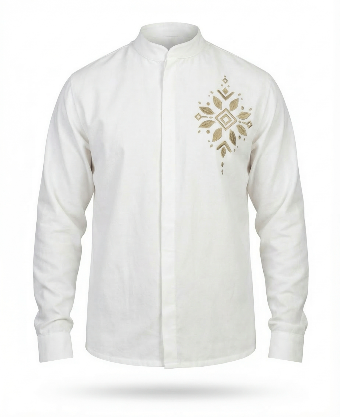 Ми обрали натуральну тканину (80% льон, 20% віскоза), щоб забезпечити максимальний комфорт та легкість. Матеріал має природний вигляд, чудово пропускає повітря та зберігає форму, роблячи цю сорочку ідеальним вибором як для урочистих подій, так і для стильних повсякденних образів.