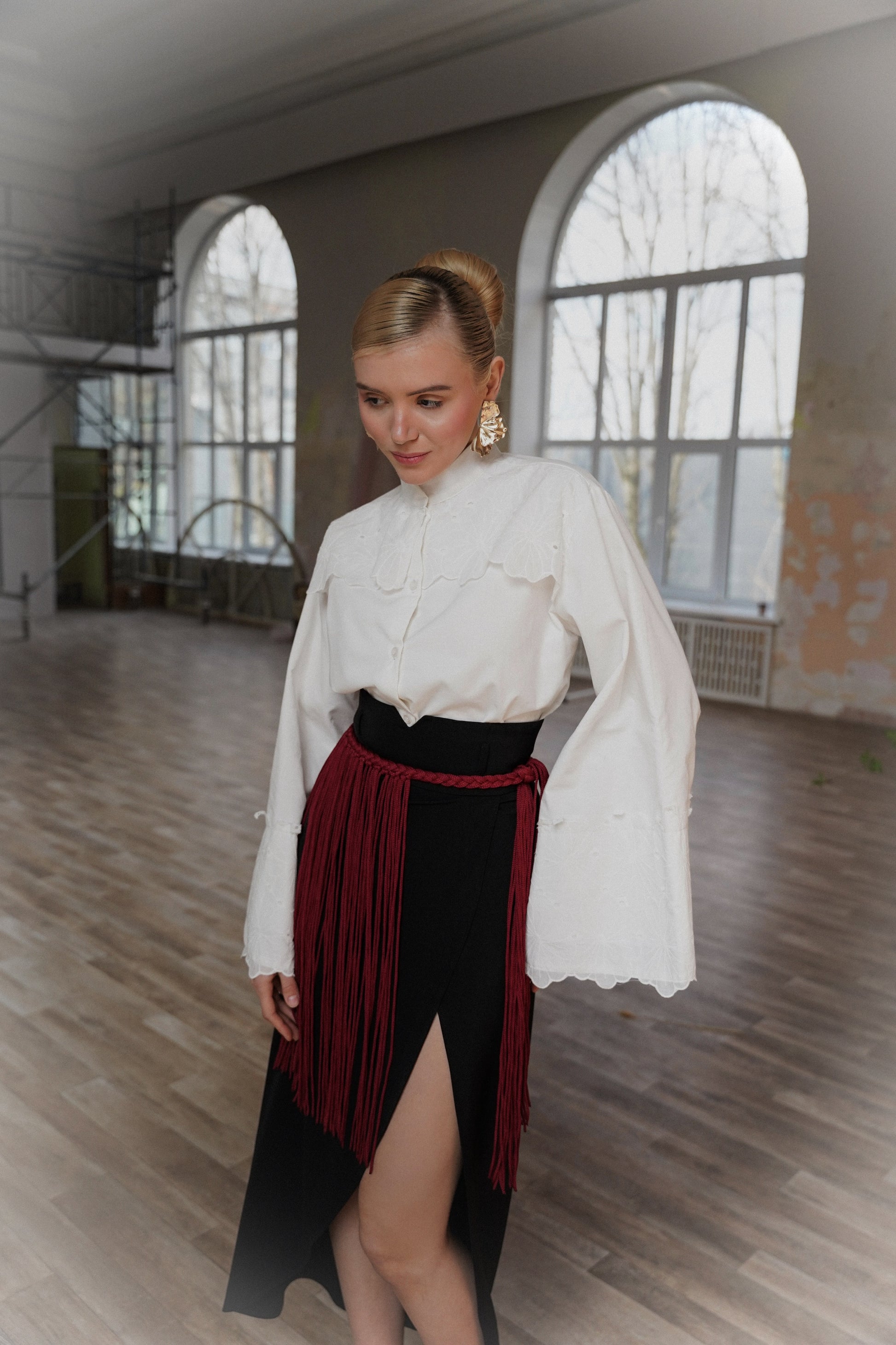 The skirt pairs perfectly with voluminous shirts, basic tops, or sophisticated jackets - depending on the mood and occasion. In the photo, it is shown in combination with a burgundy braided peplum with decorative threads - this element is added separately and allows you to change the mood of the look with one movement.