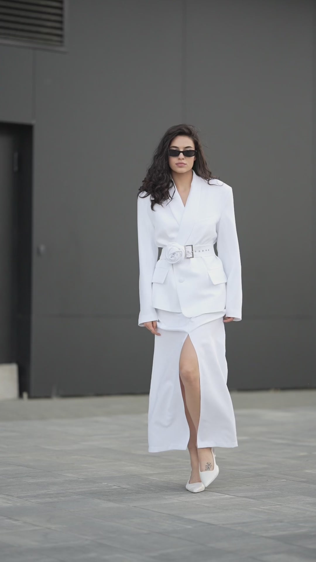 This white jacket is the epitome of a clean cut and a statement accent. Its sleek shape is complemented by a wide floral belt that defines the waist and adds personality to the look. The jacket has a versatile length, perfect for pairing with pants, skirts, or even dresses.