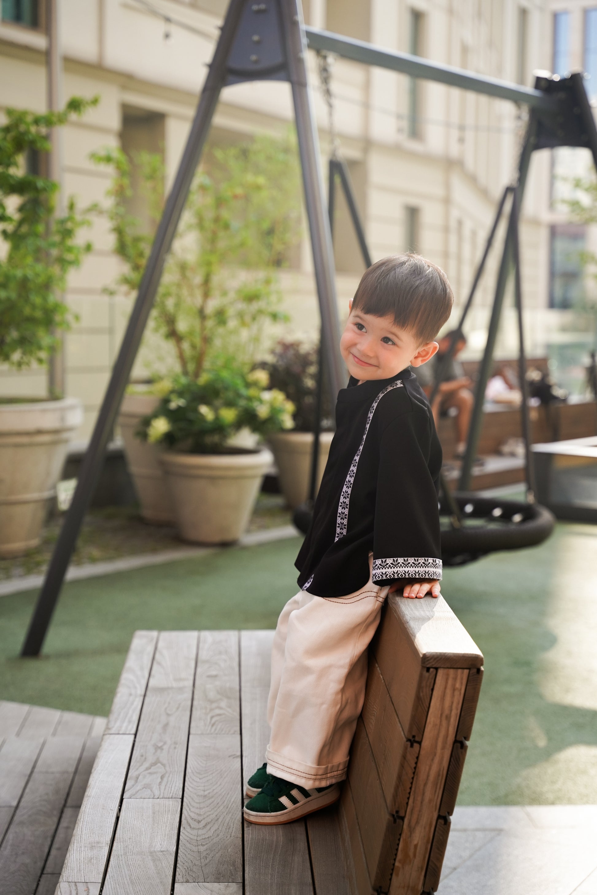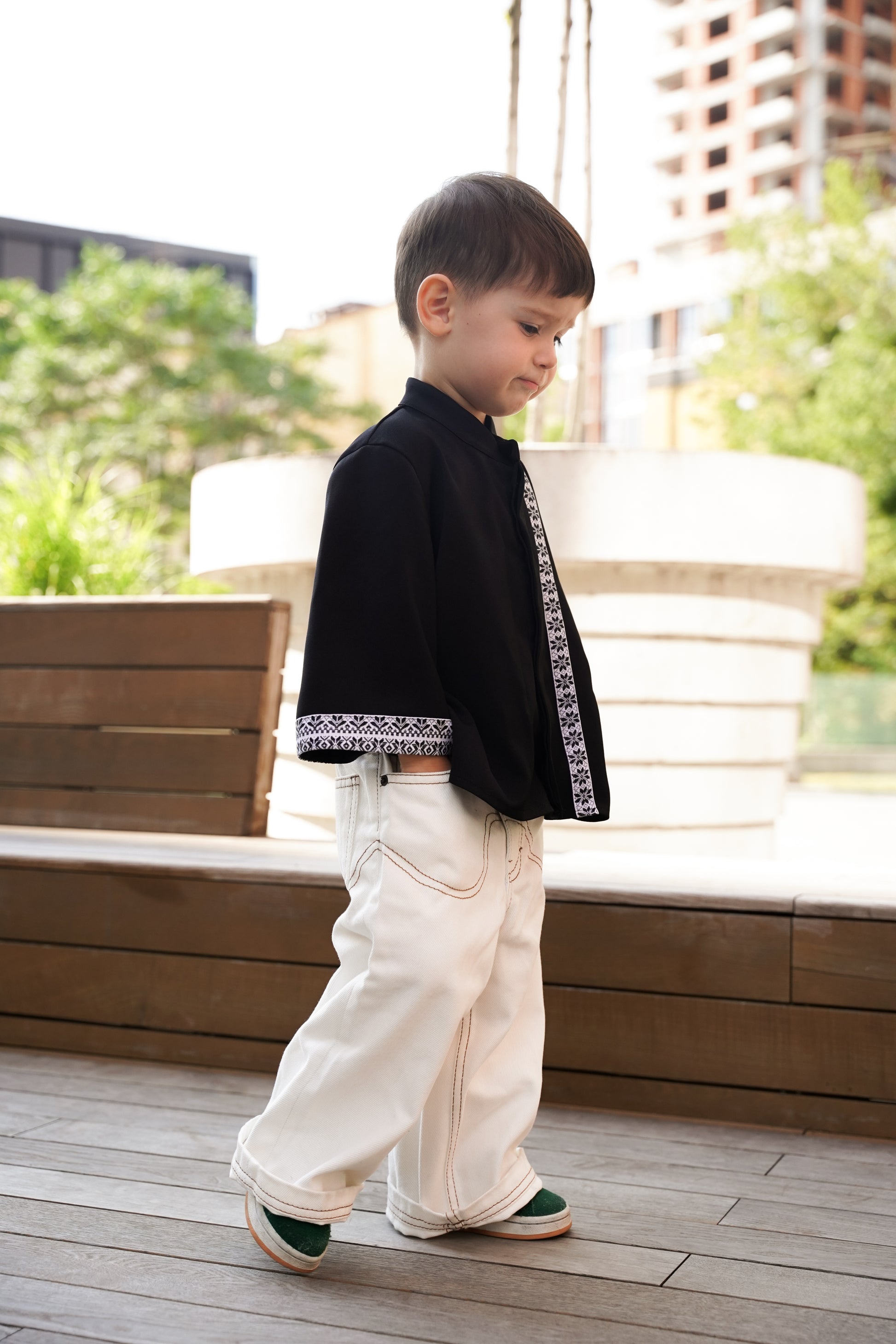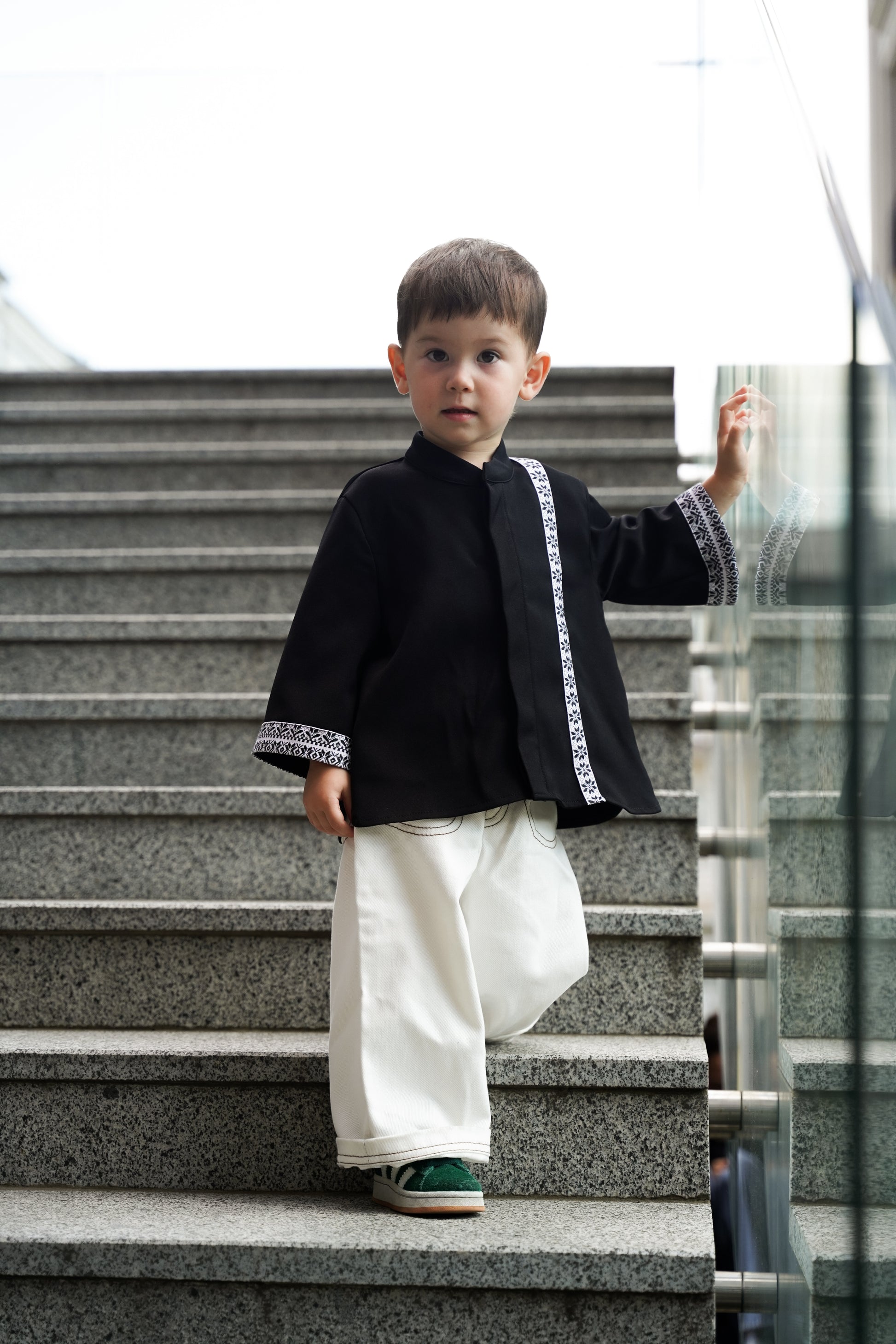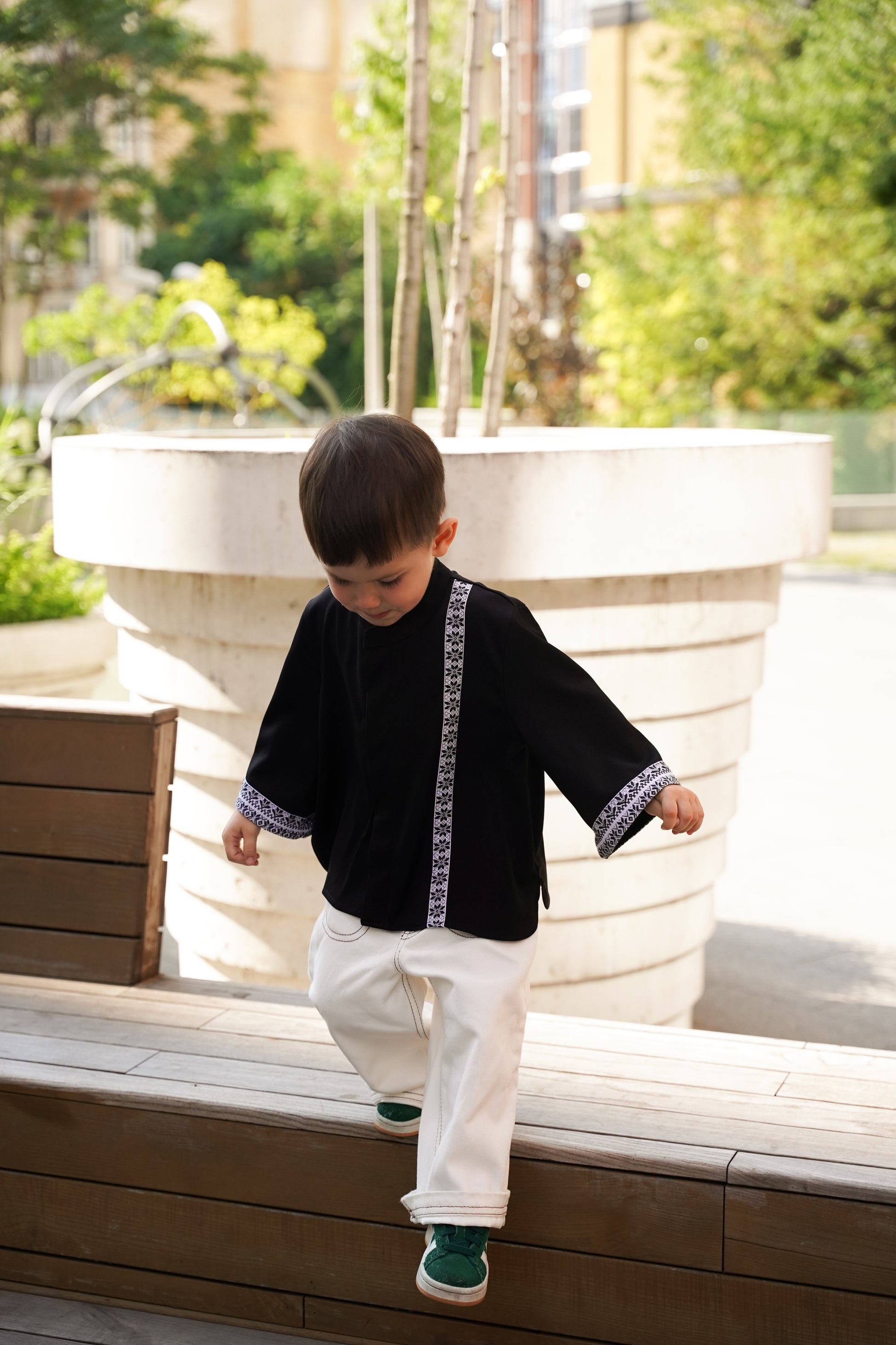 Це елегантне дитяче кімоно виконане у насиченому чорному кольорі з контрастною білою вишивкою вздовж планки та на манжетах. Лаконічний дизайн у поєднанні з традиційними елементами робить його універсальним варіантом як для святкових подій, так і для повсякденного носіння.