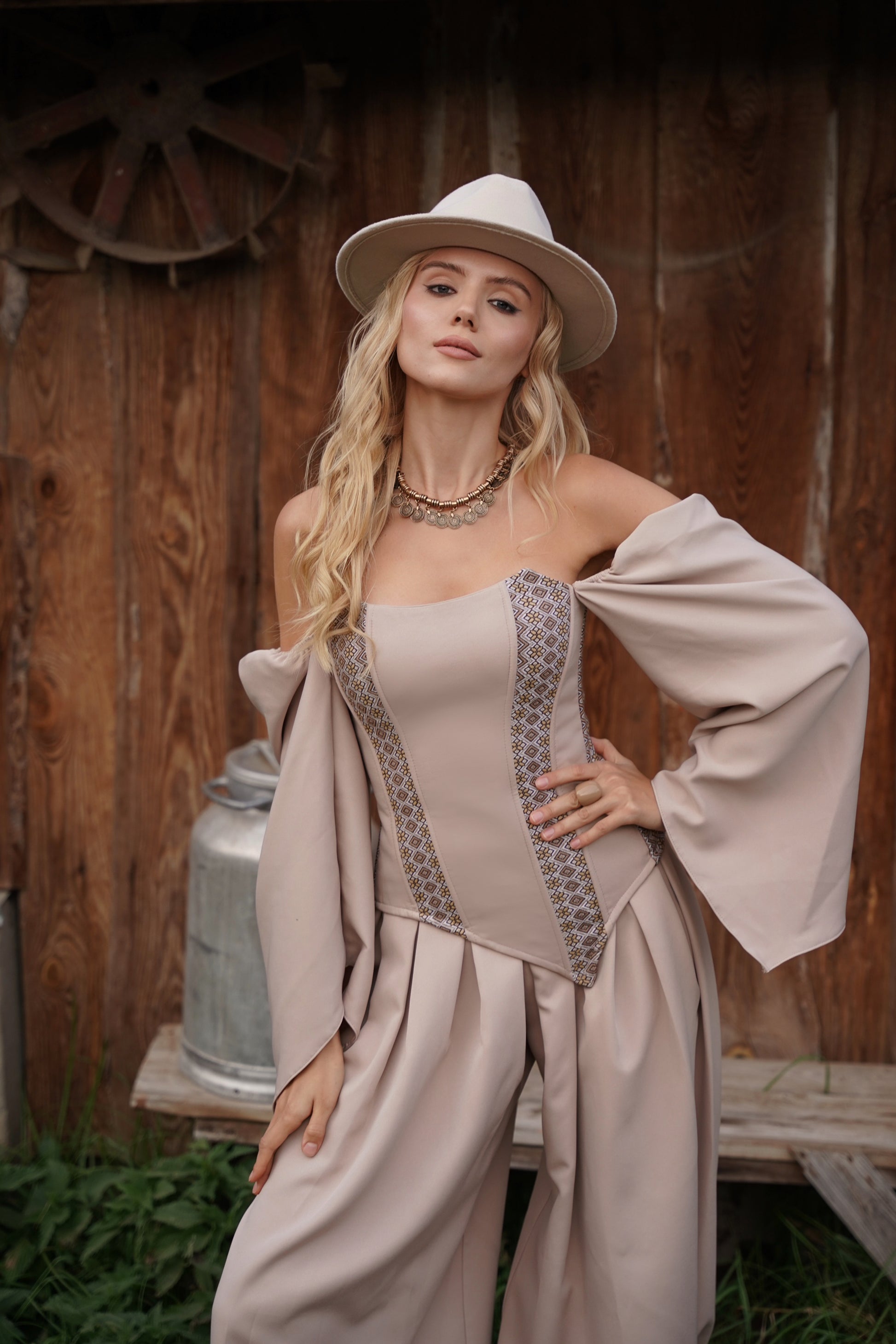 Корсет «Крила» - втілення елегантності та сучасного стилю. Він створений, щоб підкреслювати жіночність, формувати витончений силует і дарувати впевненість у власній красі. Завдяки поєднанню класичного крою та етнічних акцентів корсет легко інтегрується як у традиційні образи, так і в сучасні модні комплекти.