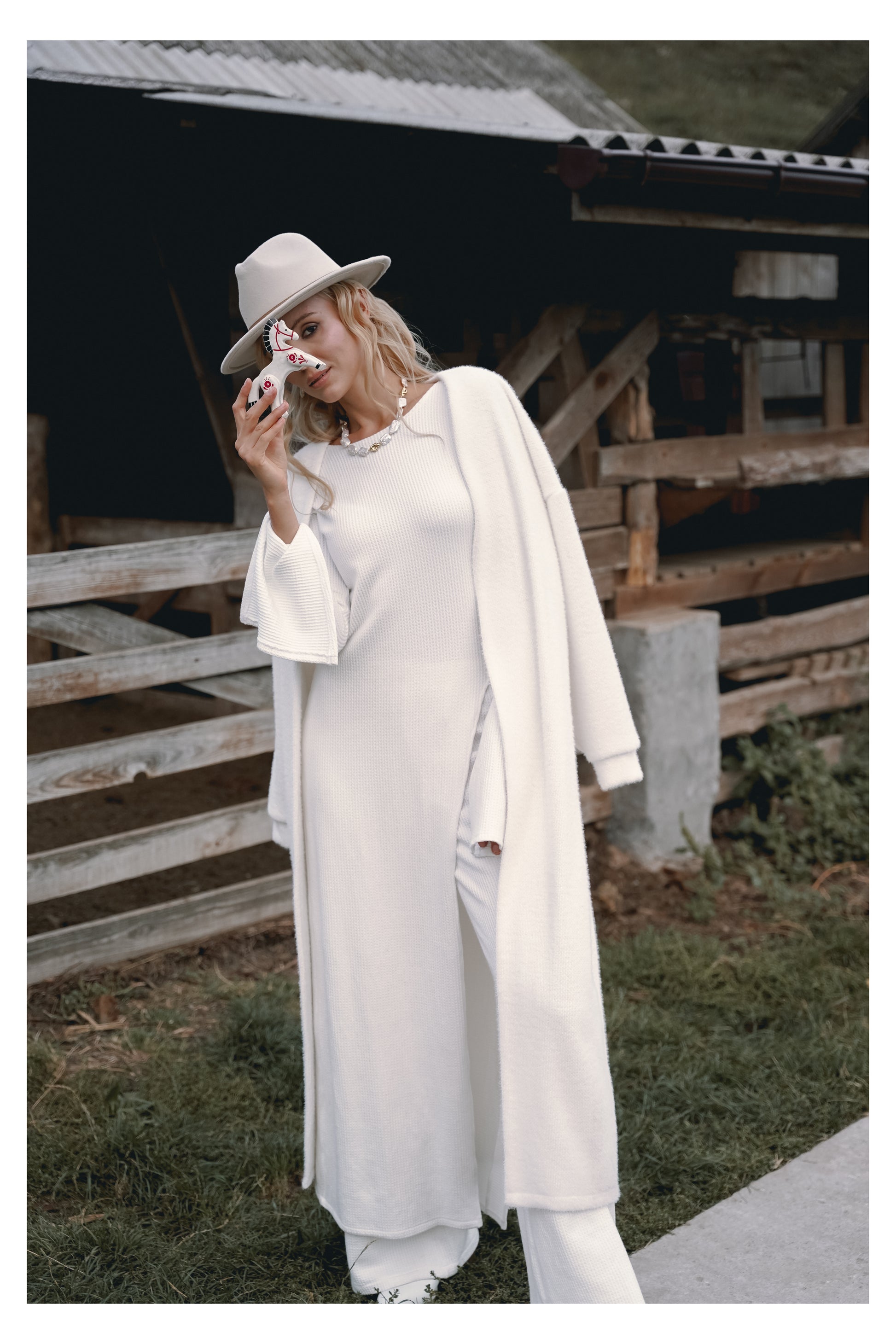 Стильний жіночий костюм у сучасному мінімалістичному виконанні - це вибір для жінки, яка цінує комфорт і елегантність одночасно. Подовжений фасон з розрізами з боків створює ефектний силует і додає образу свободи та впевненості. Вузький рукав із подовженою манжетою підкреслює витонченість, а м’яка фактурна тканина робить костюм особливо приємним у носінні.