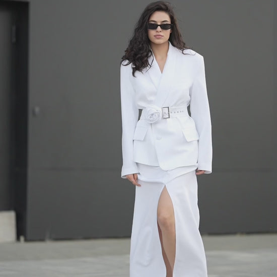 Цей жіночий костюм у білому кольорі - втілення сучасної елегантності. Ідеальна посадка, підкреслена талія та акцент у вигляді декоративного поясу-квітки роблять цей образ не просто вдалим вибором на подію, а справжньою заявою стилю. Комплект поєднує жіночність і силу, а білосніжний відтінок символізує впевненість і чистоту форм.