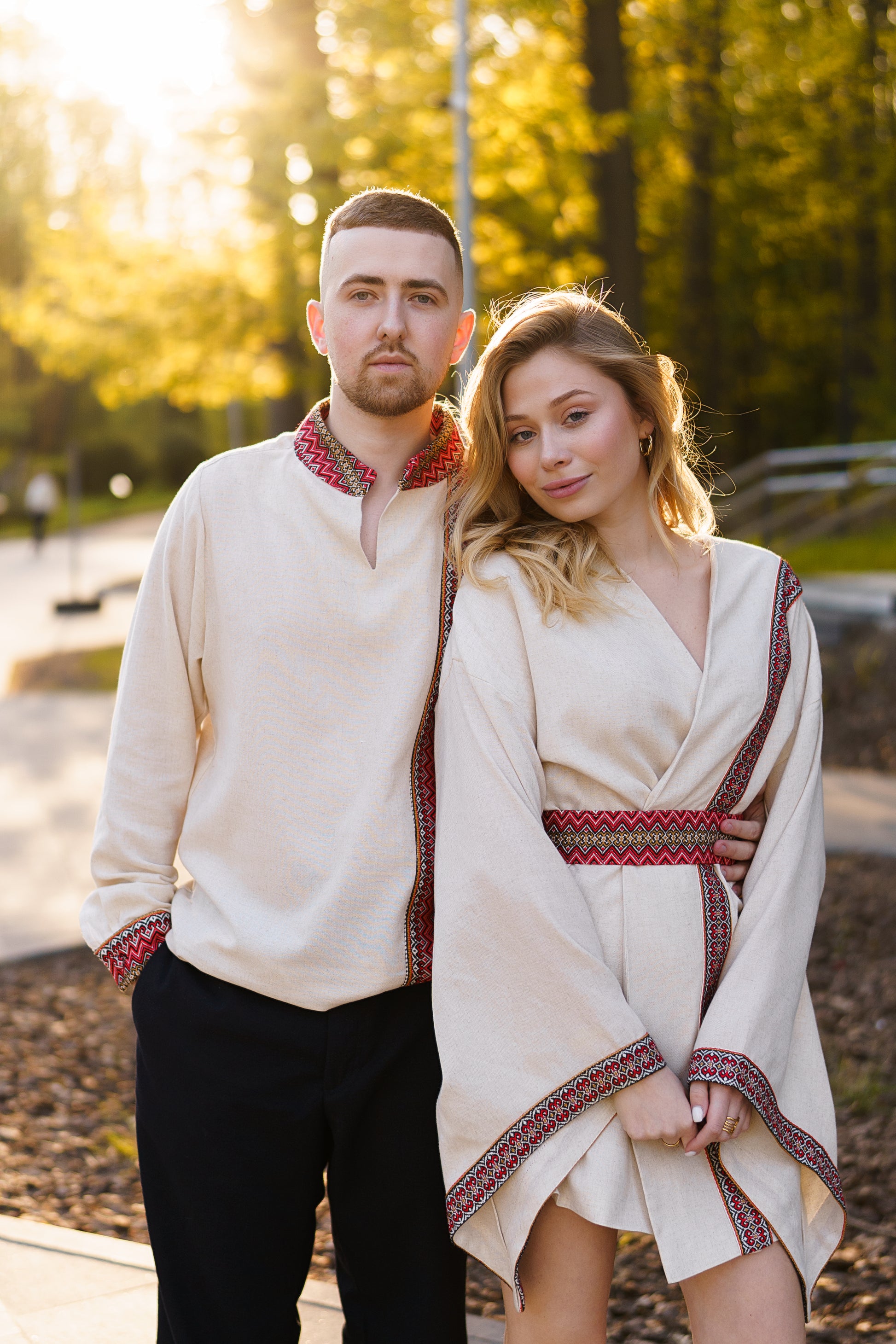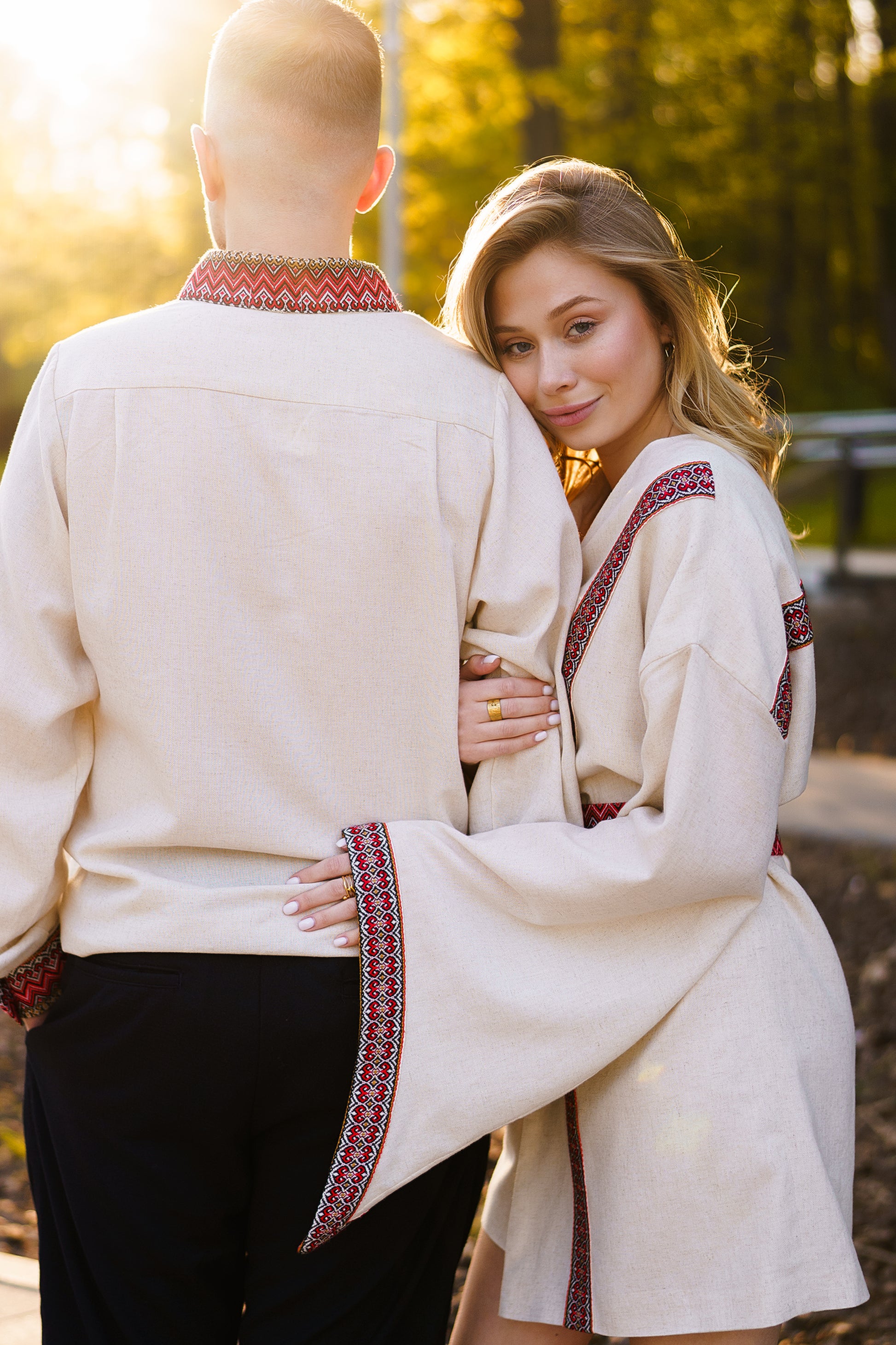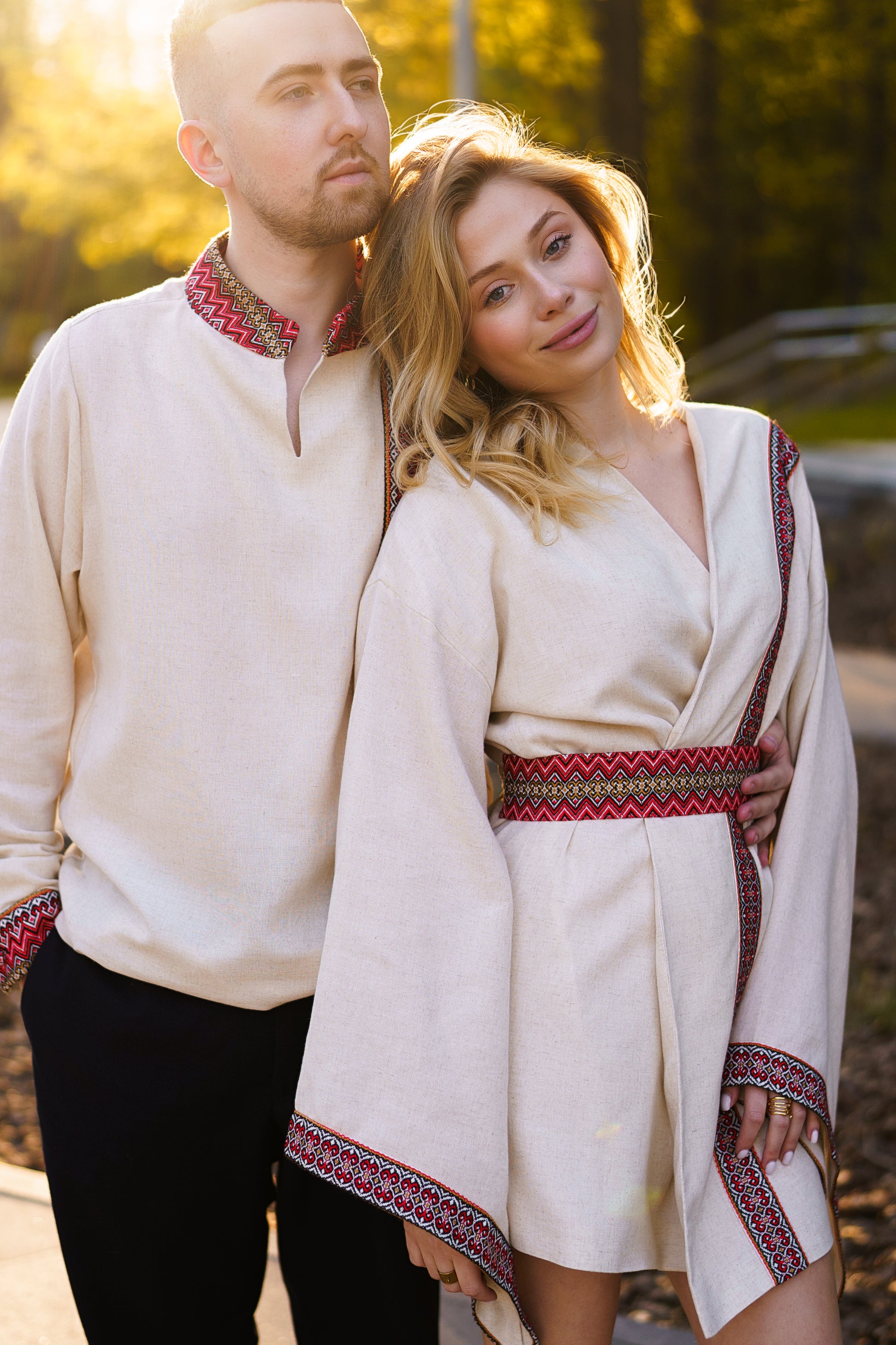 Чоловіча сорочка - зручна, стримана, з оздобленням коміра та манжетів. Жіноча сукня - коротка, із запахом, широкими рукавами та поясом з вишивкою, що підкреслює талію. Образ виглядає сучасно, але зберігає дух автентики.
