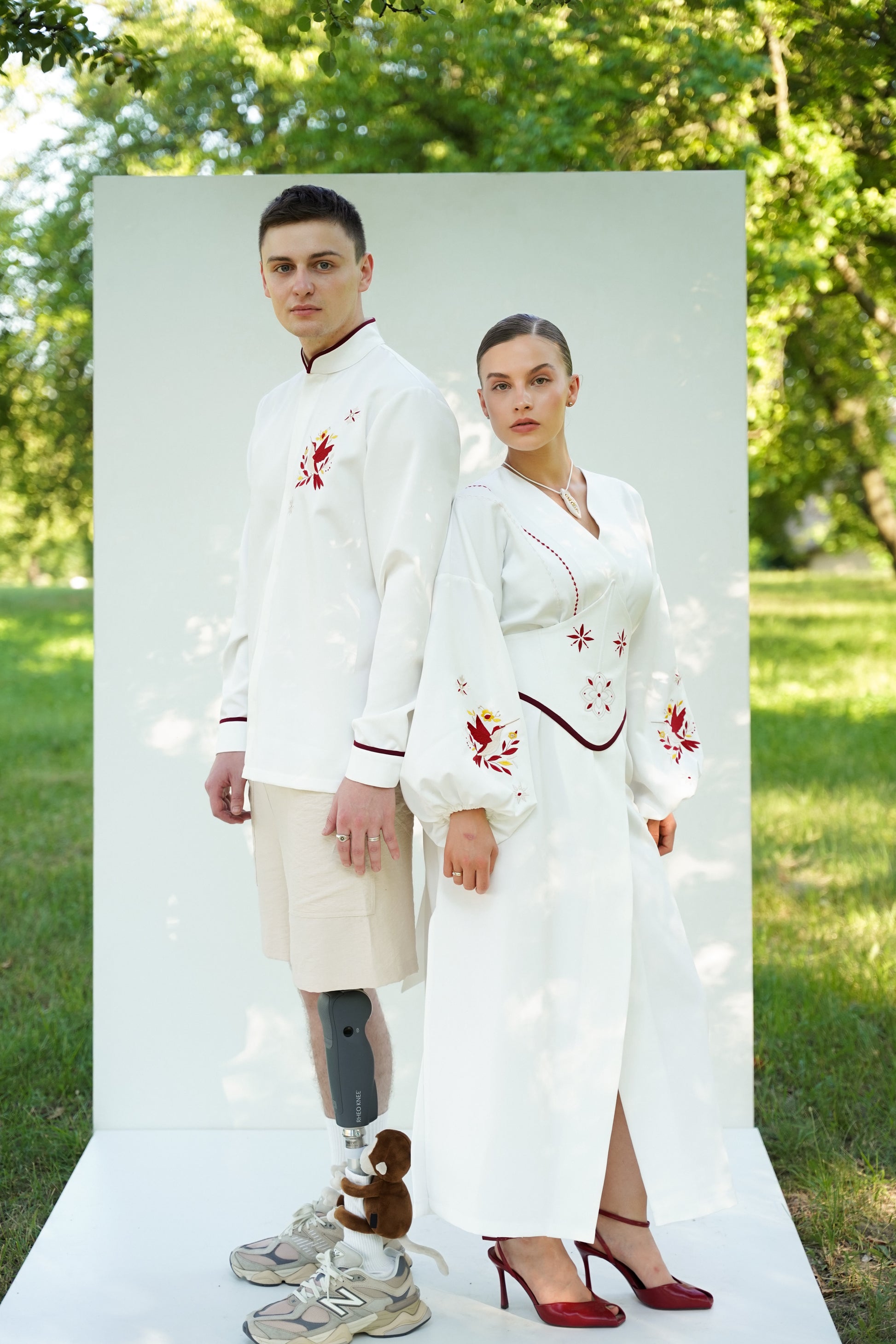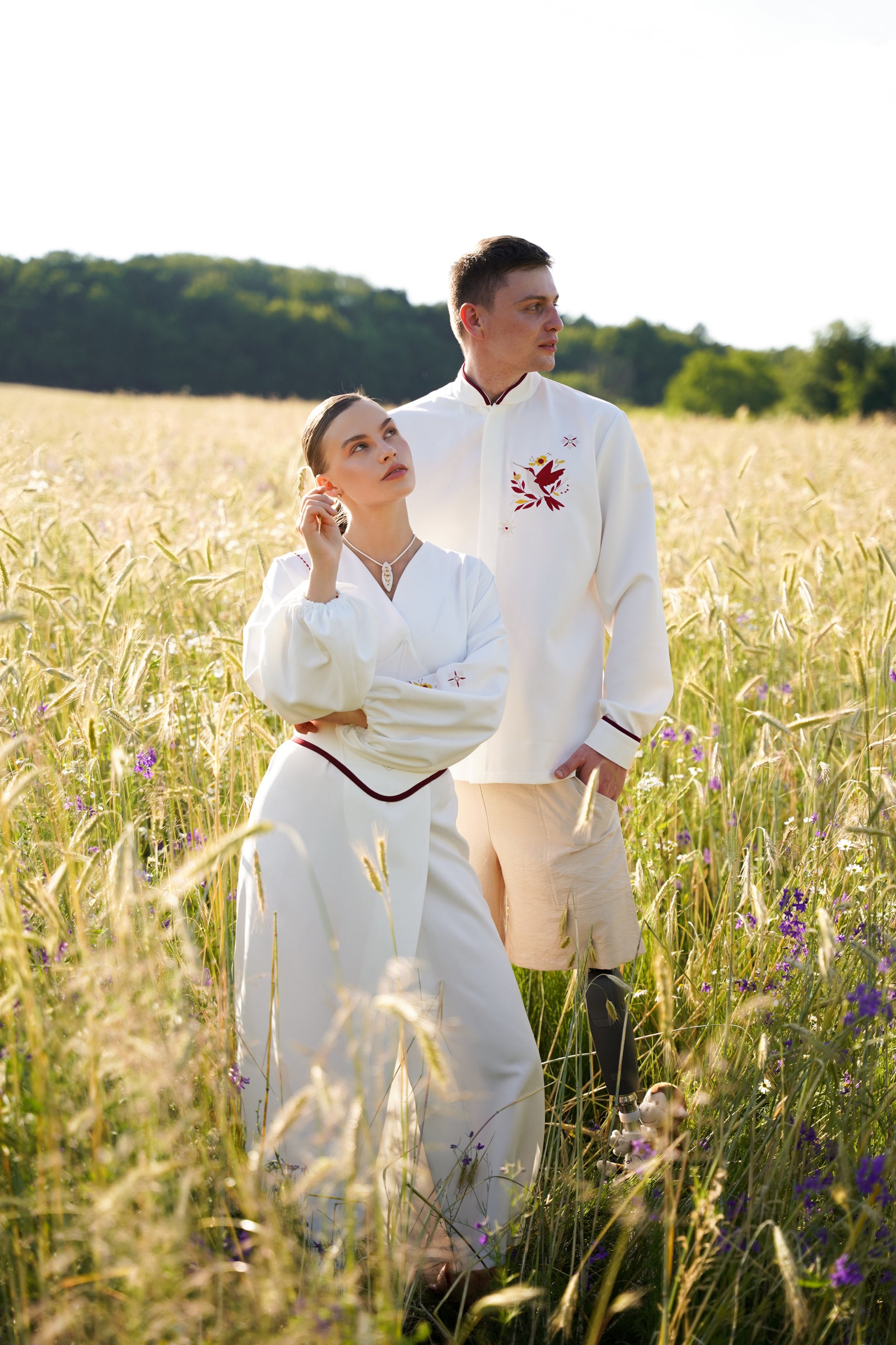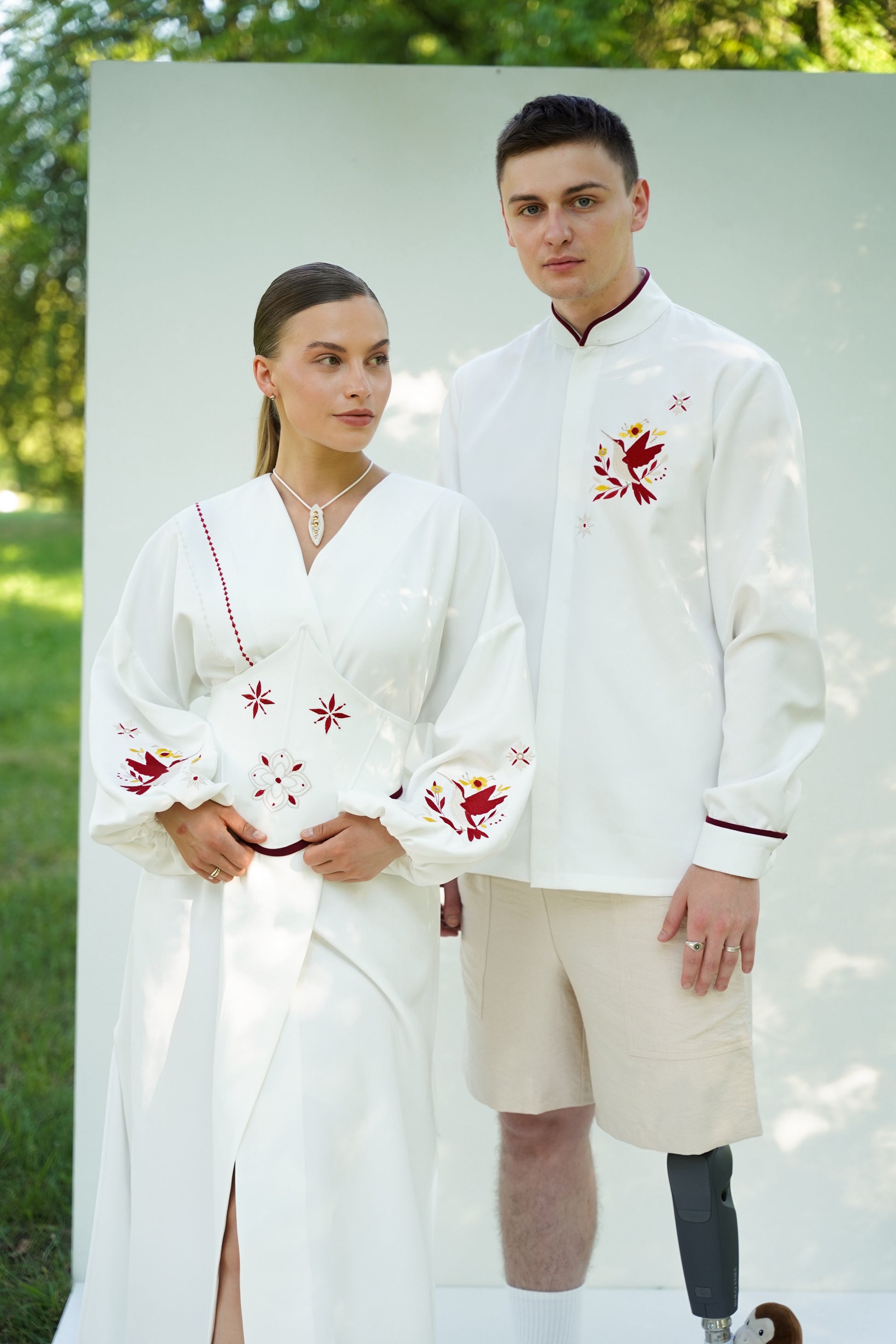 Цей комплект в етностилі створений для пар, які цінують національні символи, сучасну інтерпретацію вишивки та особливу атмосферу єдності. Вбрання прикрашене геометричним орнаментом, натхненним українською автентикою - кожен елемент вишивки несе глибокий зміст і силу оберегів.