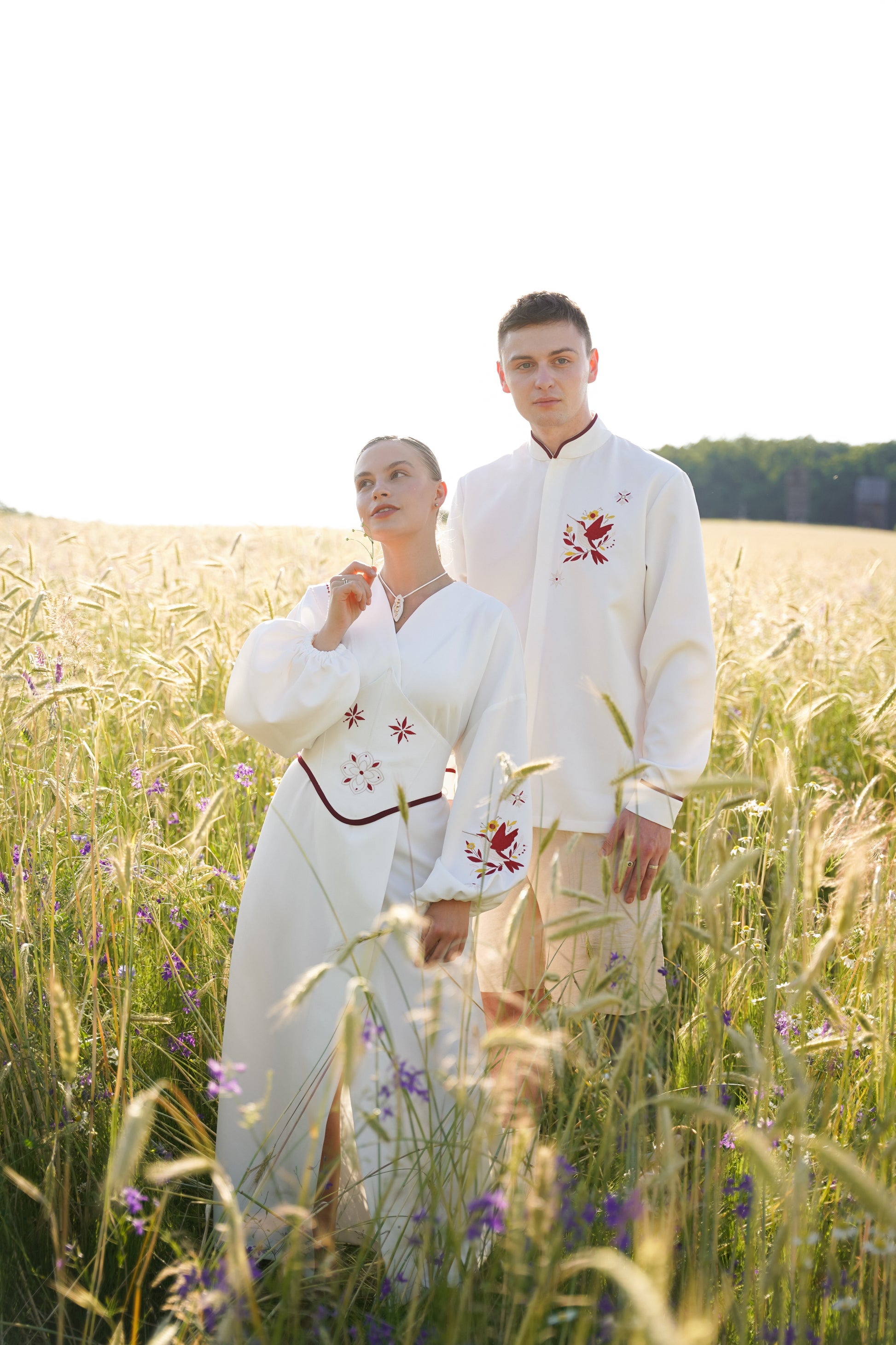Жіноча сукня вільного крою з поясом підкреслює фігуру, а вишиті рукави та оздоблений пояс додають вишуканості. Чоловіча сорочка у мінімалістичному стилі з акцентом на комірі та манжетах гармонійно доповнює образ пари.
