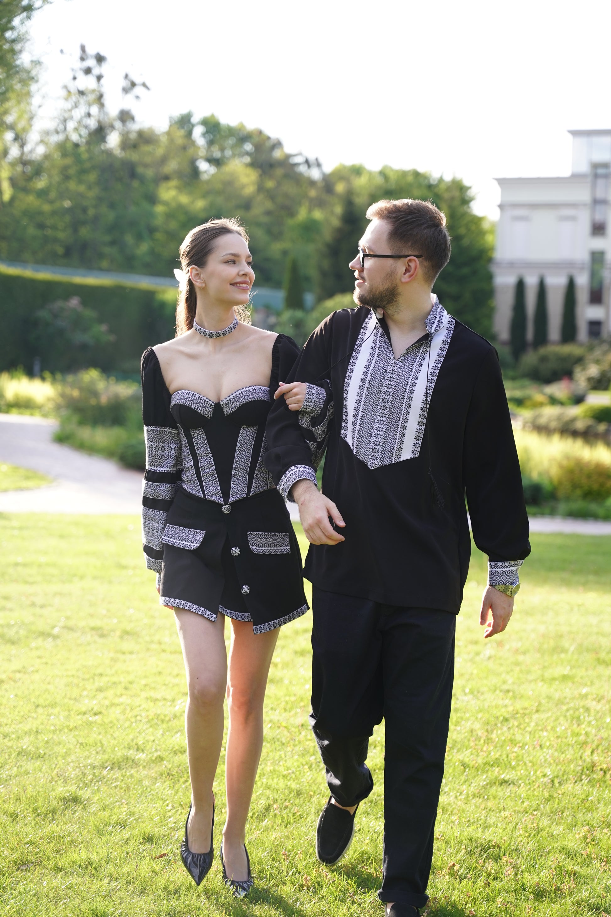 Чоловіча сорочка - зручна, стримана, з оздобленням коміра та манжетів. Жіноча сукня - коротка, із запахом, широкими рукавами та поясом з вишивкою, що підкреслює талію. Образ виглядає сучасно, але зберігає дух автентики.
