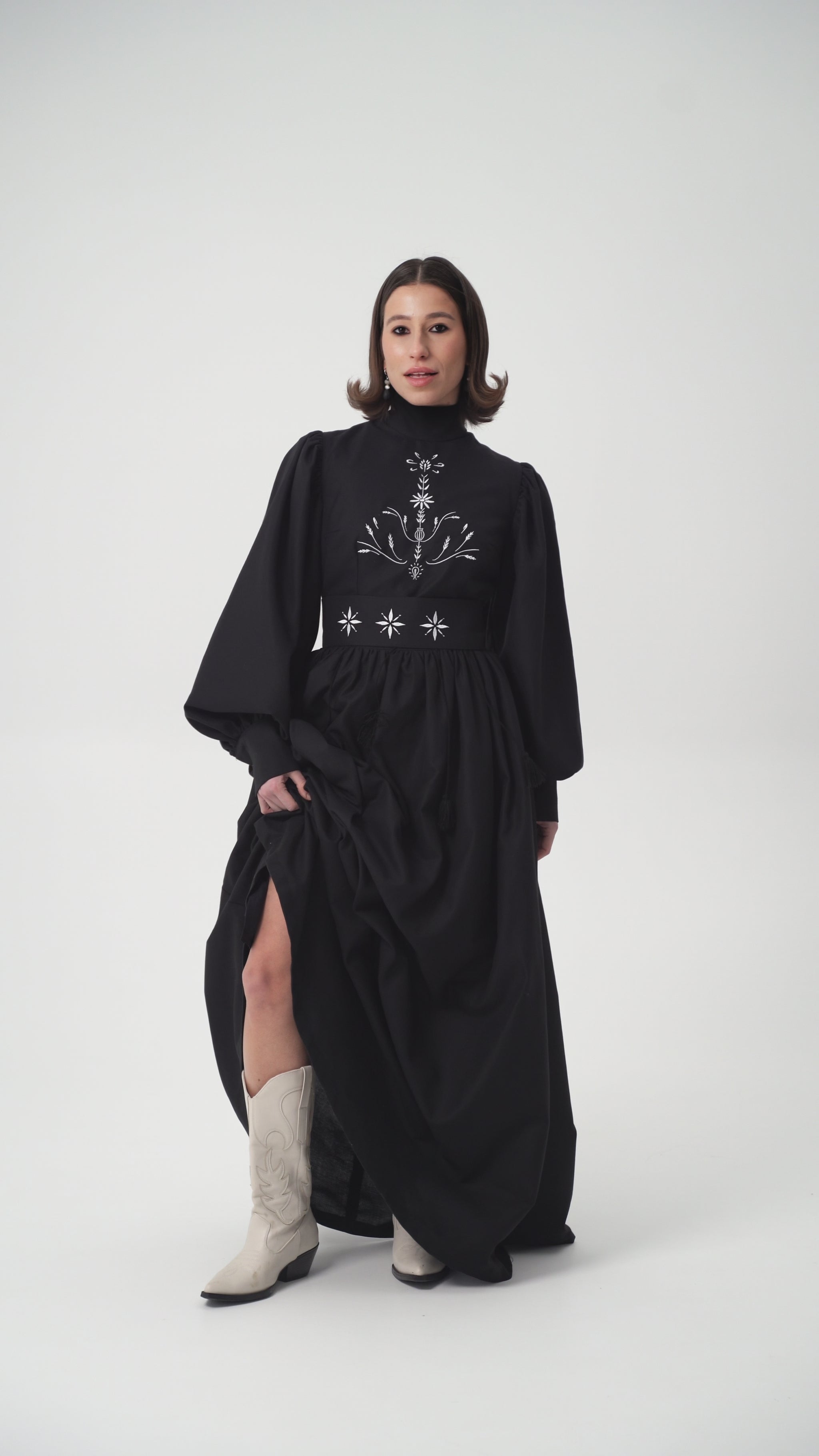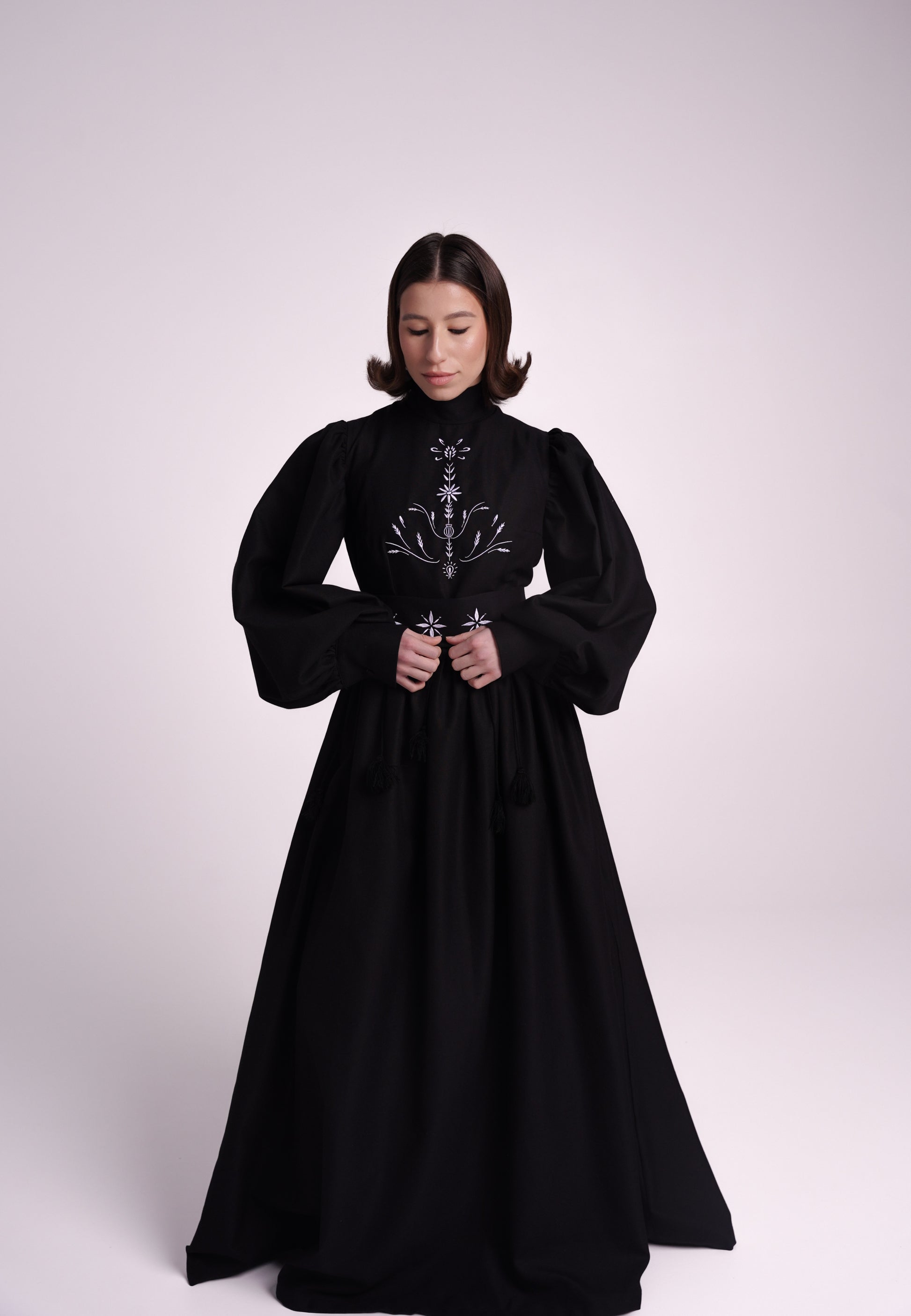 Сукня «Дерево життя» - це вишукане поєднання традиційних символів та сучасної елегантності. Орнамент на сукні має глибокий зміст: у верхній частині сяє знак-оберіг у формі зернини чи ока, що символізує світло та захист. У центрі розкривається квітка як образ життя, краси та гармонії, а над нею підноситься маківка - знак жіночності та пам’яті. Навколо квітки тягнуться колоски, що уособлюють родючість і достаток, а внизу в’ється хміль - символ молодості, любові та життєвої сили.