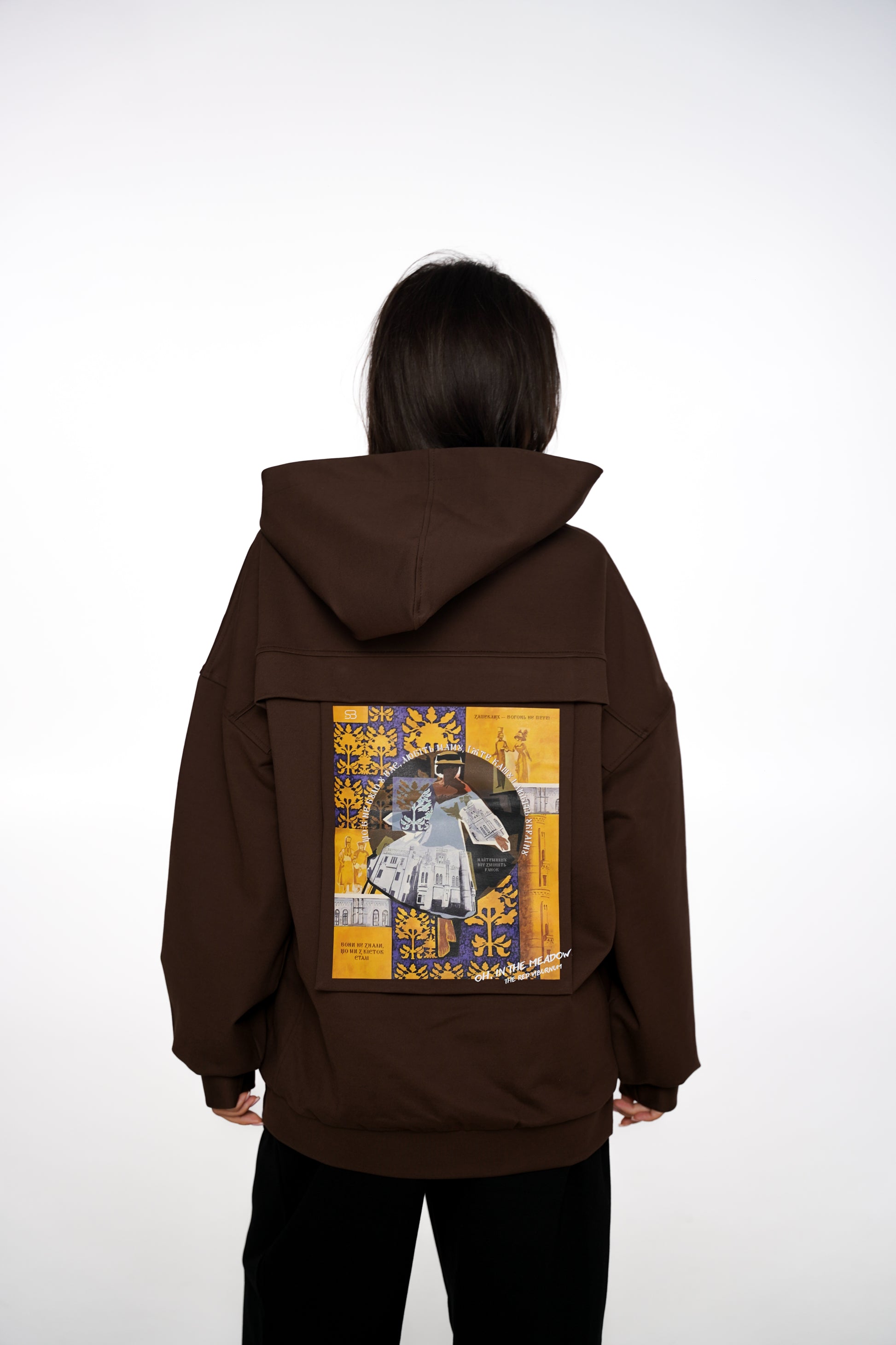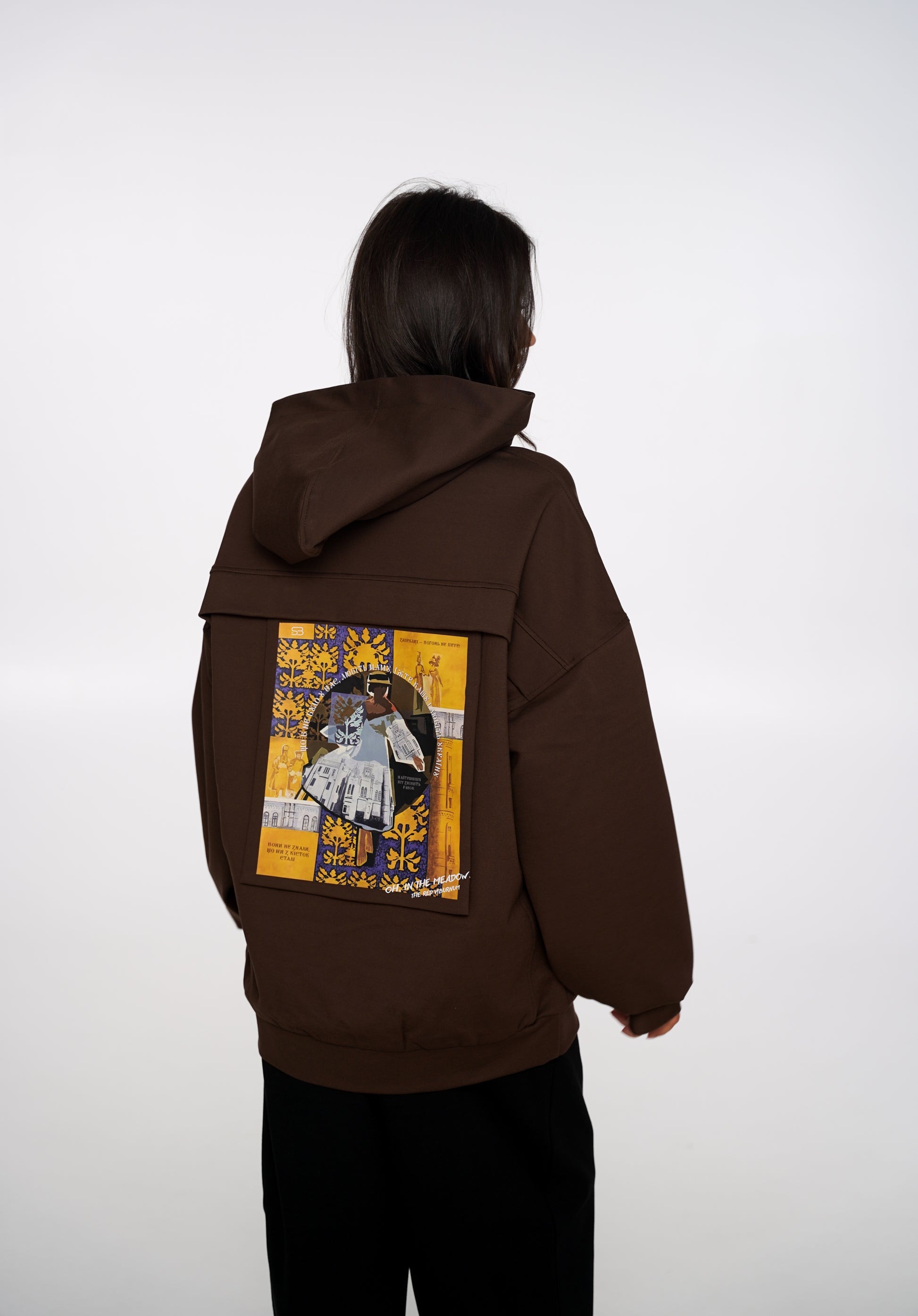 На худі зображена картина «Вільна Ненька», що вціліла під час ракетного удару. Її написала молода українська художниця.