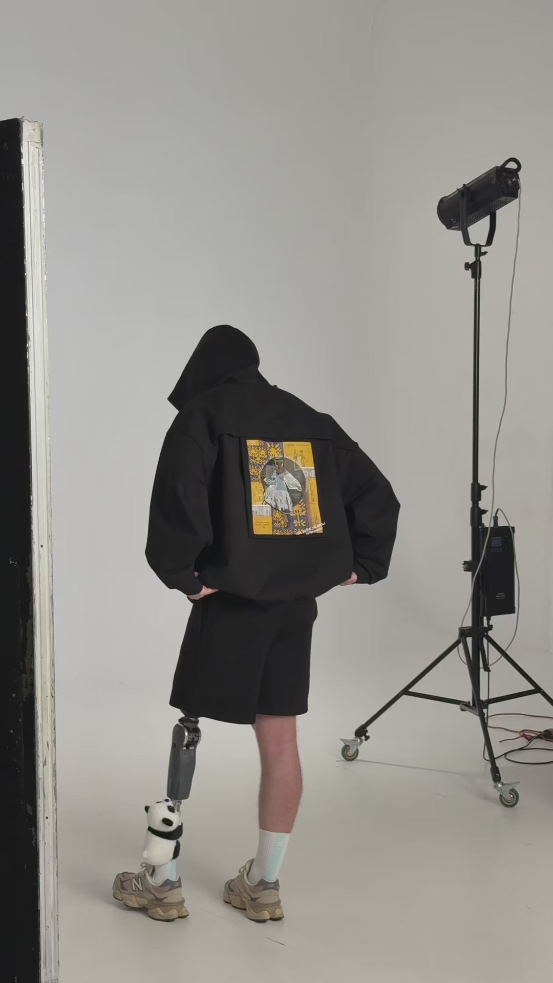 На худі зображена картина «Вільна Ненька», що вціліла під час ракетного удару. Її написала молода українська художниця.