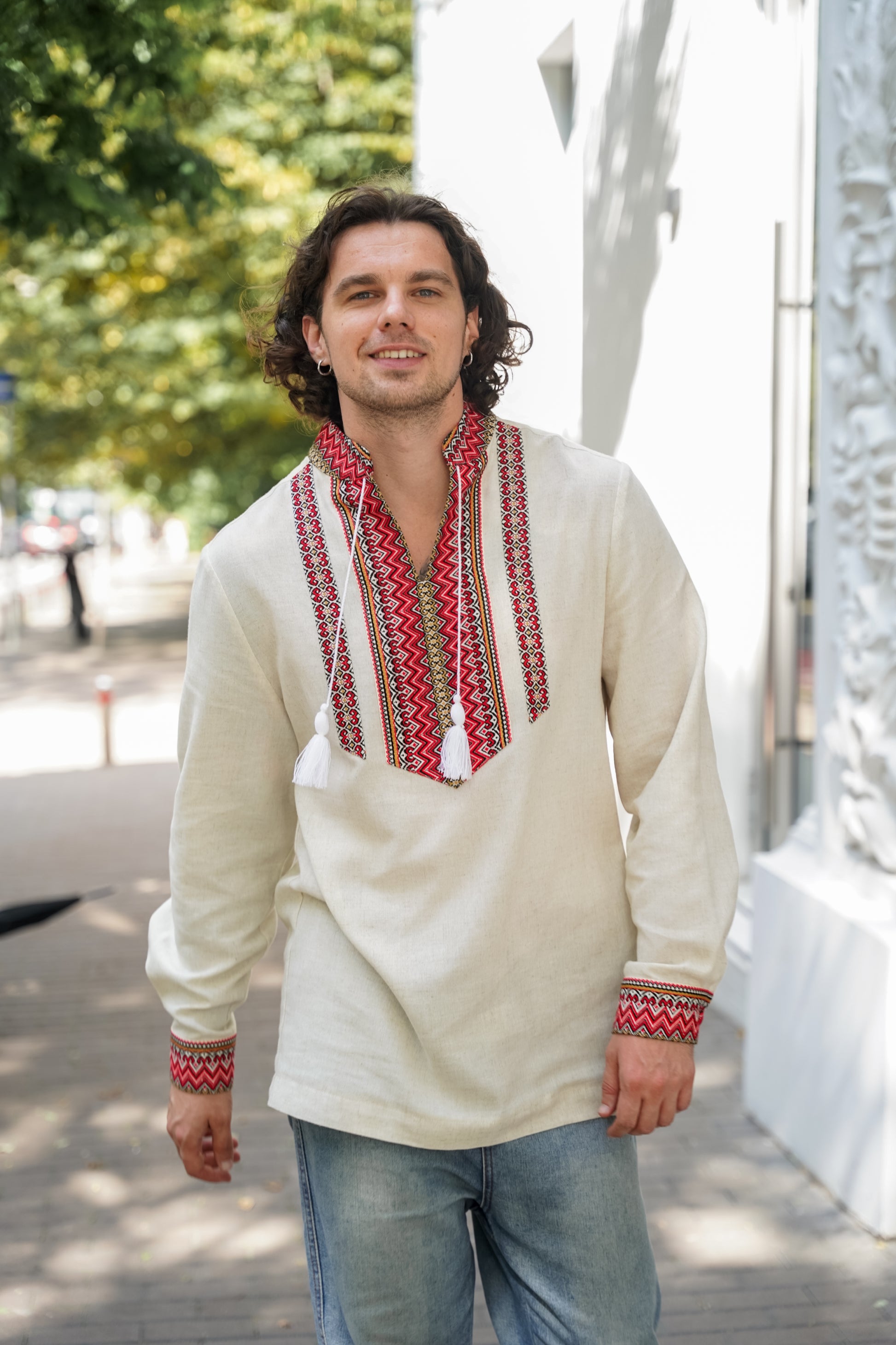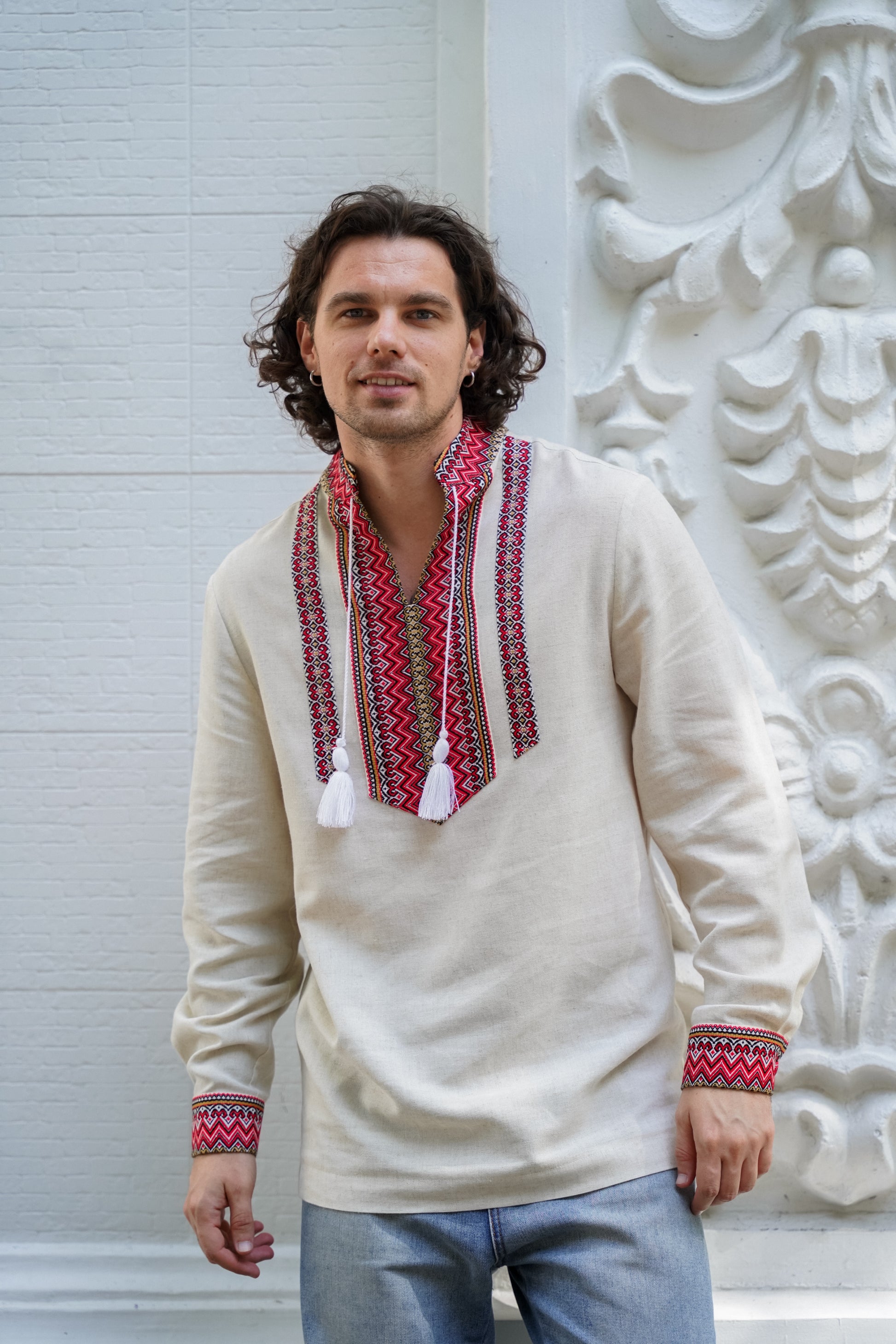 :Чоловіча молочна льняна вишиванка Спадок,червона вишивка
