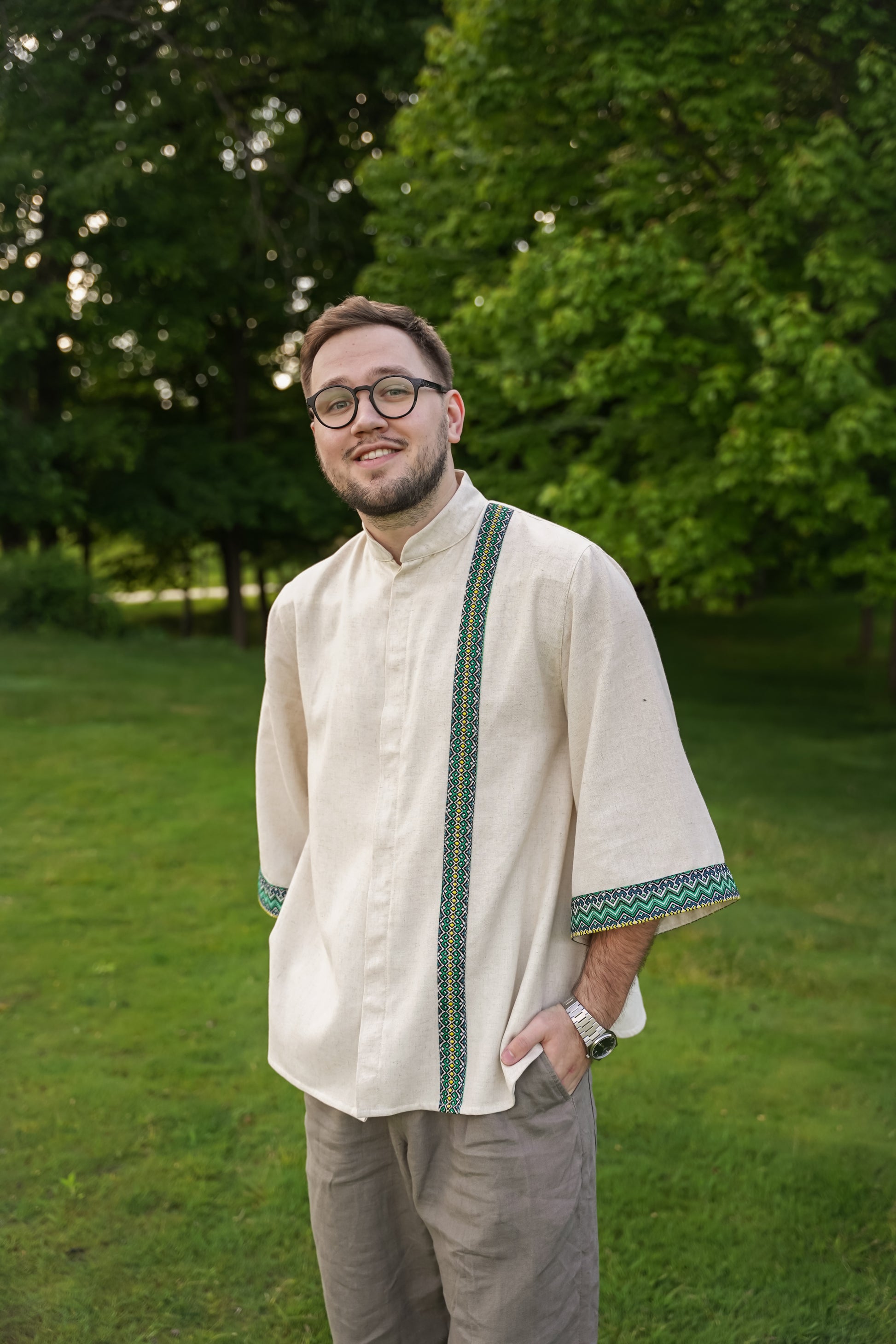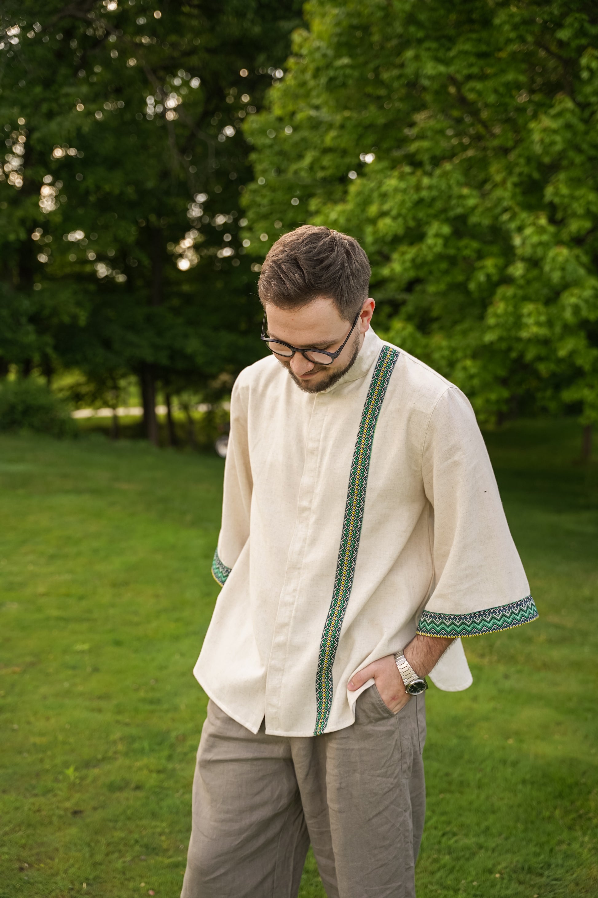 Це не просто сорочка - це чоловіче кімоно з етнічним акцентом, яке втілює баланс сучасної естетики й української спадщини. Крій - база - символ стриманої сили, а вишивка в етнічному стилі уздовж планки та на манжетах - це автентична деталь, що робить образ глибшим, змістовнішим і впізнаваним.