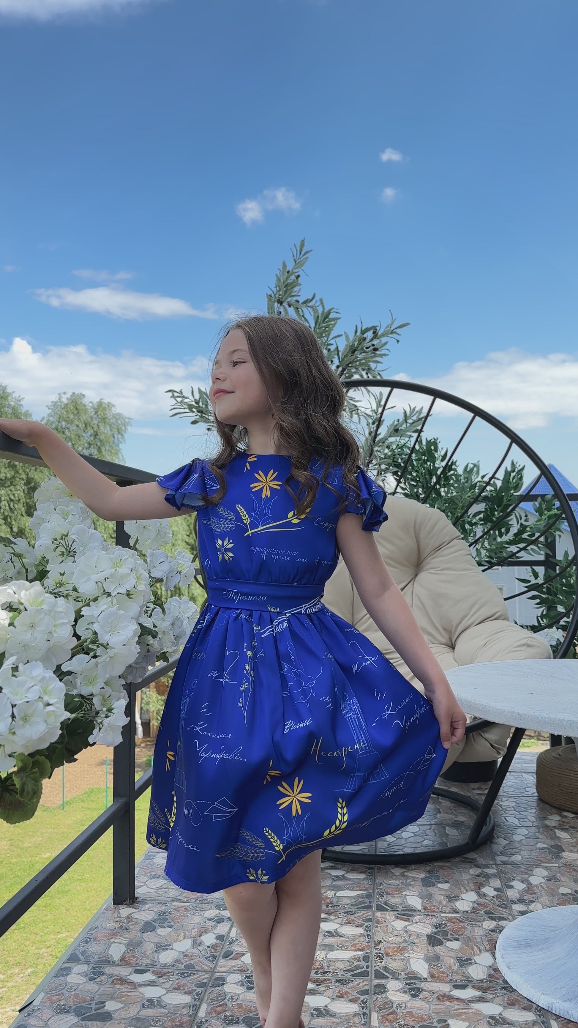 Ця дитяча сукня з патріотичним принтом створена для маленьких модниць, які хочуть виглядати красиво й почуватися зручно. Глибокий синій відтінок доповнений авторським друком з українськими словами та символами – квітами, колосками, птахами, які уособлюють ніжність, силу та любов до рідної землі.