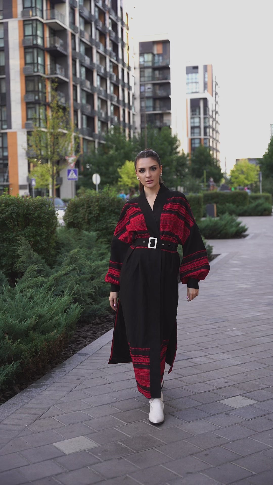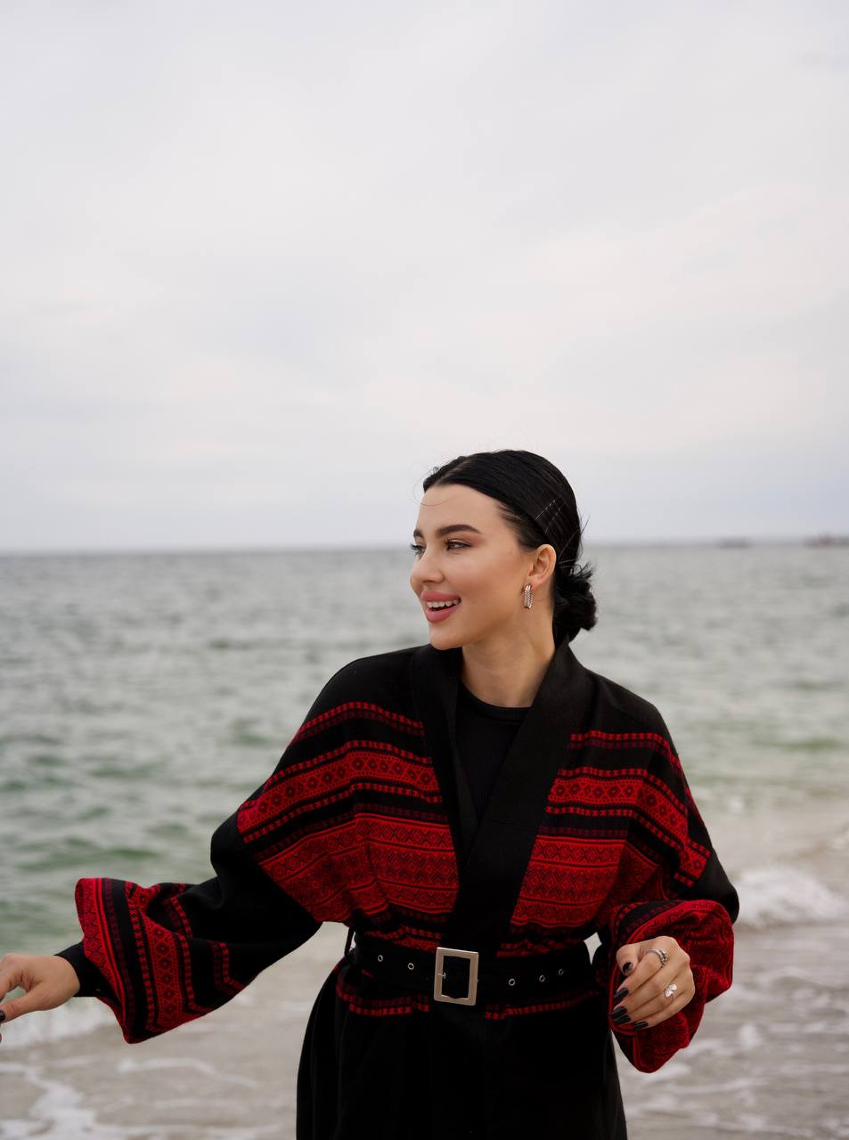 Особливий акцент - на вишивці у традиційному стилі. Глибокий чорний колір у поєднанні з насиченим червоним створює сильний, візуально незабутній контраст. Широкі рукави та пасок з акцентною пряжкою додають кімоно благородства й витонченості.