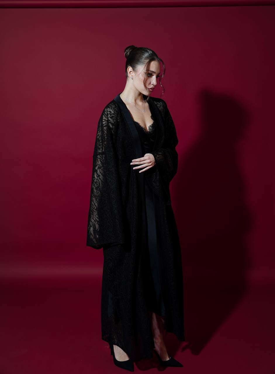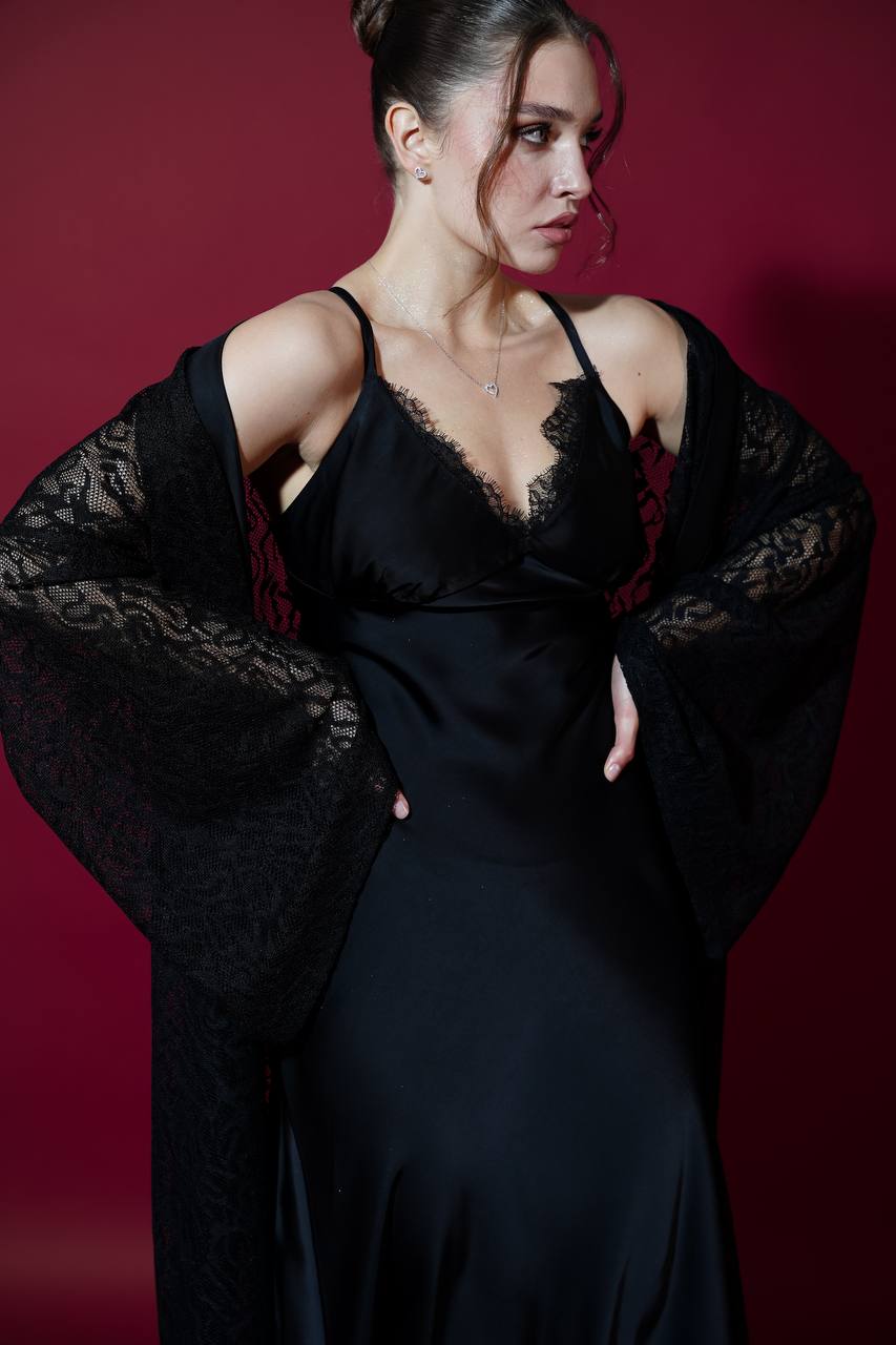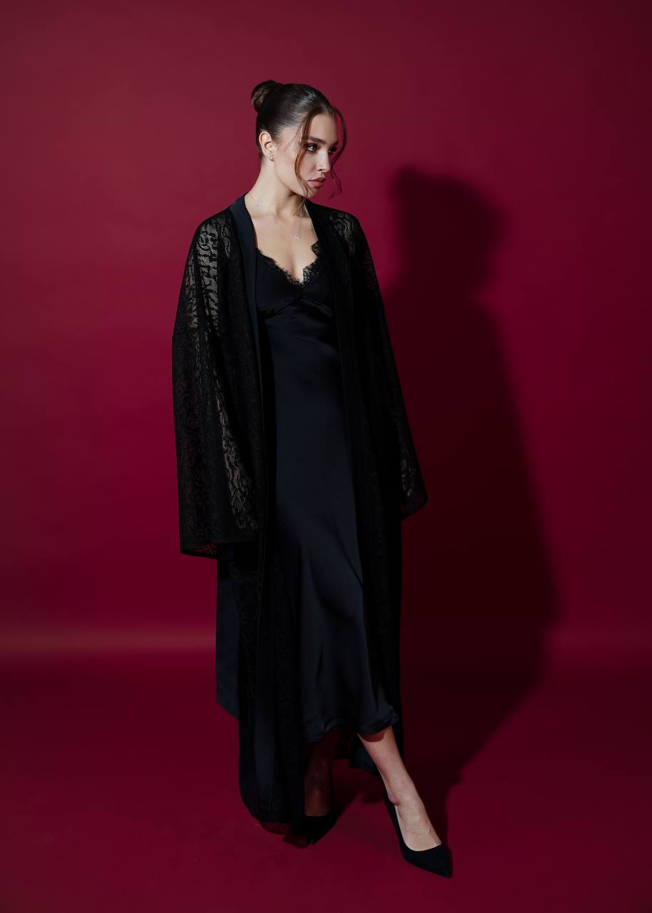 Легке, повітряне й візуально ефектне - це кімоно створене, щоб додати образу глибини та настрою. Широкі рукави з прозорого мережива роблять силует м’яким і вишуканим, а лаконічний крій дозволяє накидати його на будь-який одяг - від сукні-комбінації до білизни чи брючного костюма.