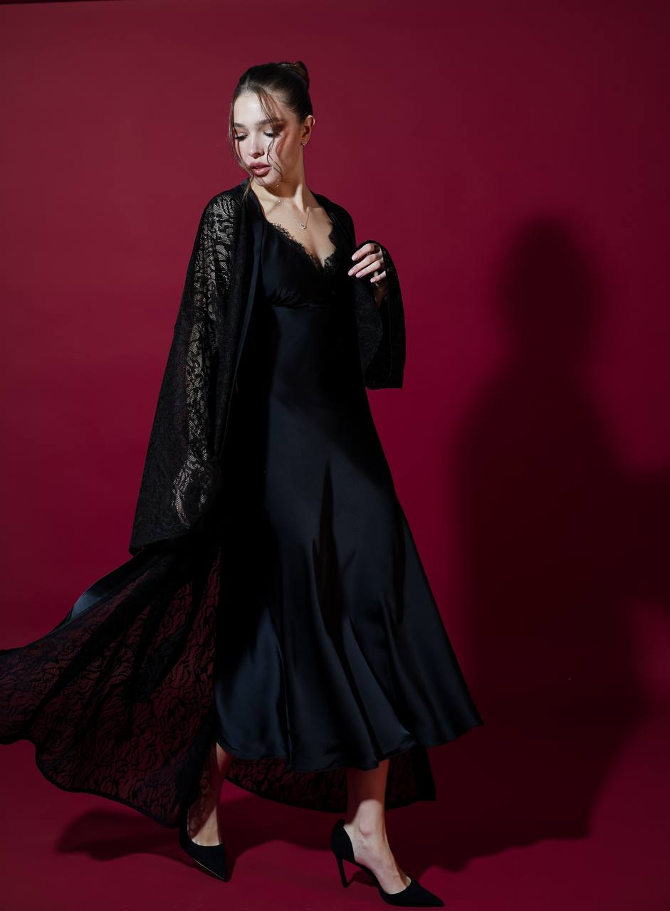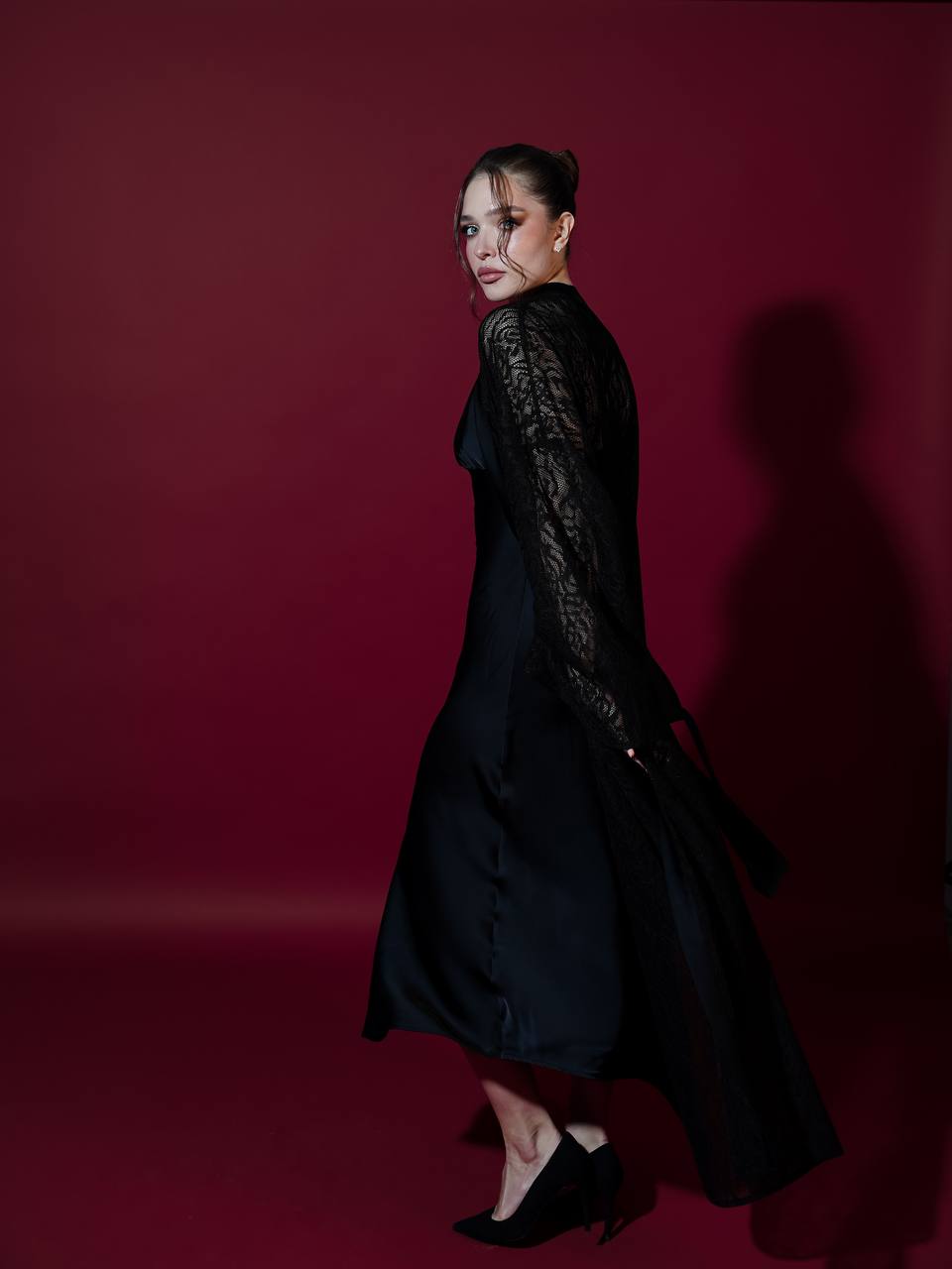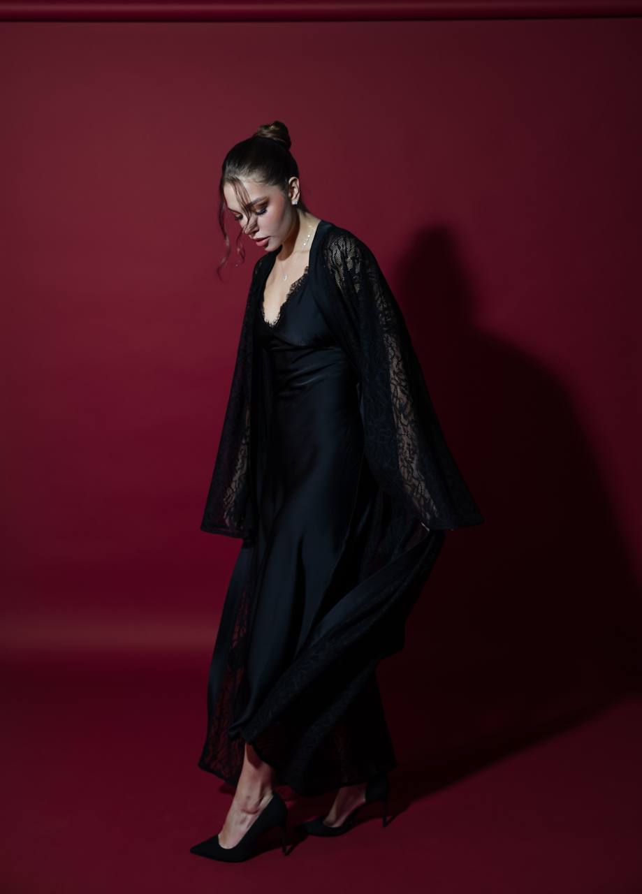 Легке, повітряне й візуально ефектне - це кімоно створене, щоб додати образу глибини та настрою. Широкі рукави з прозорого мережива роблять силует м’яким і вишуканим, а лаконічний крій дозволяє накидати його на будь-який одяг - від сукні-комбінації до білизни чи брючного костюма.