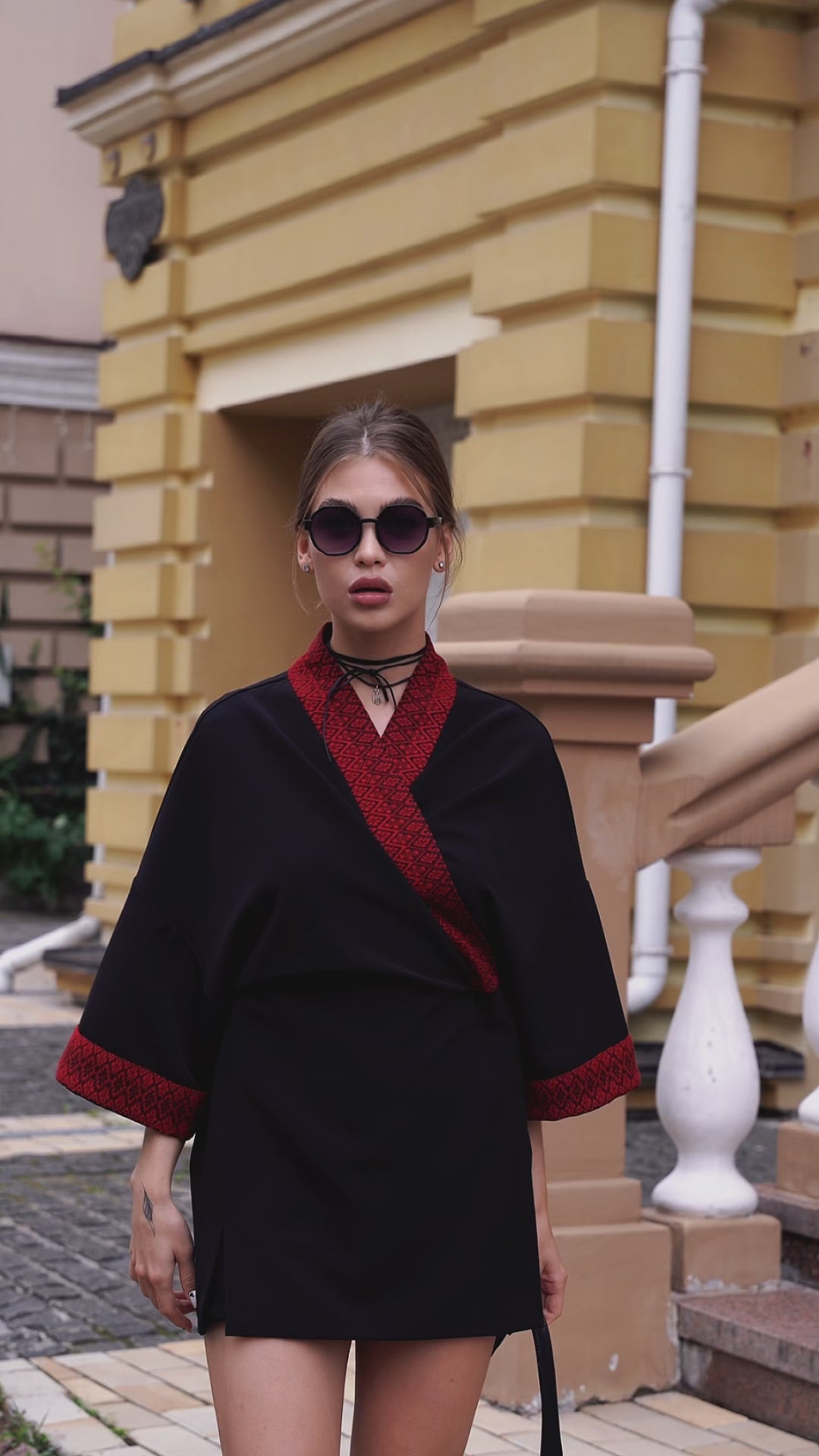 Це чорне кімоно з червоним орнаментом -вдале поєднання стриманої елегантності та глибокої символіки. У кожній деталі — сила традиції та впевнена сучасність. Акцентна вишивка з геометричним орнаментом уздовж борту, манжетів і пояса перетворює кімоно на справжній витвір мистецтва, який розповідає історію без слів.