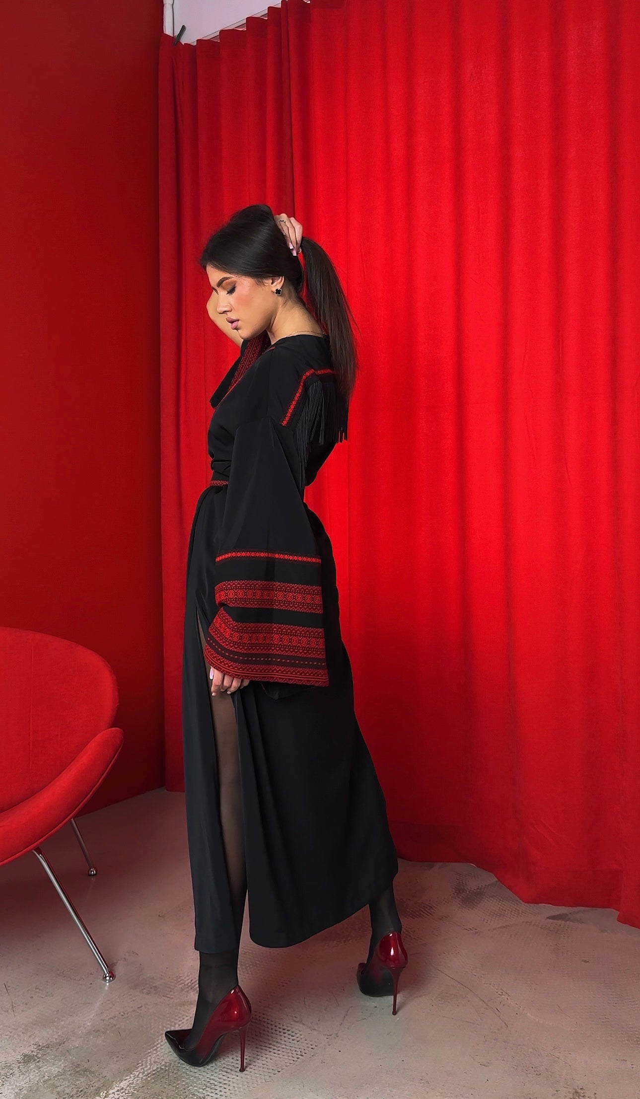 Це кімоно - не просто одяг, а справжня заява про стиль. Глибокий чорний колір, акценти у вигляді червоної вишивки та делікатна бахрома на грудях створюють унікальний баланс між традиційними мотивами та модною драматичністю. Широкі рукави, акцентований пояс із вишитим орнаментом і мʼякий перелив тканини роблять силует елегантним і впевненим.