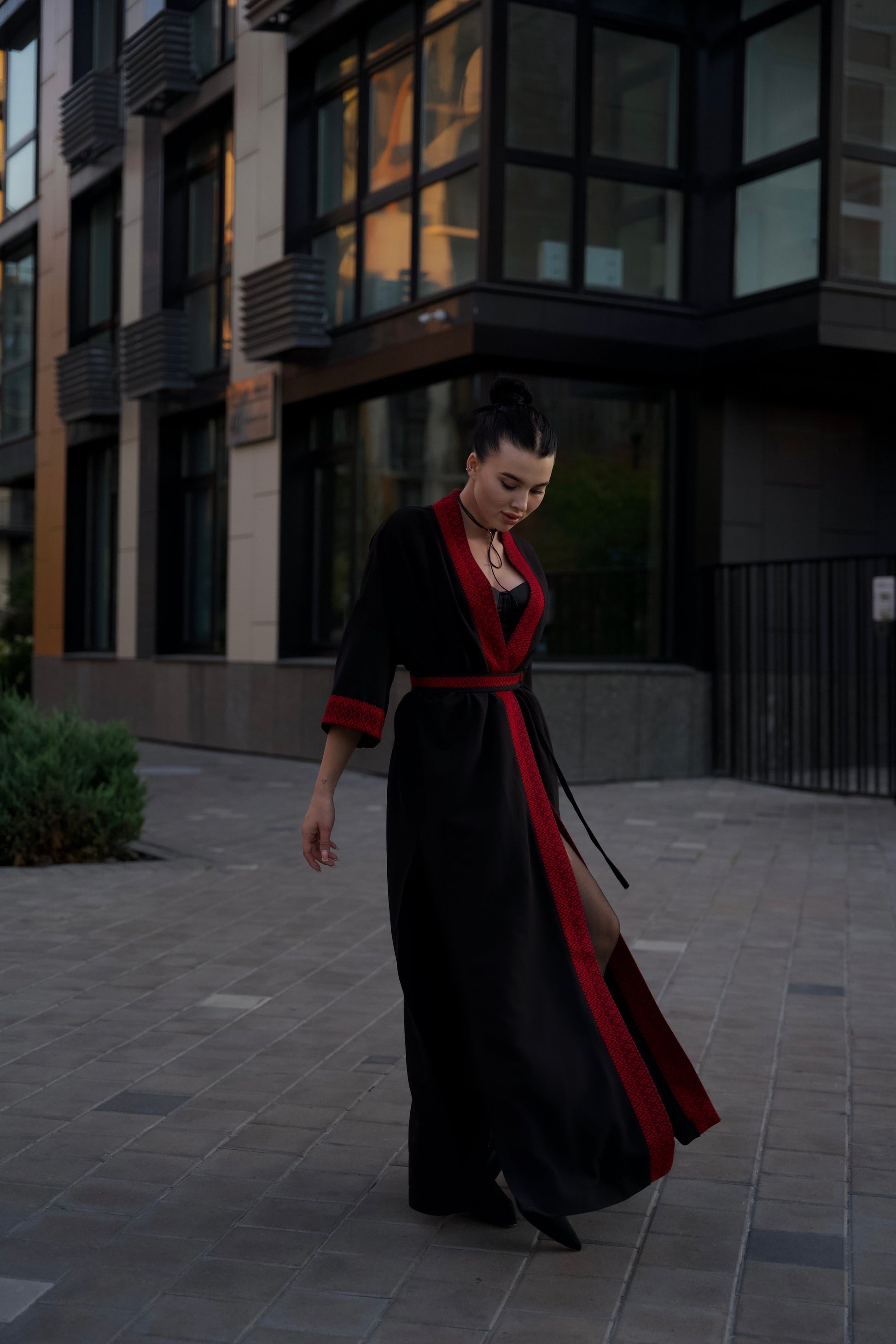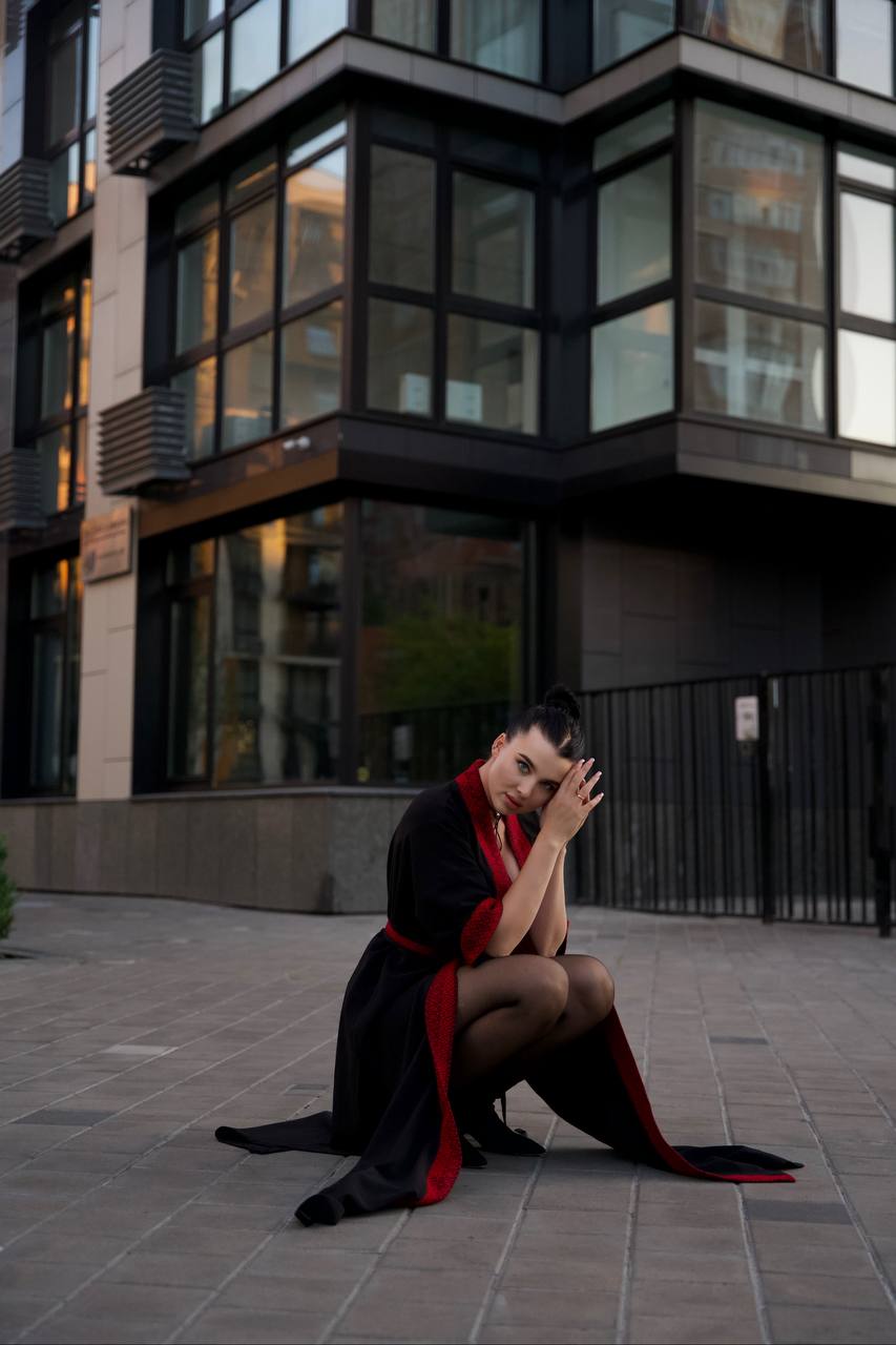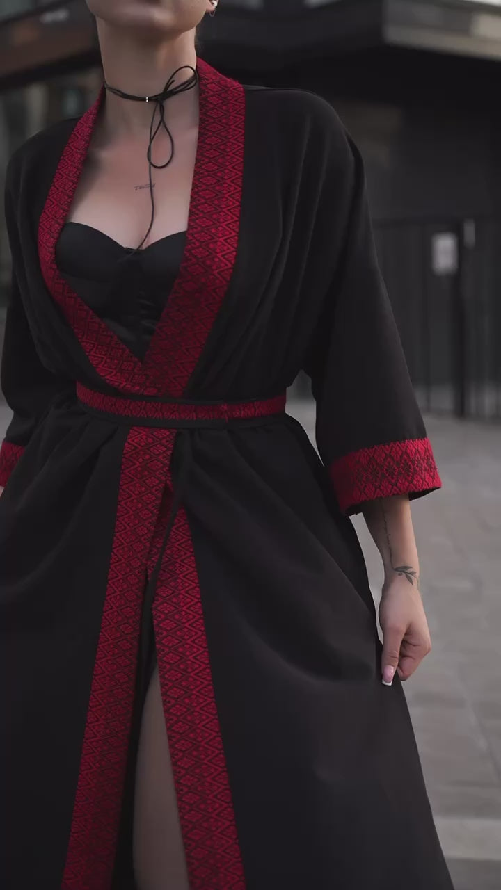 Це чорне кімоно з червоним орнаментом —-вдале поєднання стриманої елегантності та глибокої символіки. У кожній деталі — сила традиції та впевнена сучасність. Акцентна вишивка з геометричним орнаментом уздовж борту, манжетів і пояса перетворює кімоно на справжній витвір мистецтва, який розповідає історію без слів.