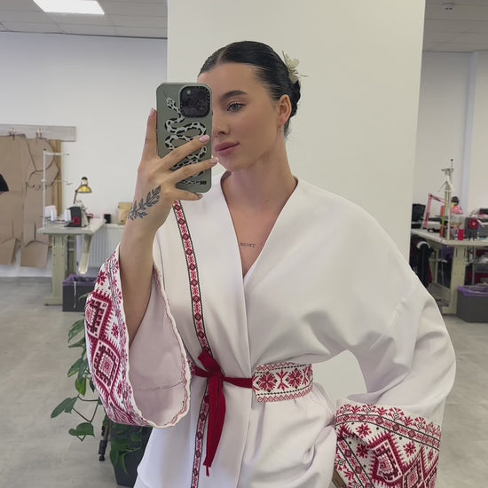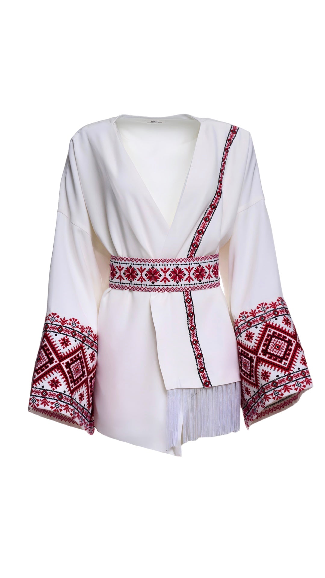 Цей жіночий образ з кімоно - справжній маніфест краси, вкоріненої в традиціях, але осмисленої по-новому. Чистий білий фон підкреслює складну геометрію червоної етнічної вишивки, що прикрашає рукави, пояс та борти. Строга елегантність силуету поєднується з ніжністю в деталях - бахрома, зав’язка на талії, глибокий розріз і вільні рукави додають образу руху й жіночої енергії.
