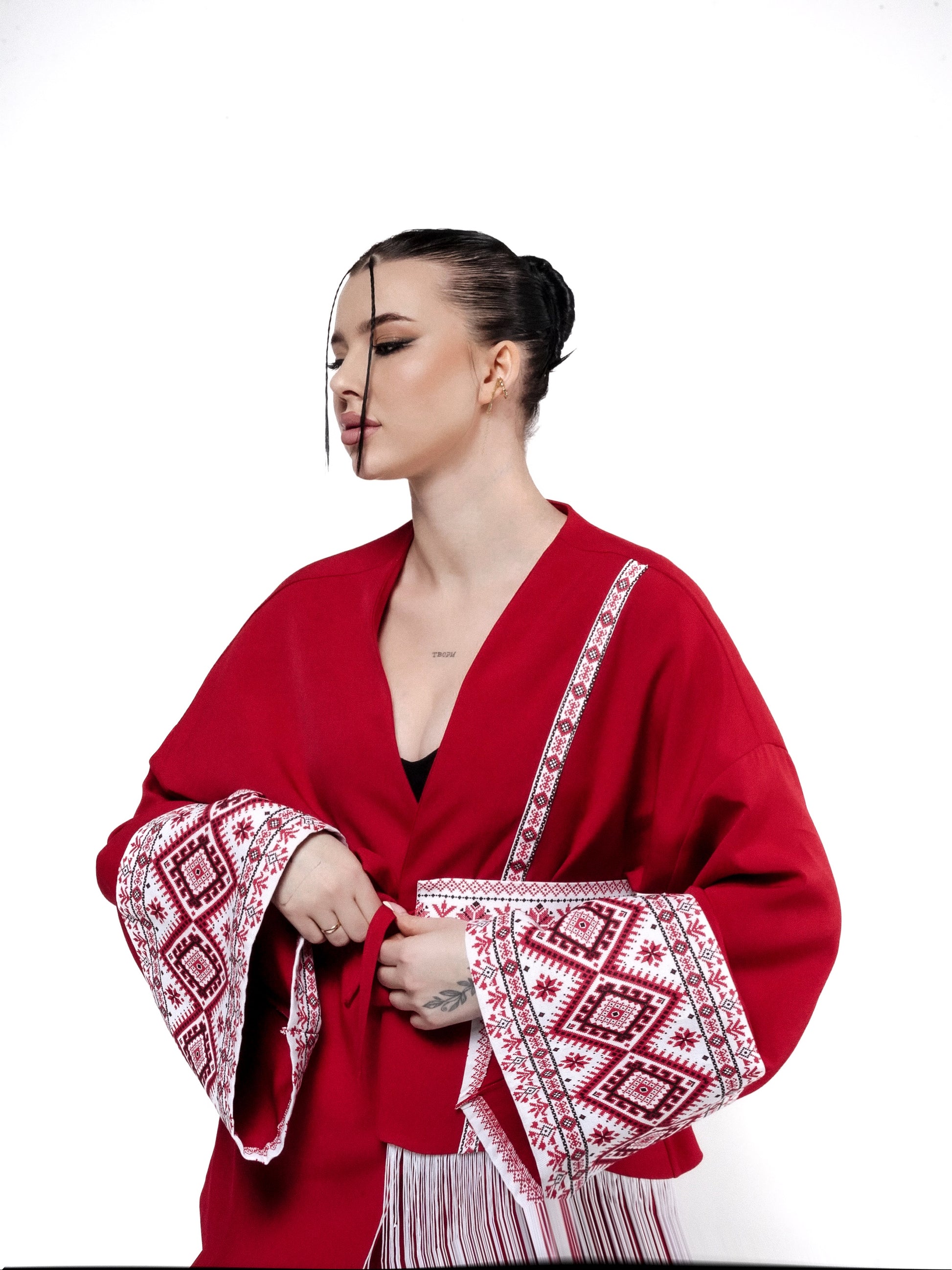 Цей жіночий образ з кімоно - справжній маніфест краси, вкоріненої в традиціях, але осмисленої по-новому. Чистий білий фон підкреслює складну геометрію червоної етнічної вишивки, що прикрашає рукави, пояс та борти. Строга елегантність силуету поєднується з ніжністю в деталях - бахрома, зав’язка на талії, глибокий розріз і вільні рукави додають образу руху й жіночої енергії.