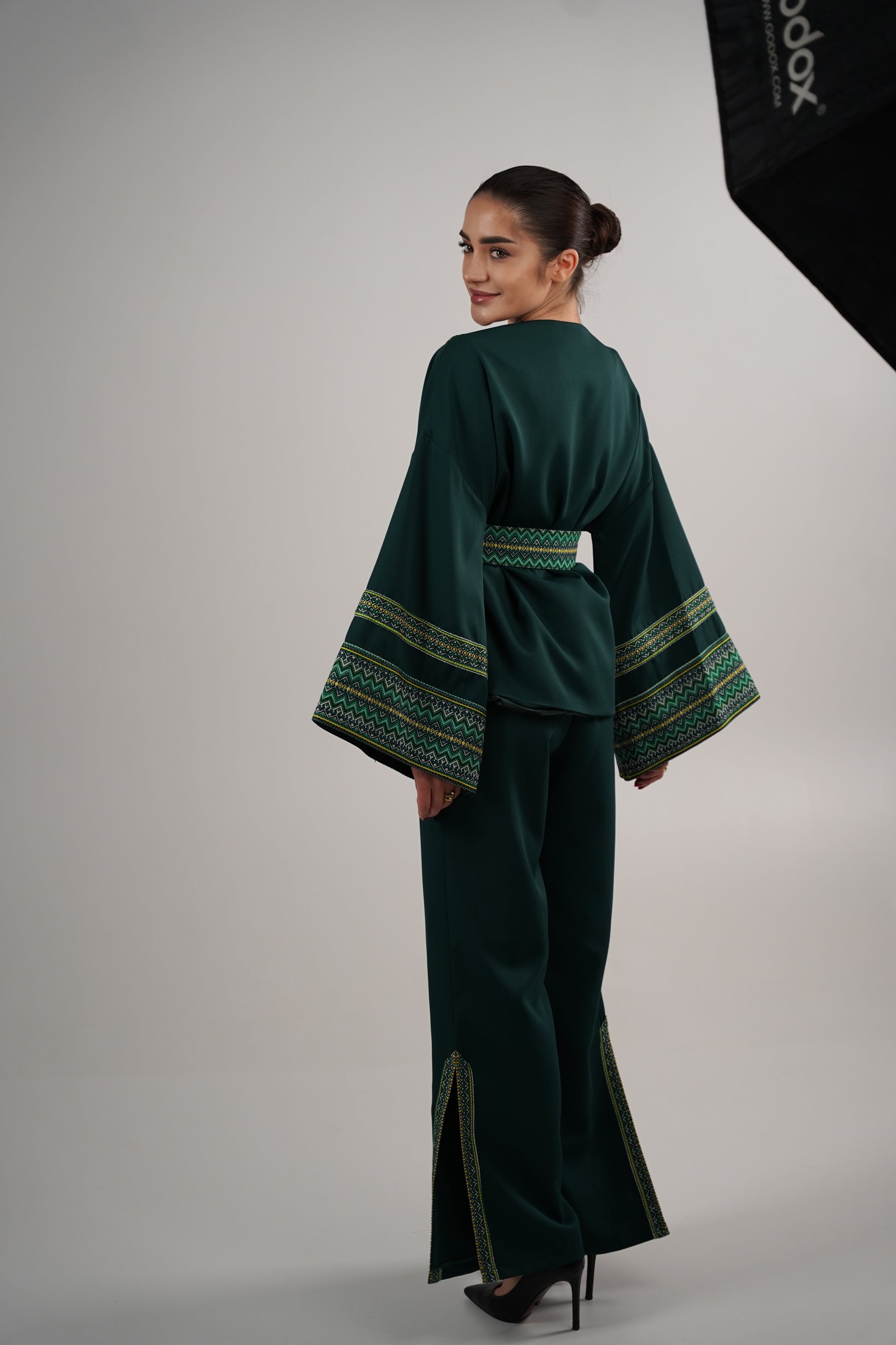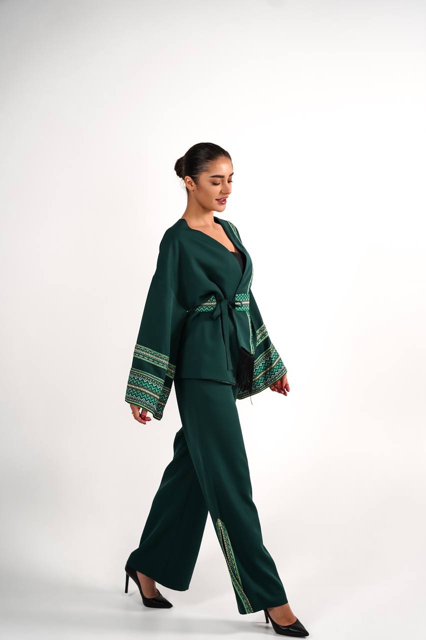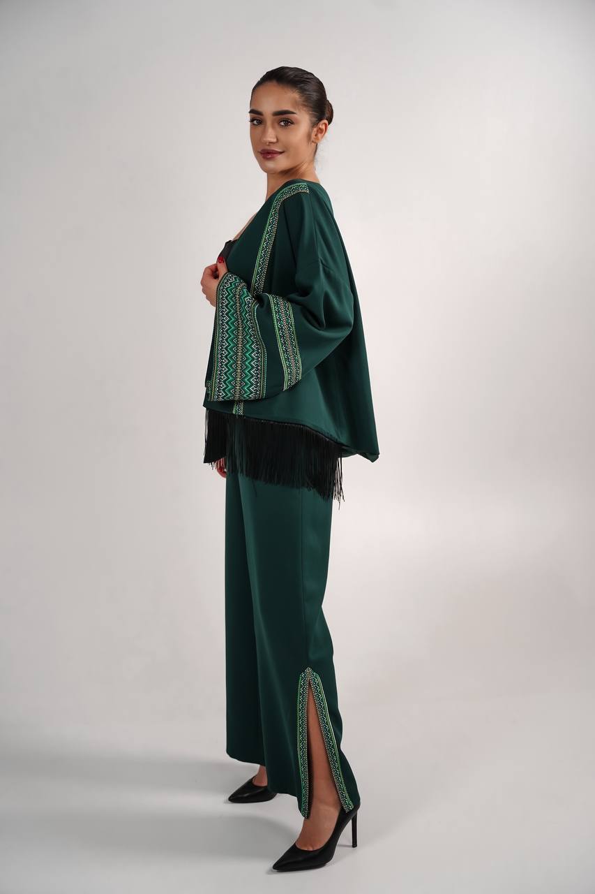 Цей жіночий образ з кімоно - справжній маніфест краси, вкоріненої в традиціях, але осмисленої по-новому. Чистий білий фон підкреслює складну геометрію червоної етнічної вишивки, що прикрашає рукави, пояс та борти. Строга елегантність силуету поєднується з ніжністю в деталях - бахрома, зав’язка на талії, глибокий розріз і вільні рукави додають образу руху й жіночої енергії.