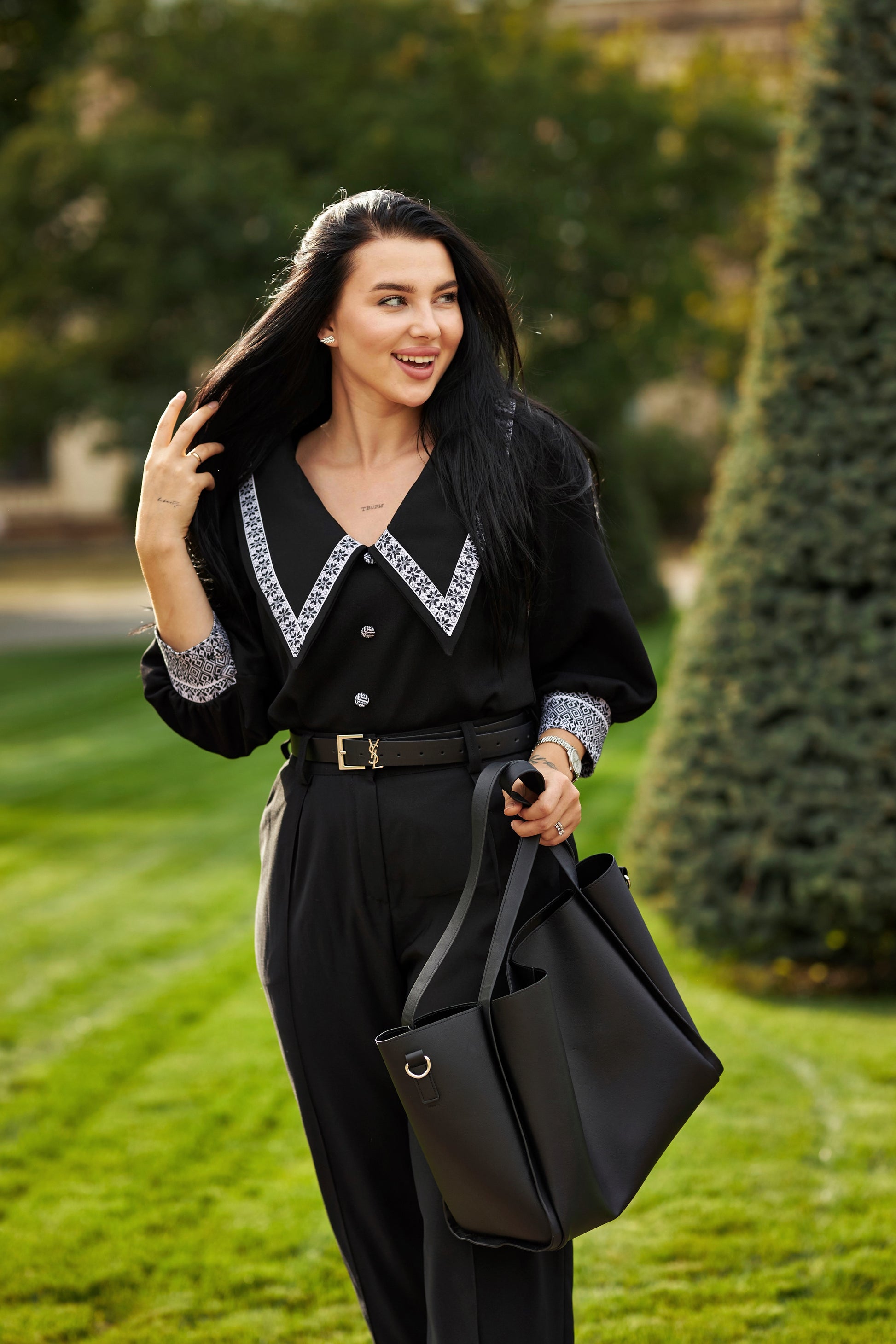 Ця модель стане самодостатнім елементом образу - її можна комбінувати з класичними брюками, лляними спідницями або денімом, створюючи стилістичні мікси між традицією та сучасністю.