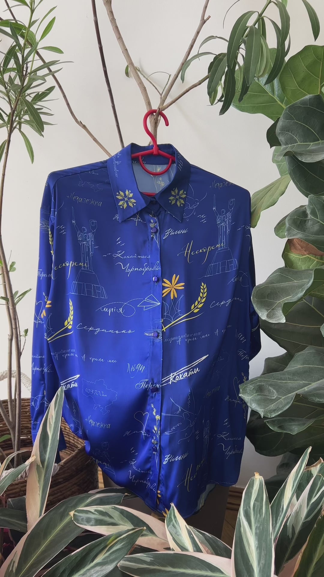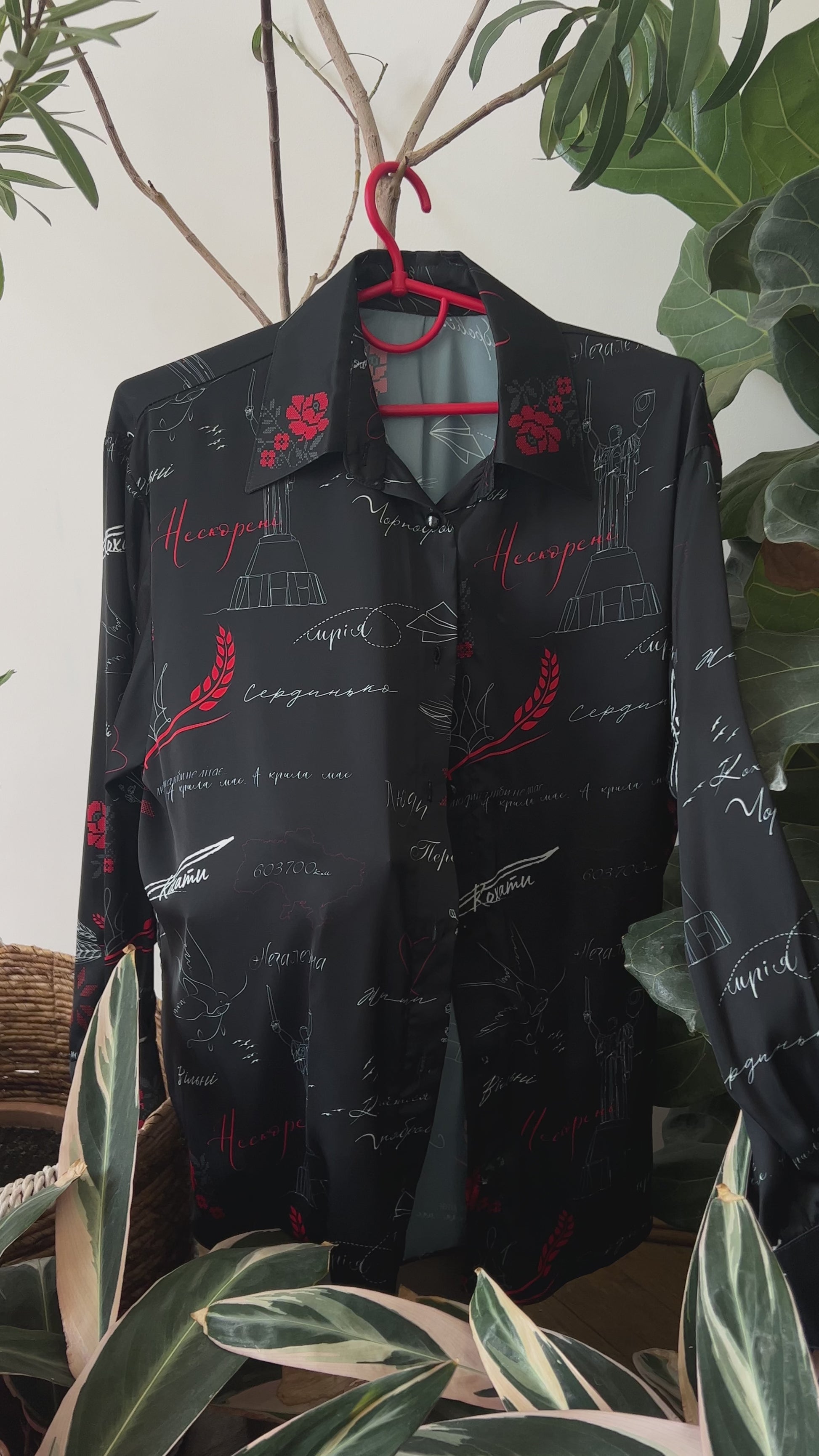 Ця сорочка - більше, ніж просто частина гардеробу. Це історія, зашифрована в кожній лінії. Чорна база підкреслює стриману елегантність, а авторський принт із рукописними фразами, колосками та тонкою вишивкою створює глибину. Тут стильна графіка переплітається з українськими культурними кодами, а класичний крій - з виразною свободою самовираження.