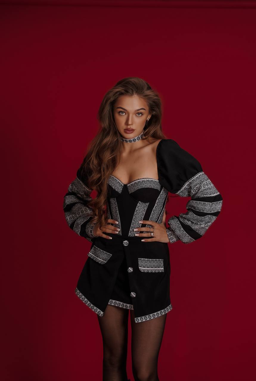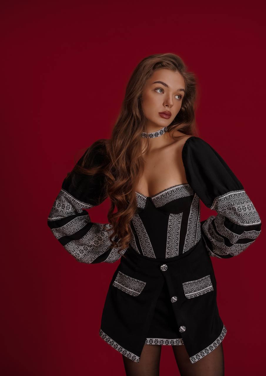 Посадка - висока, що акцентує талію й візуально витягує ноги. Щільна тканина гарно тримає форму, не просвічує, не деформується. Вишиті елементи розміщені так, щоб створити вертикальний ритм - образ здається витонченим і зібраним, навіть у русі.