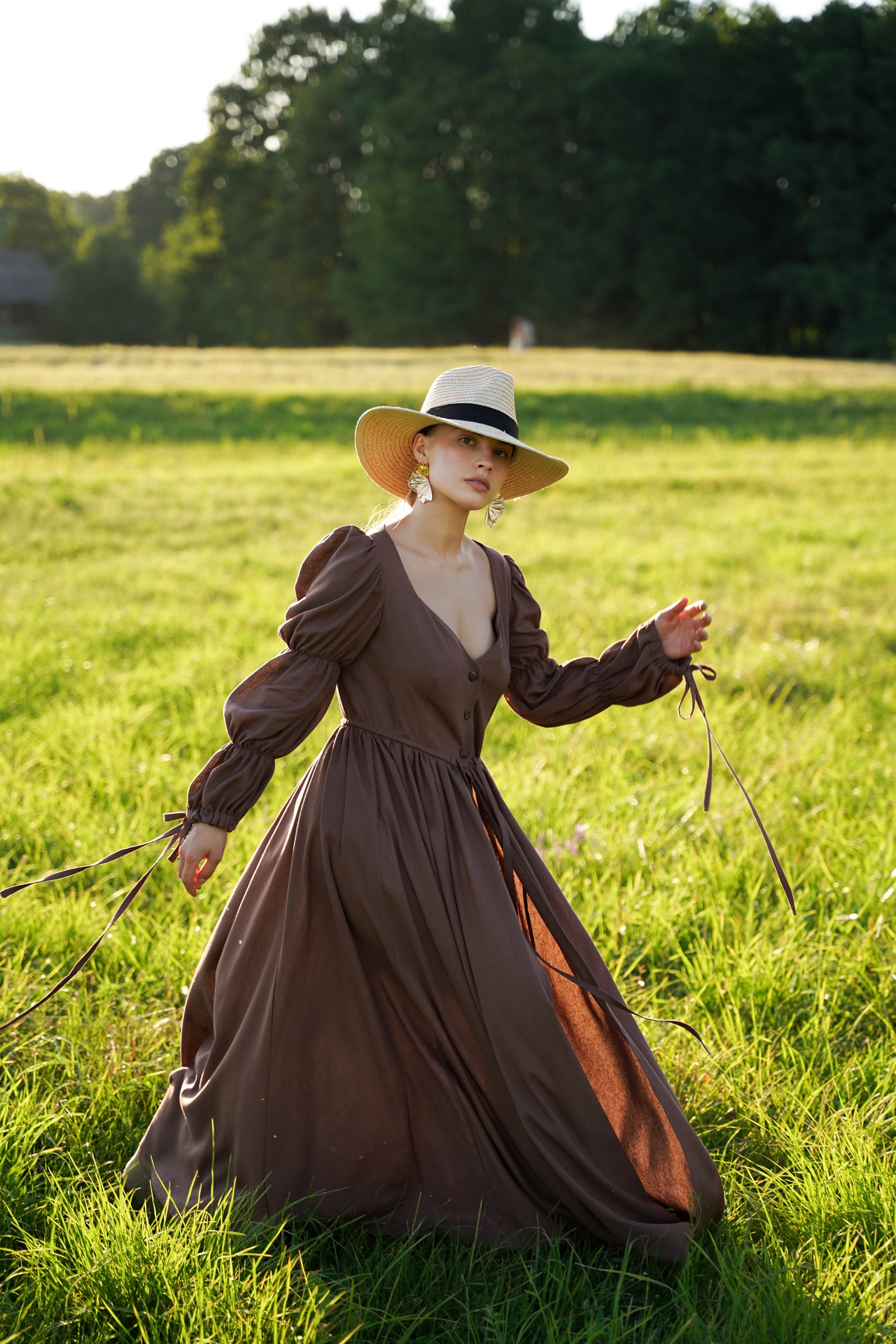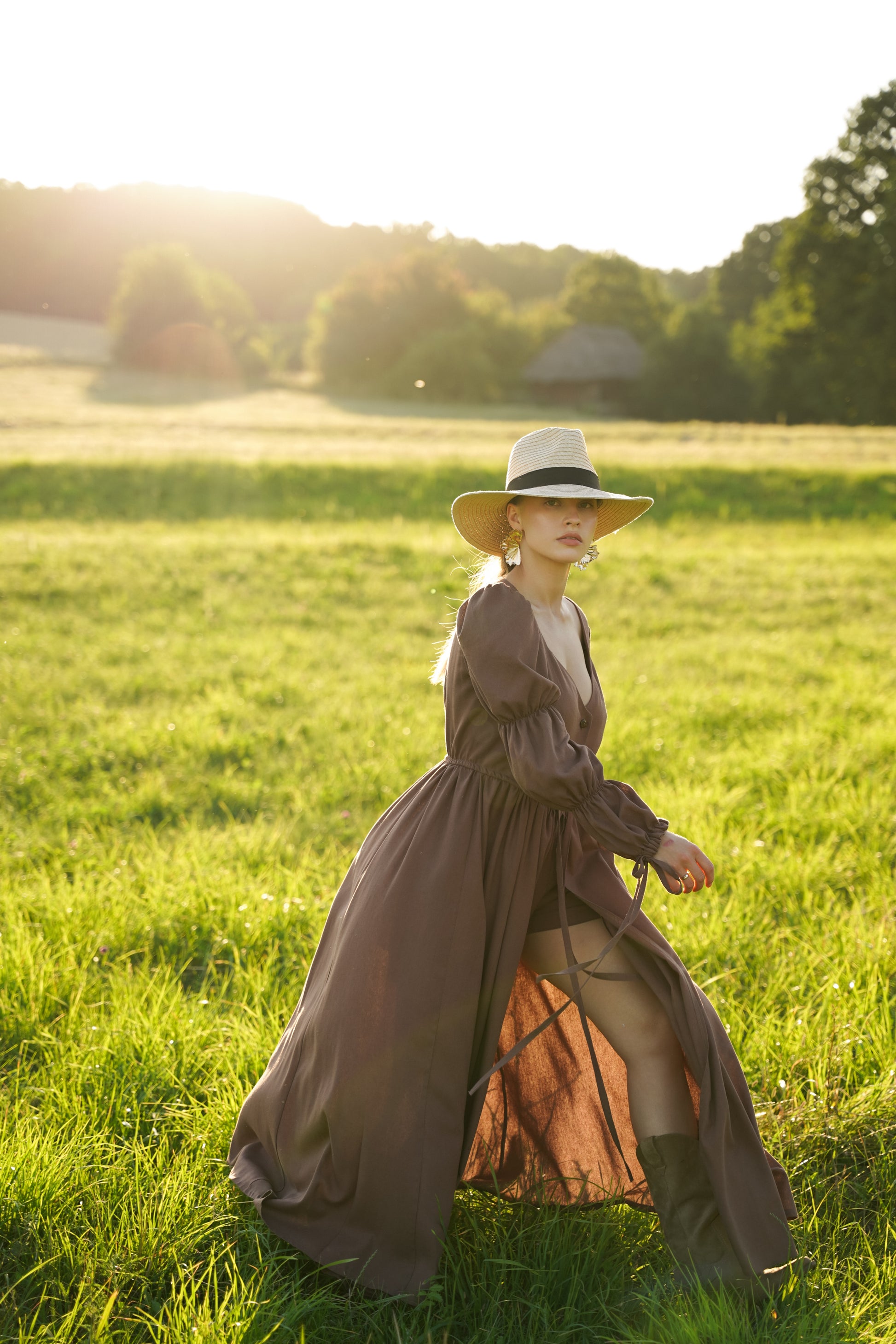 Сукня-накидка вільного крою - ідеальний вибір для тих, хто цінує комфорт та витонченість. Легка, повітряна тканина м’яко лягає по фігурі, а глибоке V-декольте та акцент на талії створюють елегантний силует. Завдяки довгим рукавам із зав’язками ця модель поєднує романтичність і сучасний стиль.