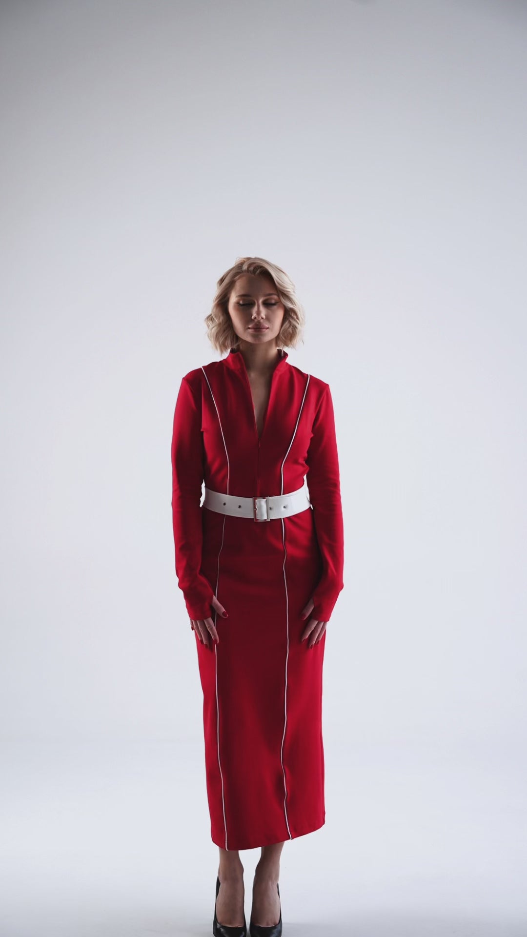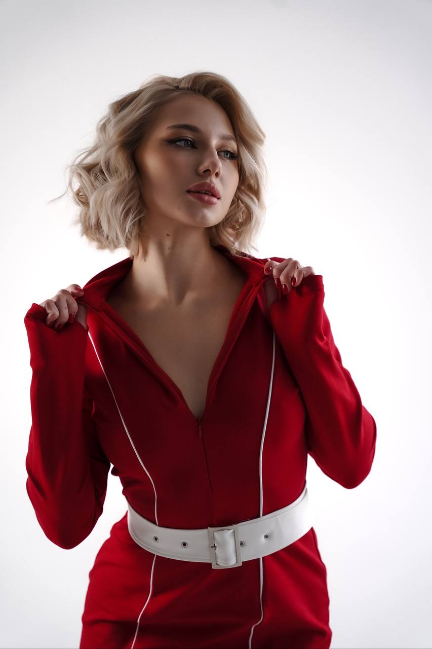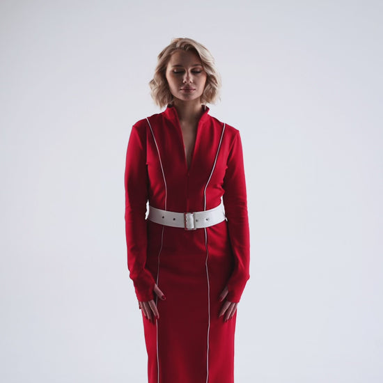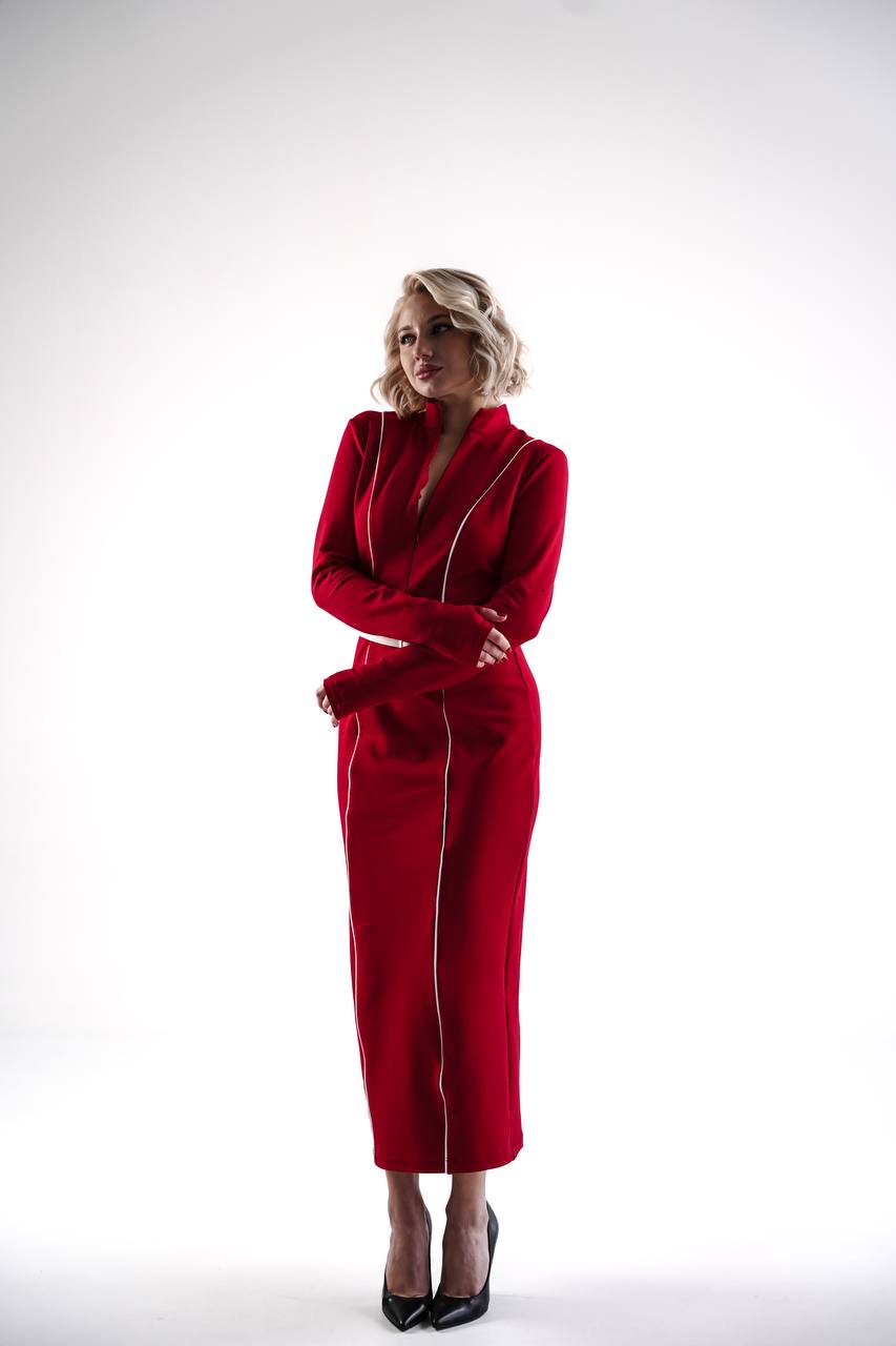 Сукня у насиченому червоному кольорі - це втілення енергії, впевненості та витонченості. Приталений силует акцентує жіночі форми, а вертикальні декоративні лінії візуально витягують фігуру, додаючи стриманої динаміки. Виріз на грудях балансує образ і додає легкого драматизму.