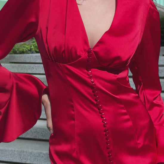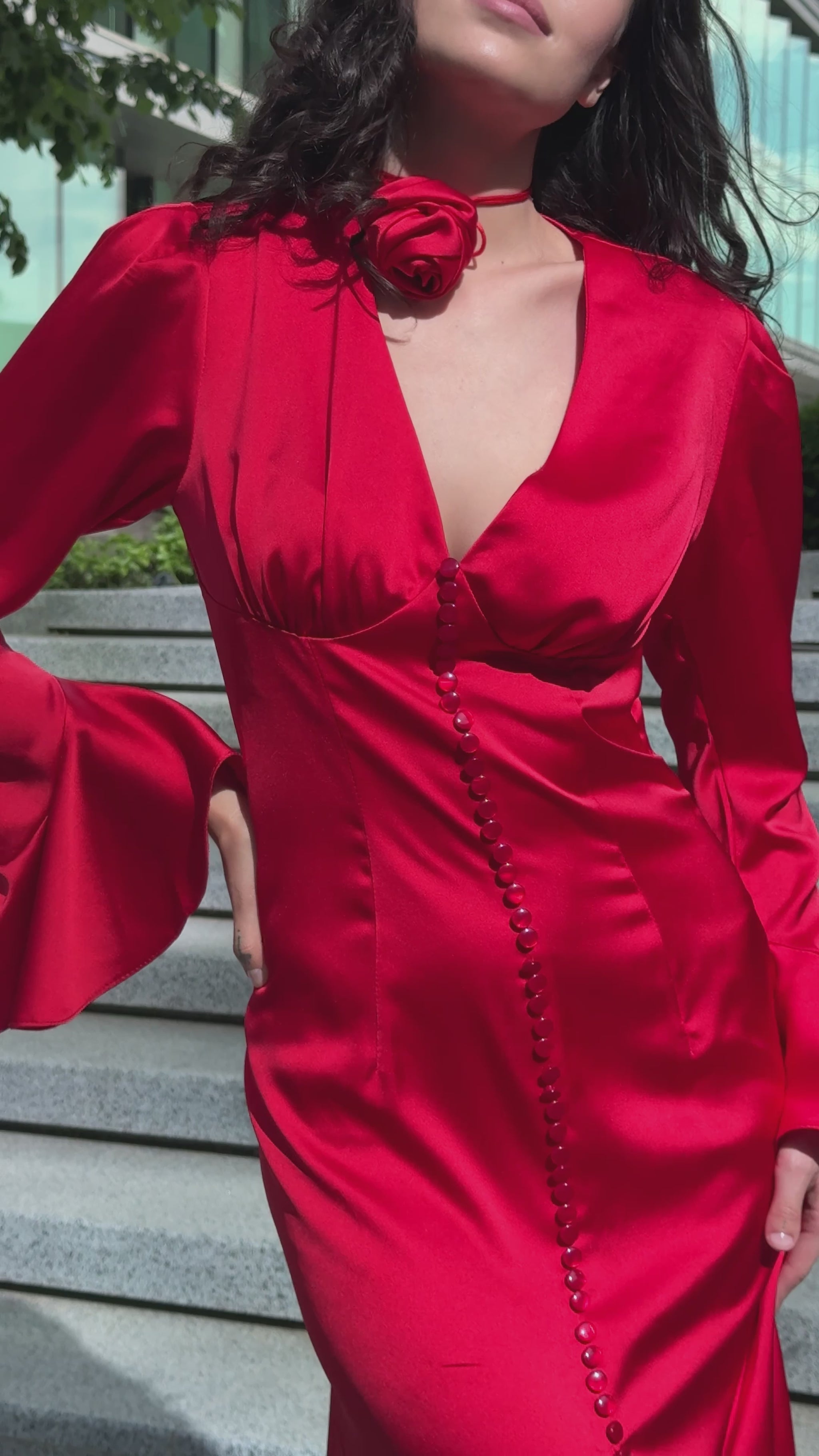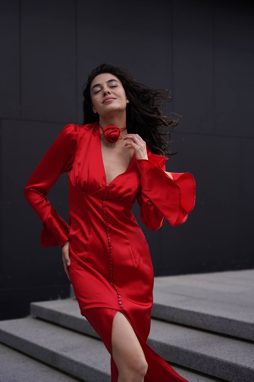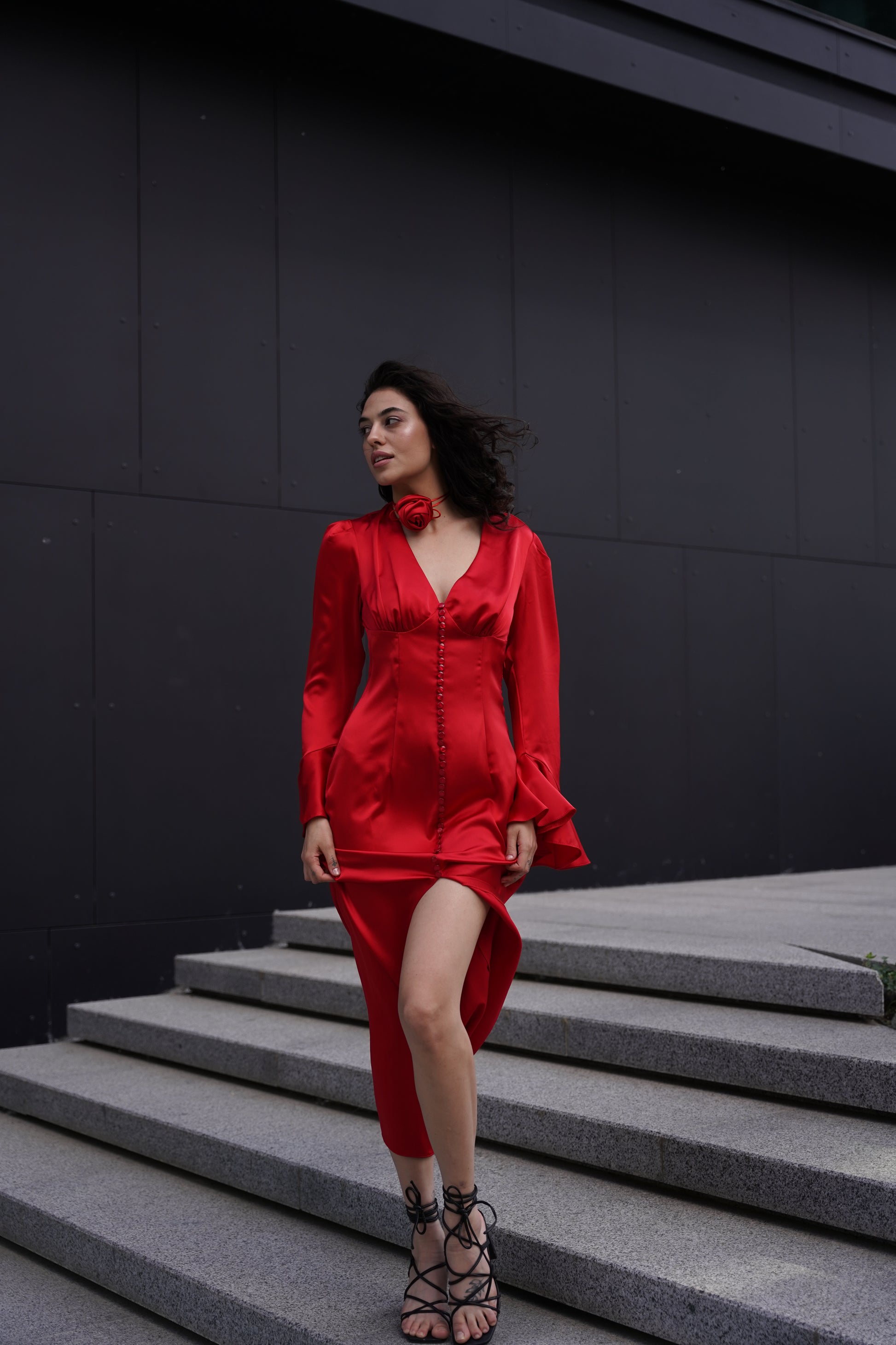 Червона сатинова сукня з гудзиками - акцент, який не потребує слів