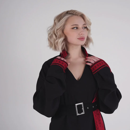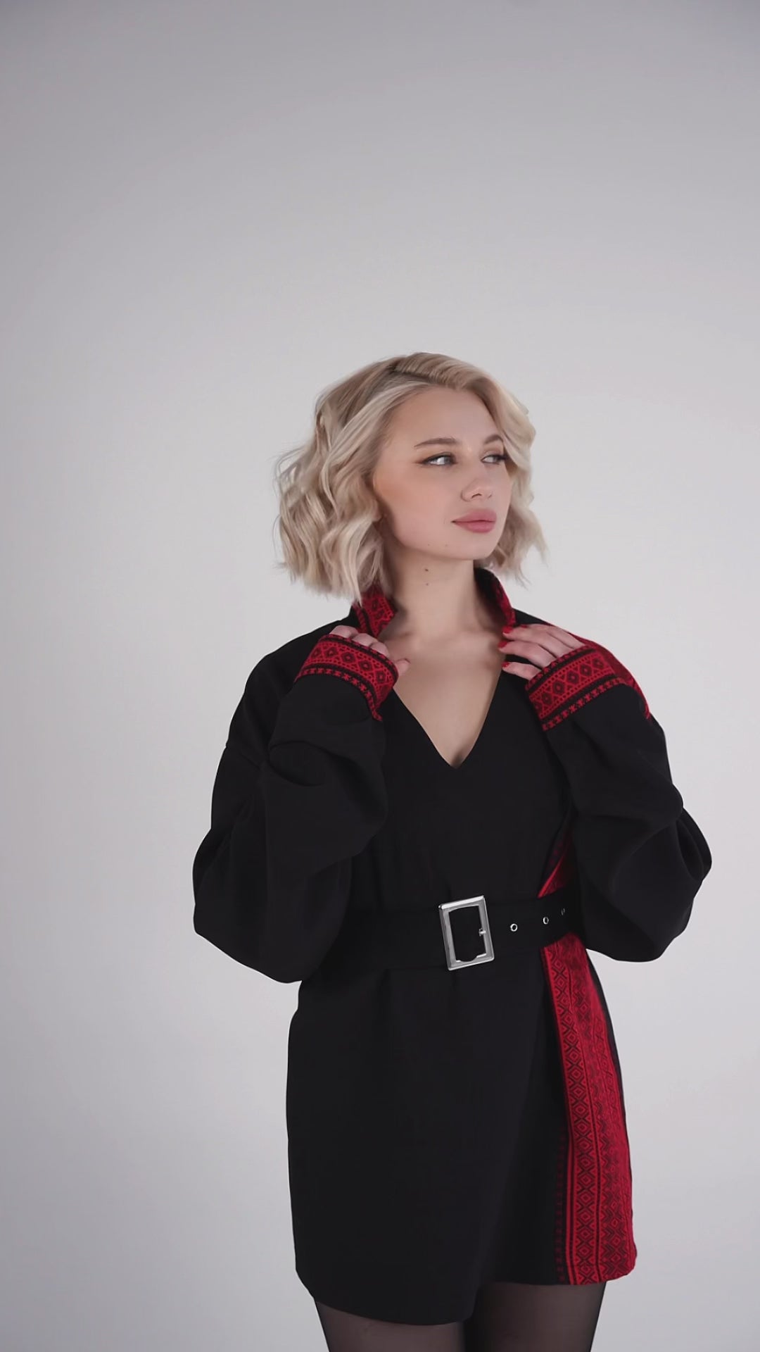Сукня-вишиванка з етнічним акцентом - це сучасне втілення української жіночності та сили. Глибокий чорний колір у поєднанні з червоною геометричною вишивкою створює виразний, але стриманий образ. Прямий вільний крій, акцентна застібка та широкий ремінь формують ідеальний силует: підкреслена талія, свобода в рухах, лаконічна естетика.