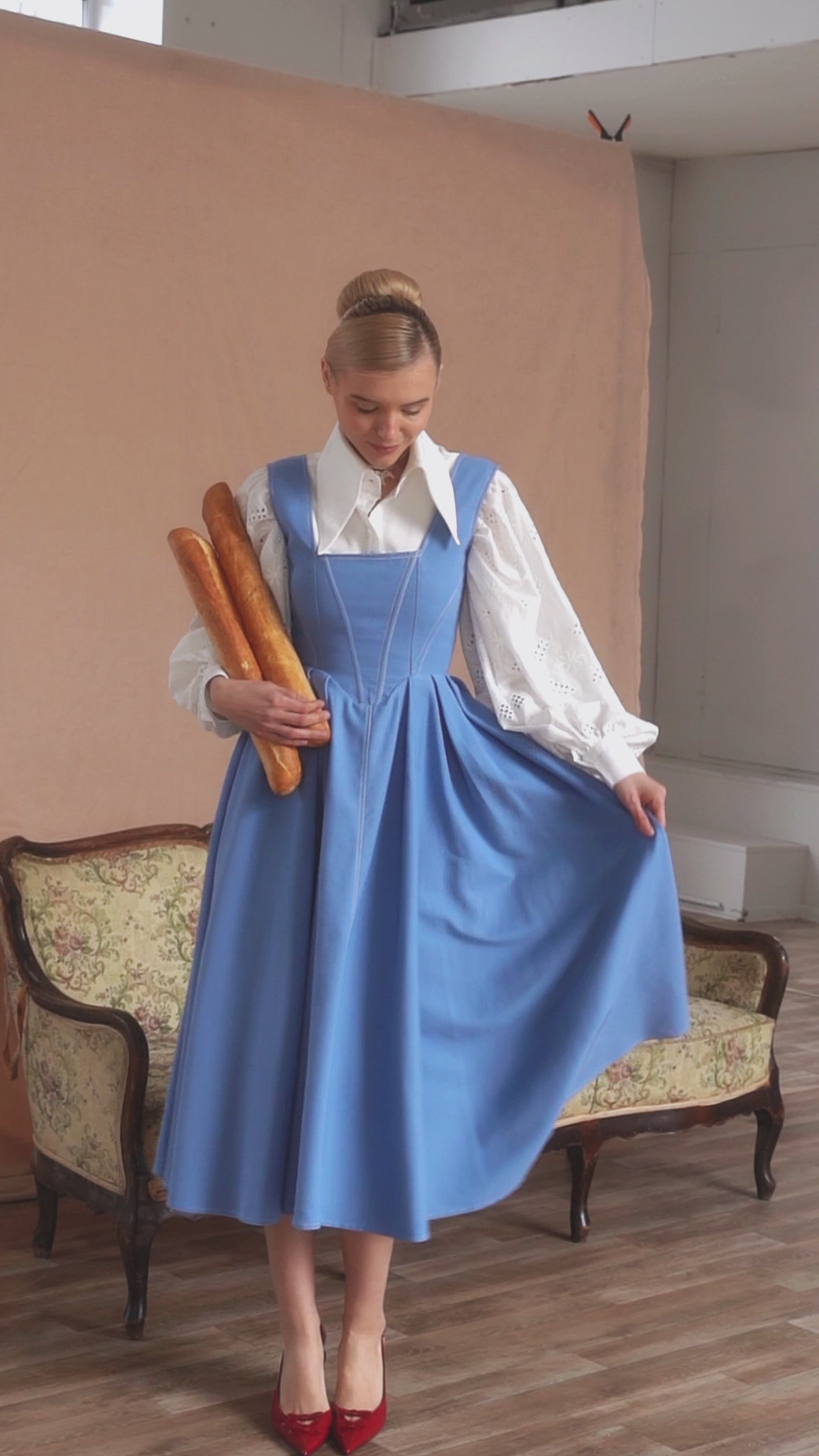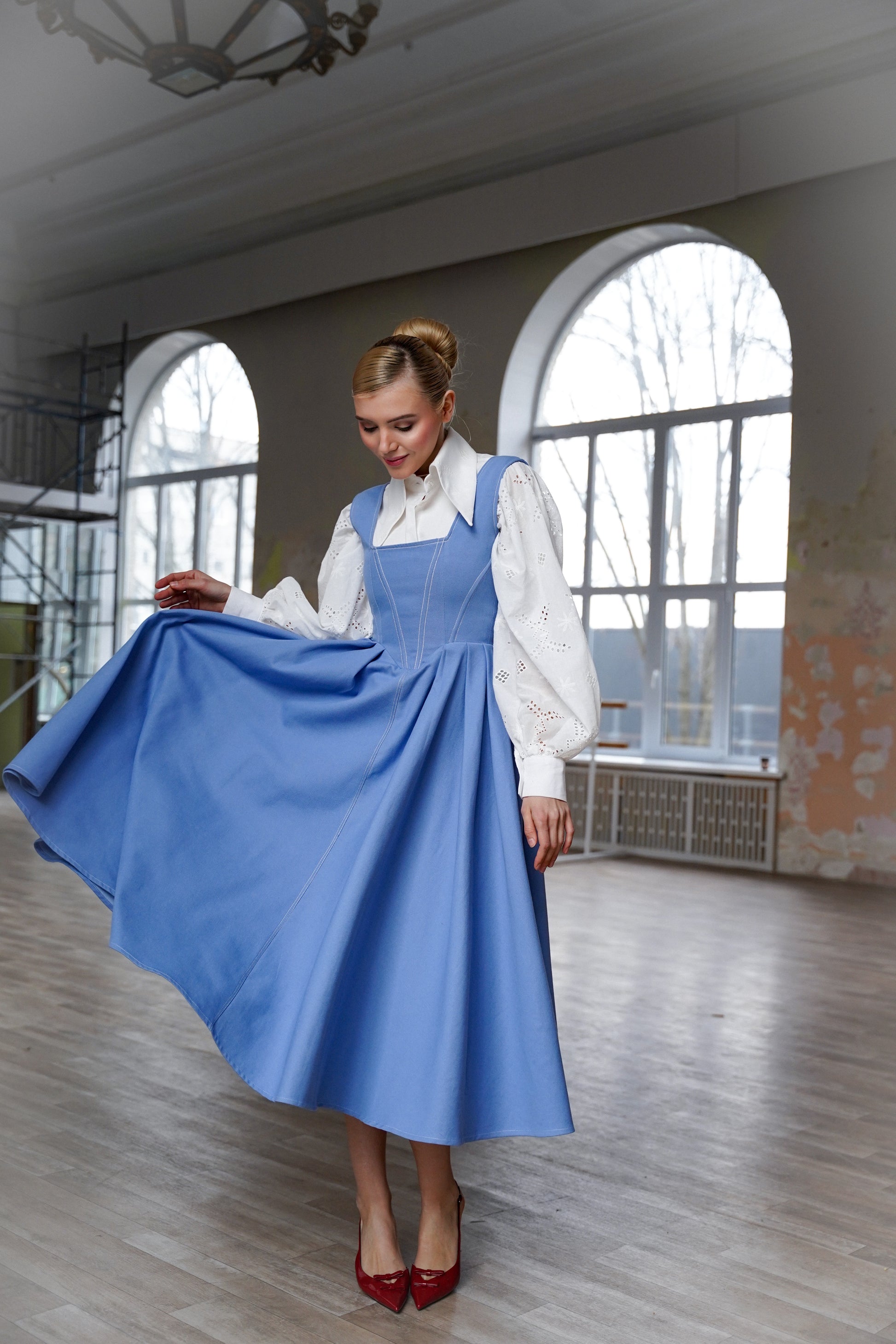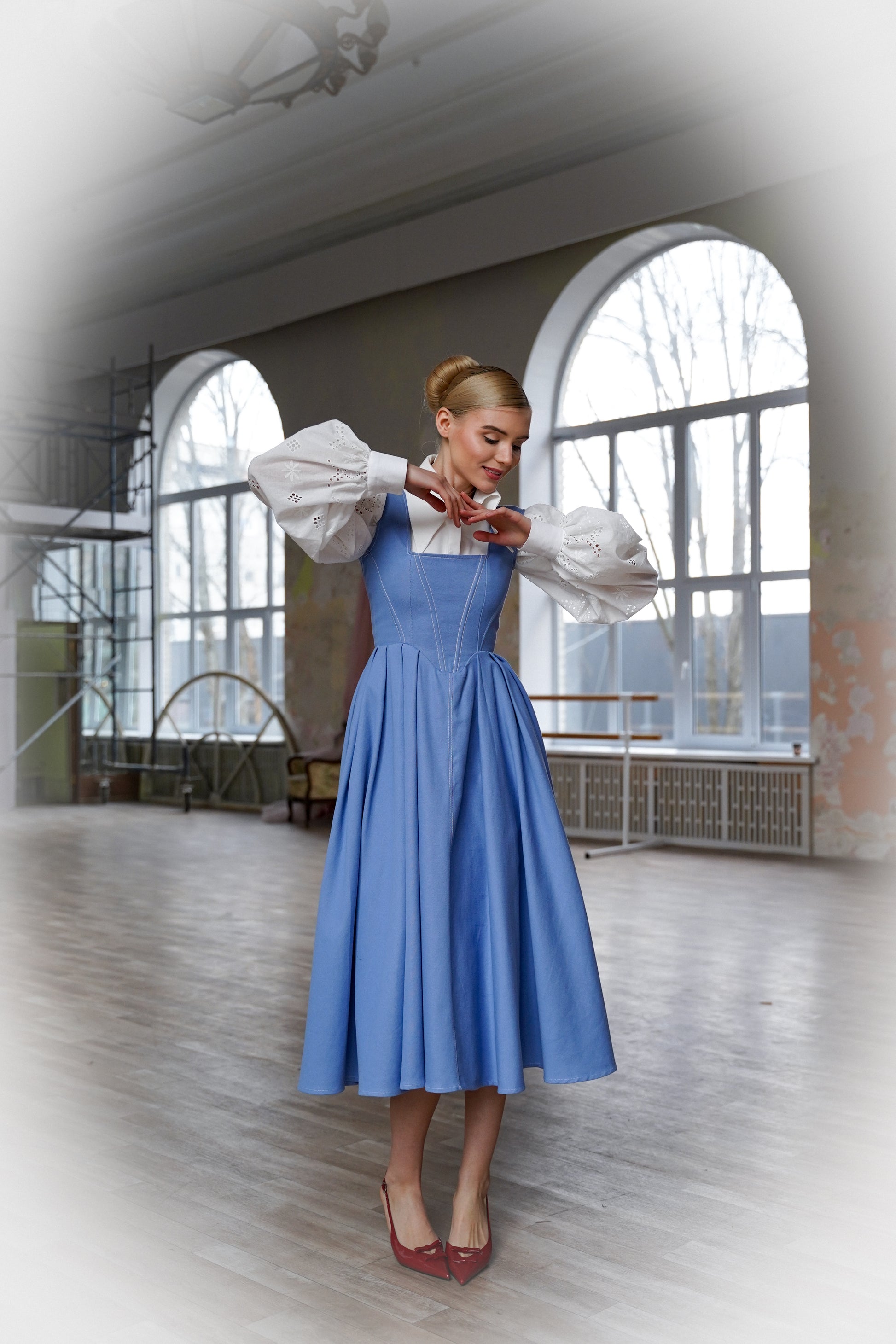 Сукня розроблена так, щоб її можна було носити окремо або в поєднанні з сорочкою - як на фото. Вільні блузи з пишними рукавами створюють обʼєм та роблять образ більш виразним. Така комбінація підійде як для роботи, так і для прогулянок чи подій.