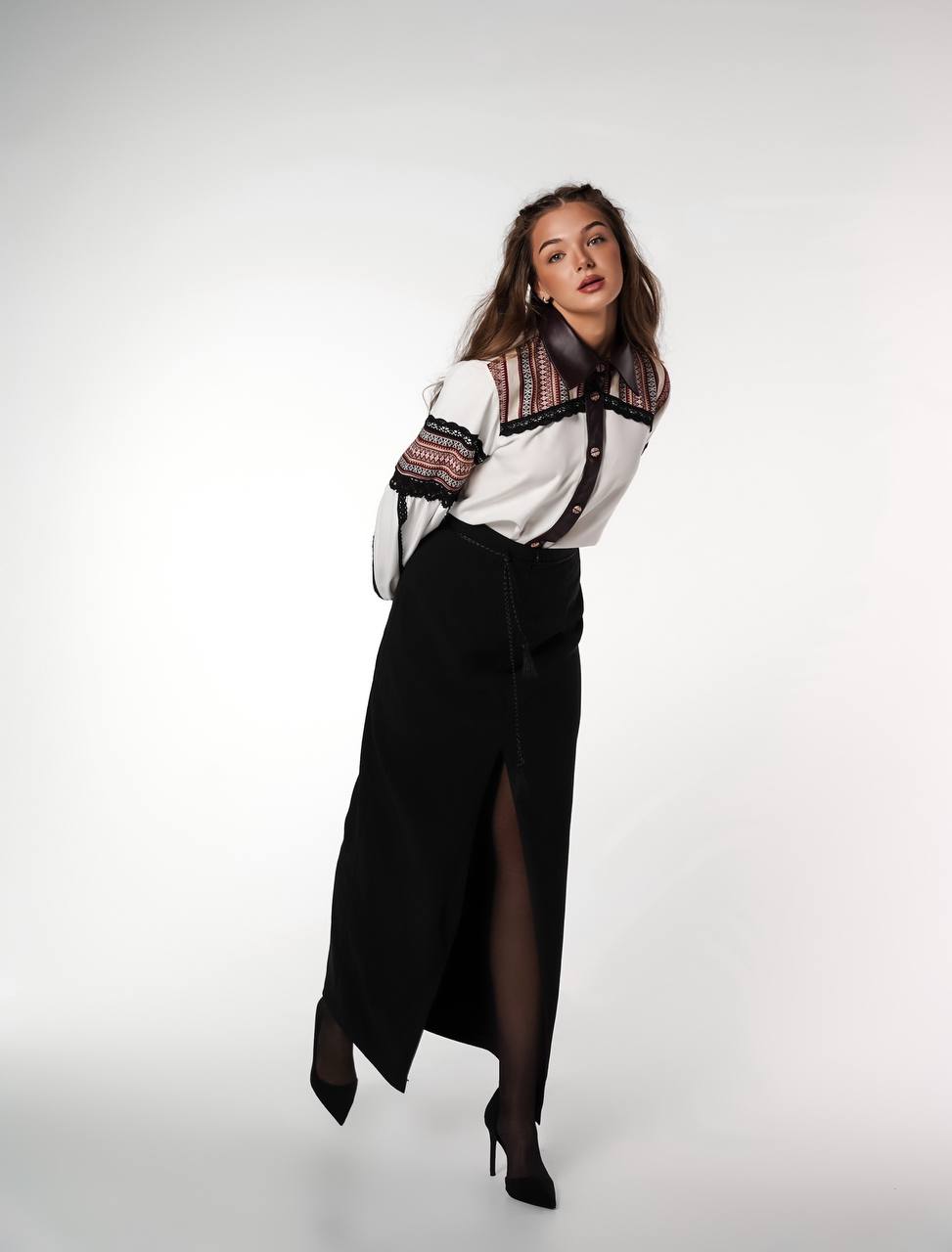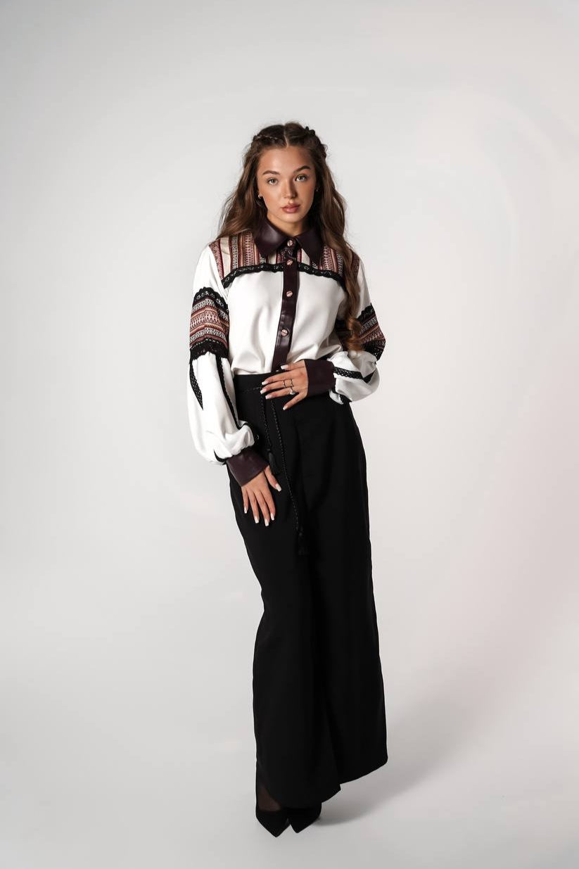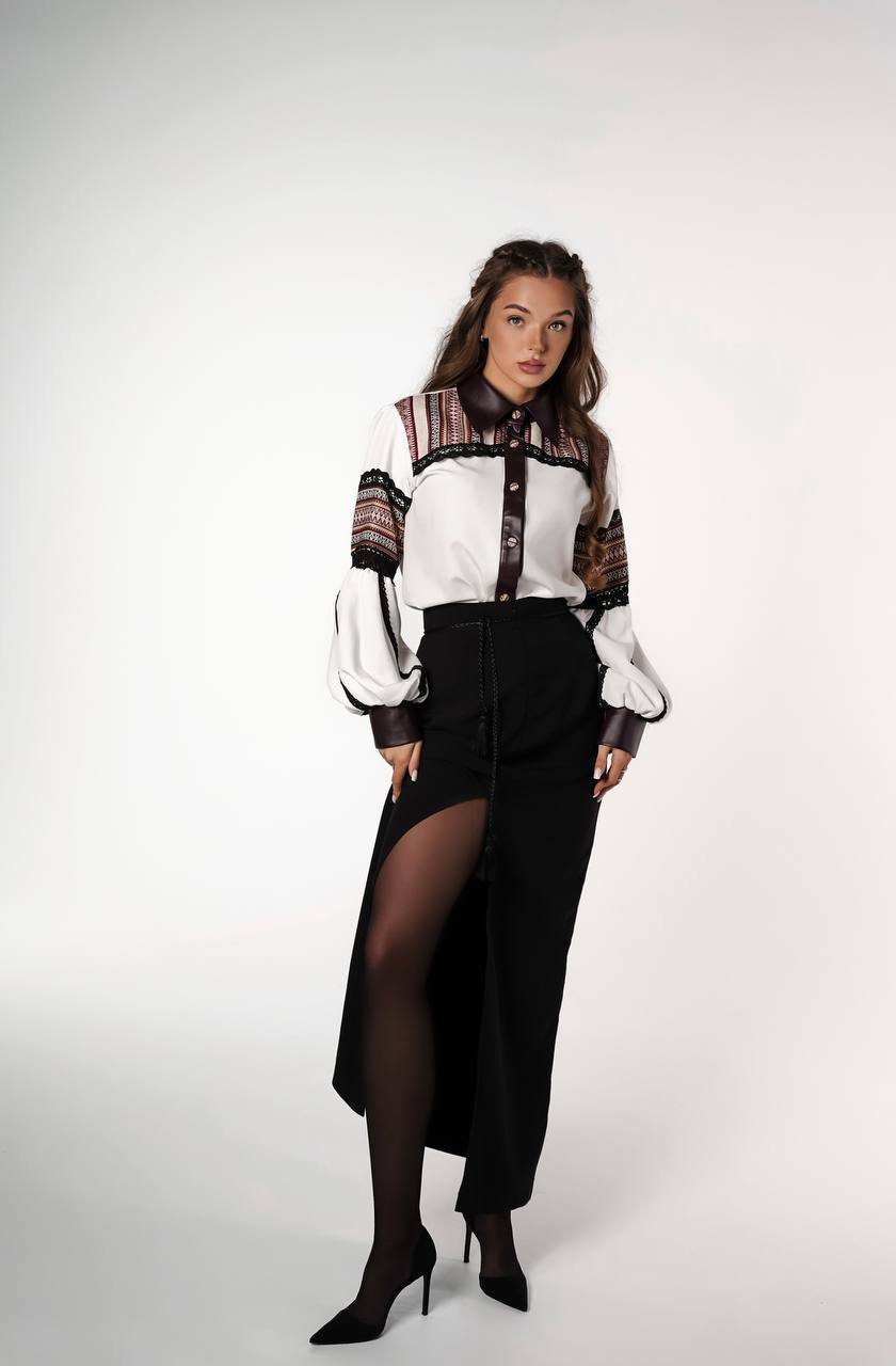 Класичні гуцульські мотиви, вишиті в глибоких бордових і чорних відтінках, розміщені на рукавах і плечах у гармонійному ритмі, що ніби підсилює внутрішній голос жінки, яка її вдягає. Шкіряні елементи на комірці, планці та манжетах додають характеру й сучасної гостроти — це вже не просто вишиванка, а fashion-образ із глибоким корінням.