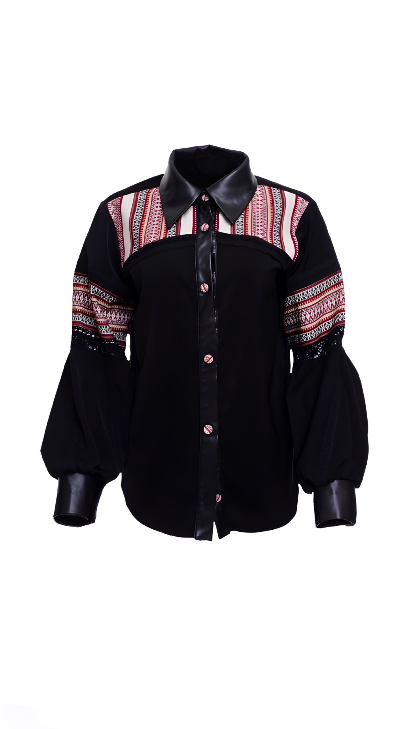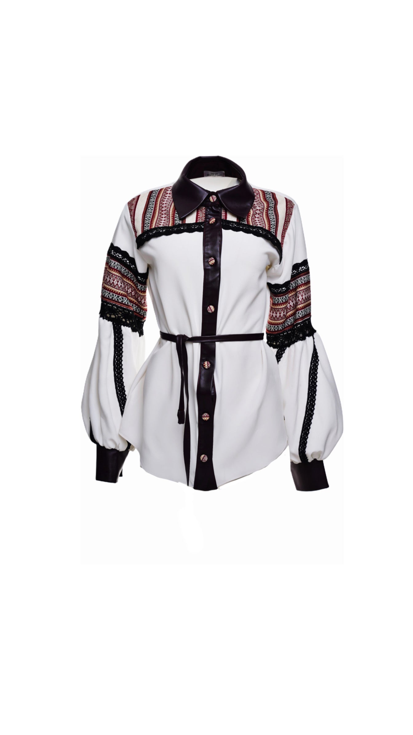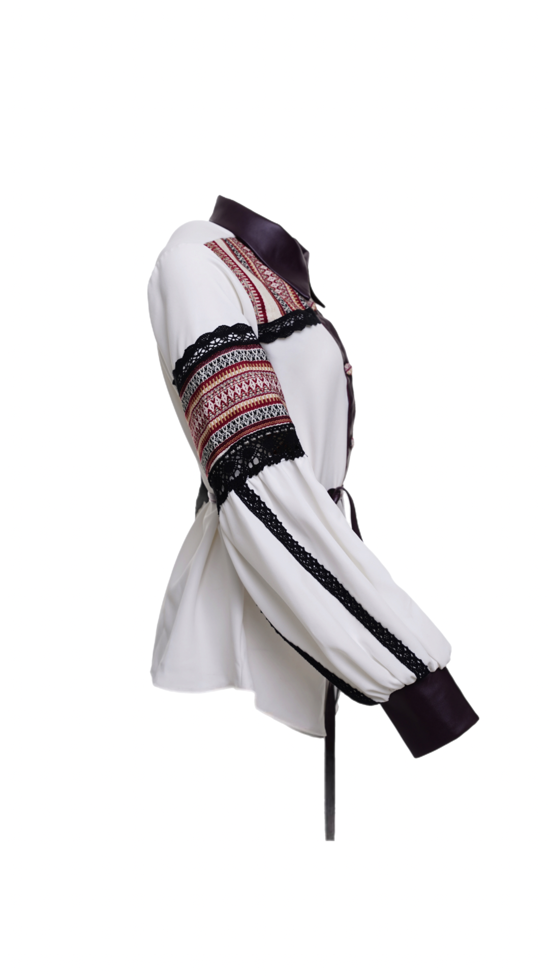 Класичні гуцульські мотиви, вишиті в глибоких бордових і чорних відтінках, розміщені на рукавах і плечах у гармонійному ритмі, що ніби підсилює внутрішній голос жінки, яка її вдягає. Шкіряні елементи на комірці, планці та манжетах додають характеру й сучасної гостроти — це вже не просто вишиванка, а fashion-образ із глибоким корінням.