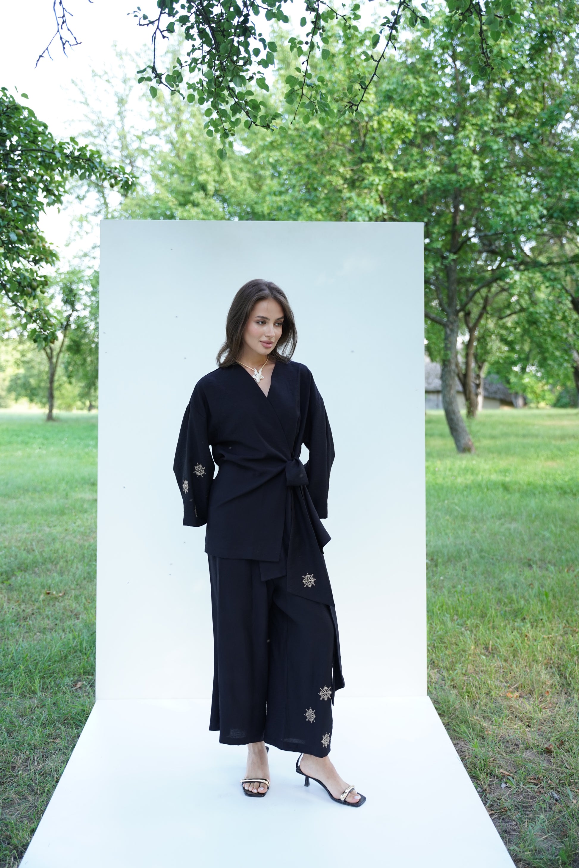 Натхненне формою японського кімоно та українським ручним орнаментом, це верхнє вбрання створене для жінок, які цінують унікальність і комфорт. М’яка тканина приємна до тіла, а вільний крій дозволяє носити кімоно як окрему річ або в поєднанні з улюбленими джинсами чи сукнею.