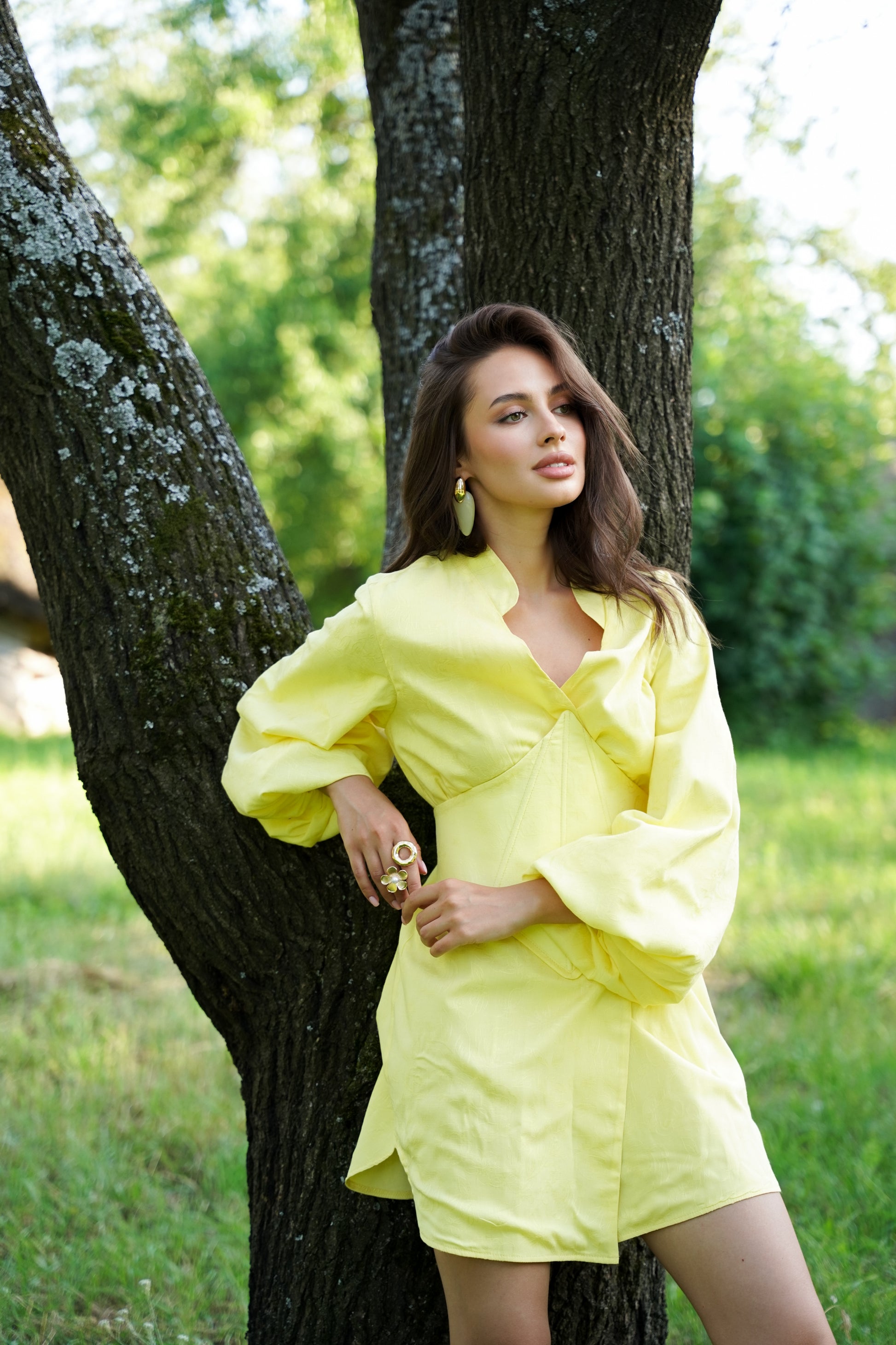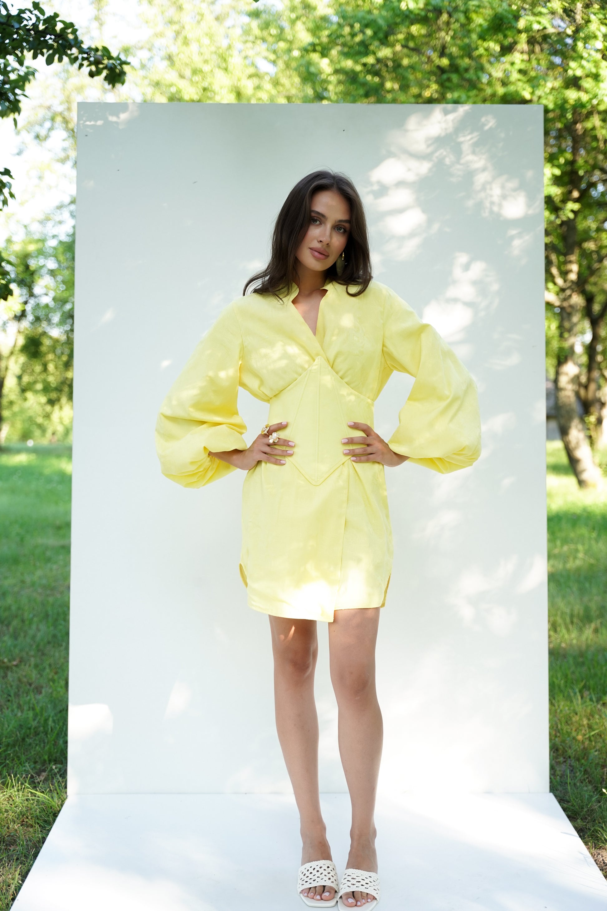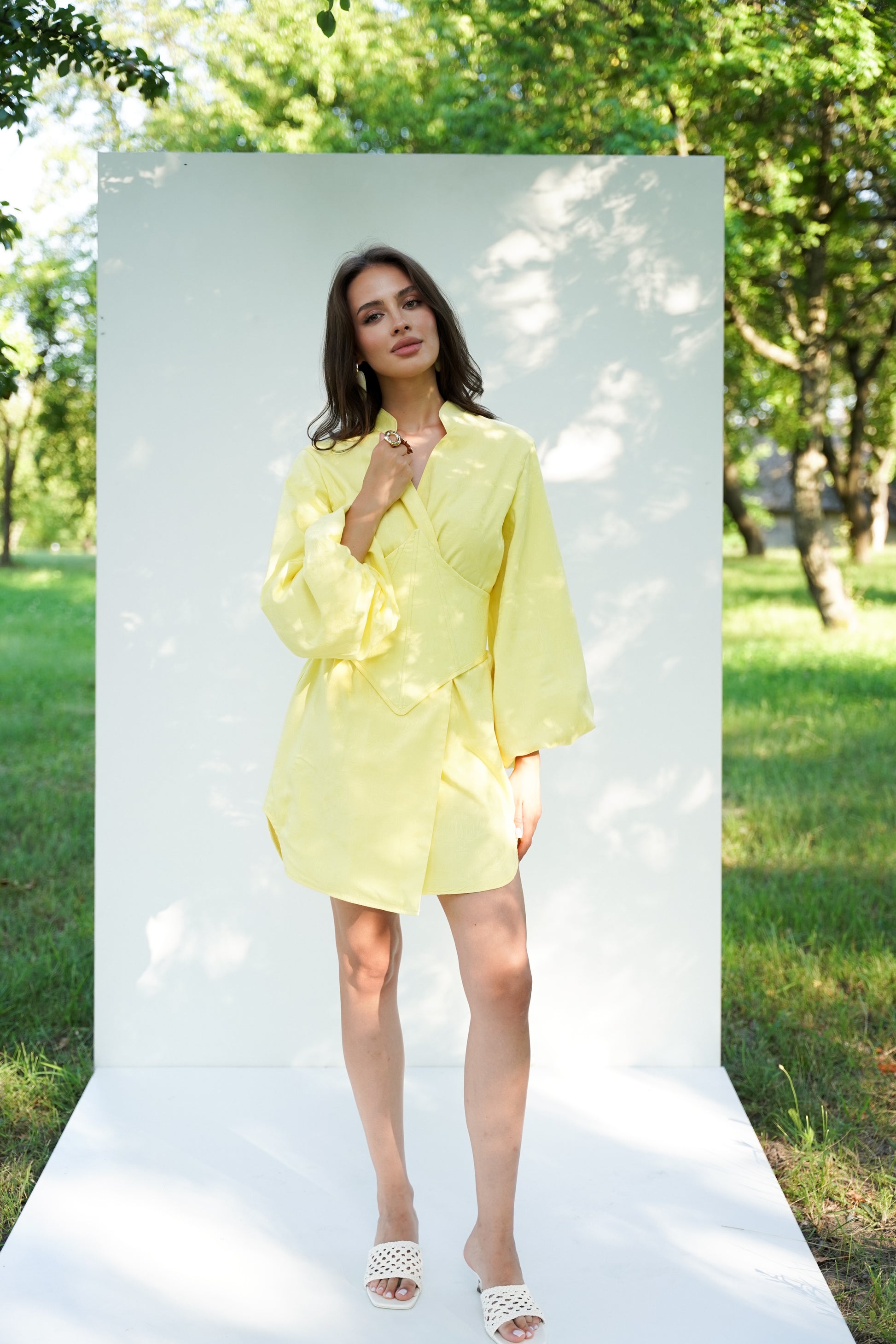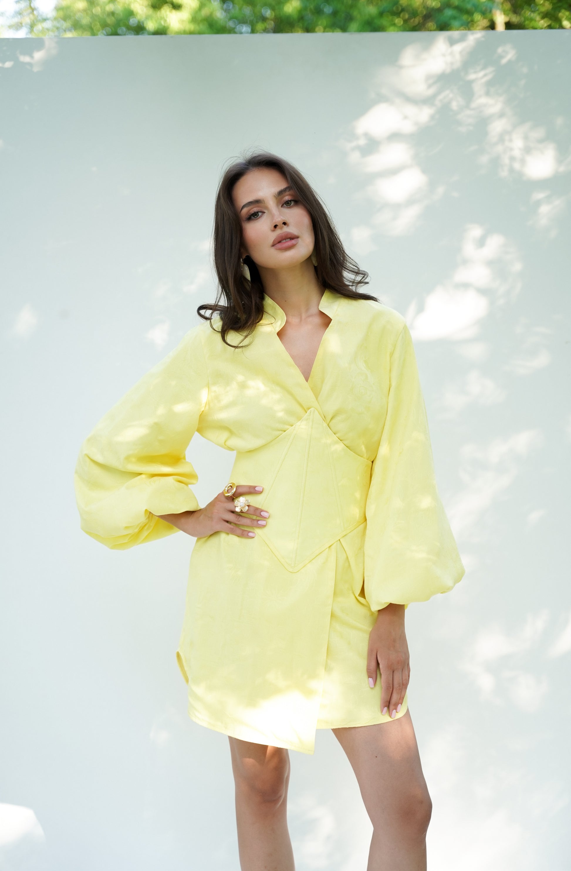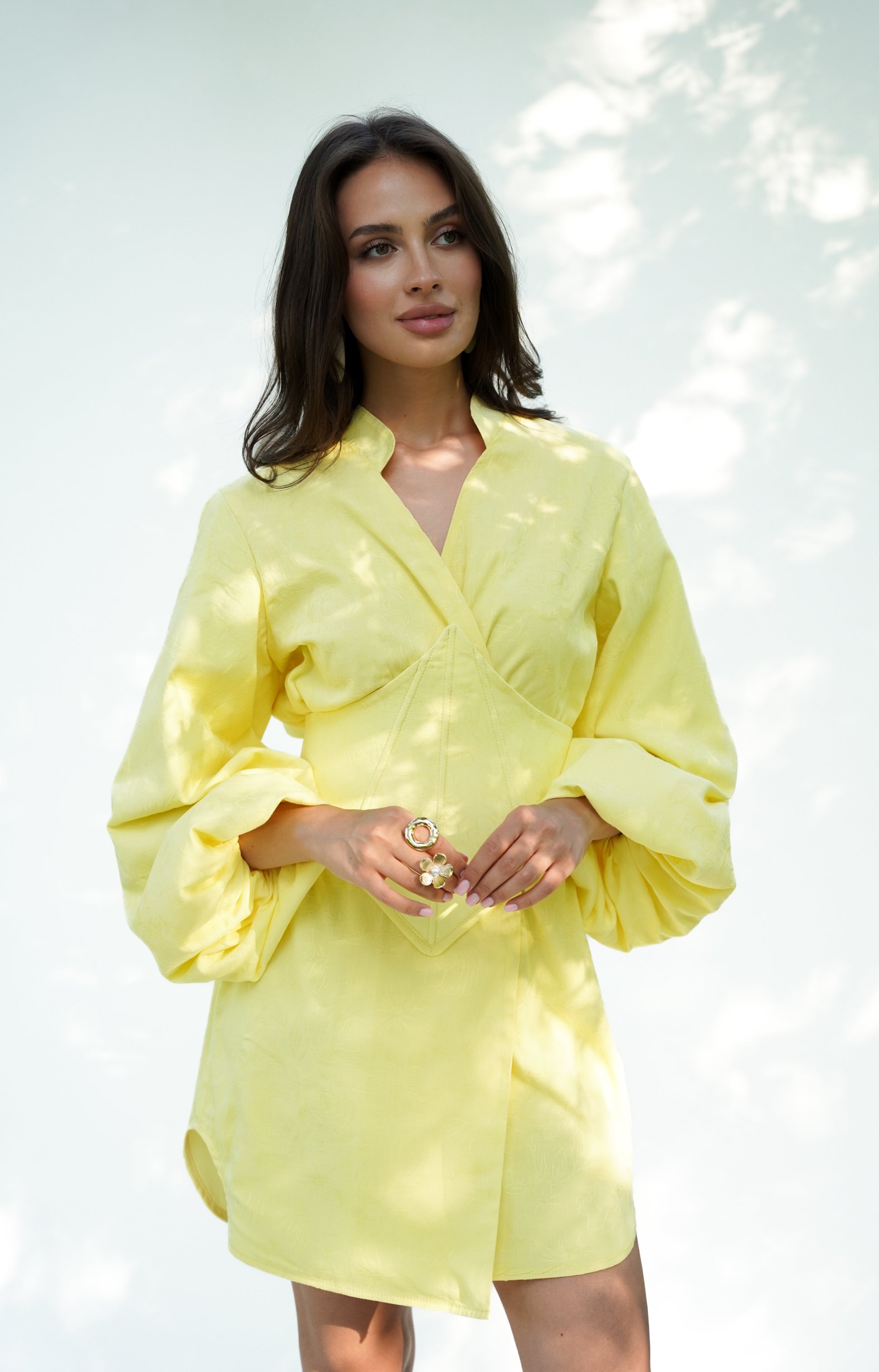Ця кімоно-сукня з корсетом поєднує традиційний крій із сучасним силуетом. Пишні рукави, акцентований комір та геометричний корсет додають образу вишуканості та виразності. Така модель ідеально пасує як для урочистих подій, так і для стильних повсякденних виходів.