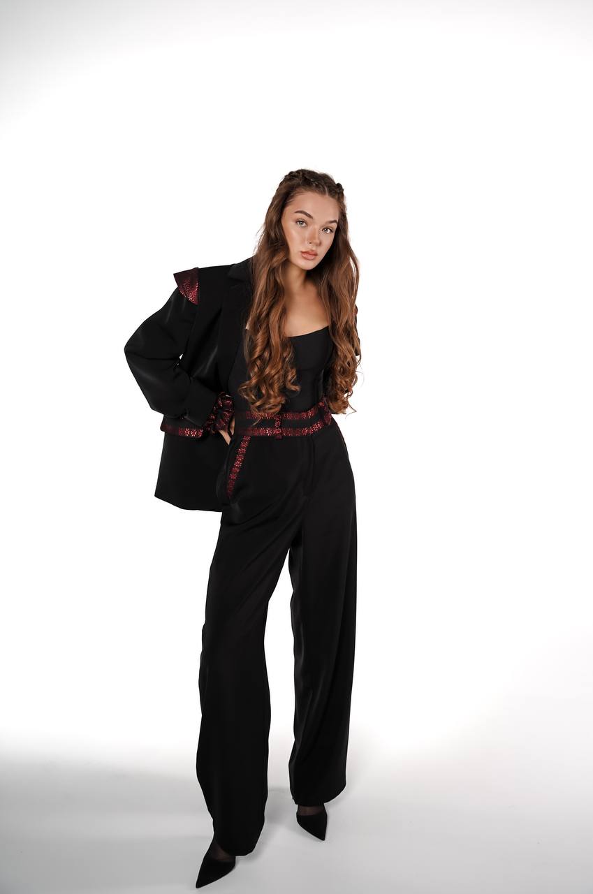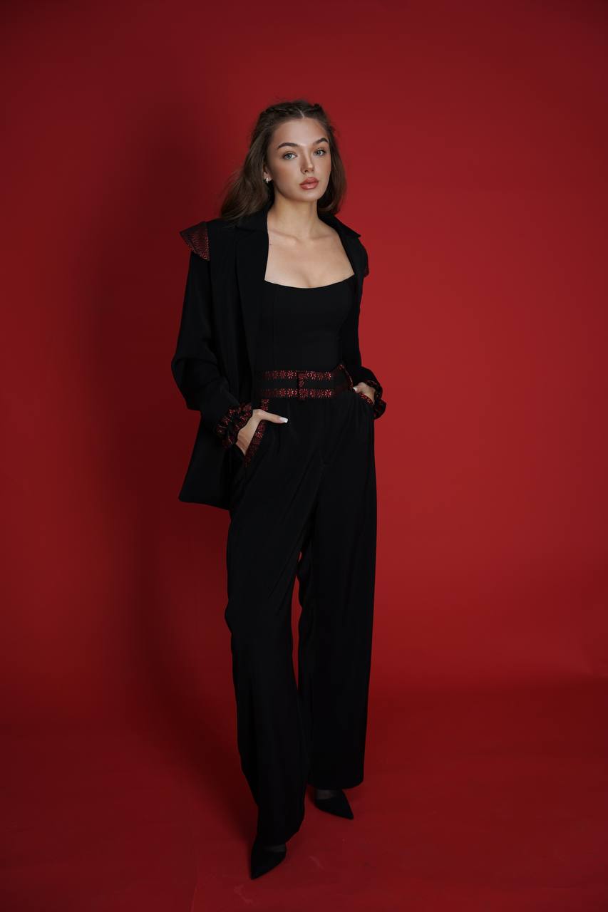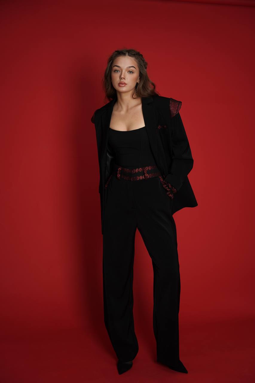Ці брюки легко поєднуються з сорочками, корсетами або жакетами, утворюючи як ділові, так і кежуал-образи. Ідеально підходять для тих, хто хоче додати до гардеробу вишуканий етно-акцент без втрати сучасності.
