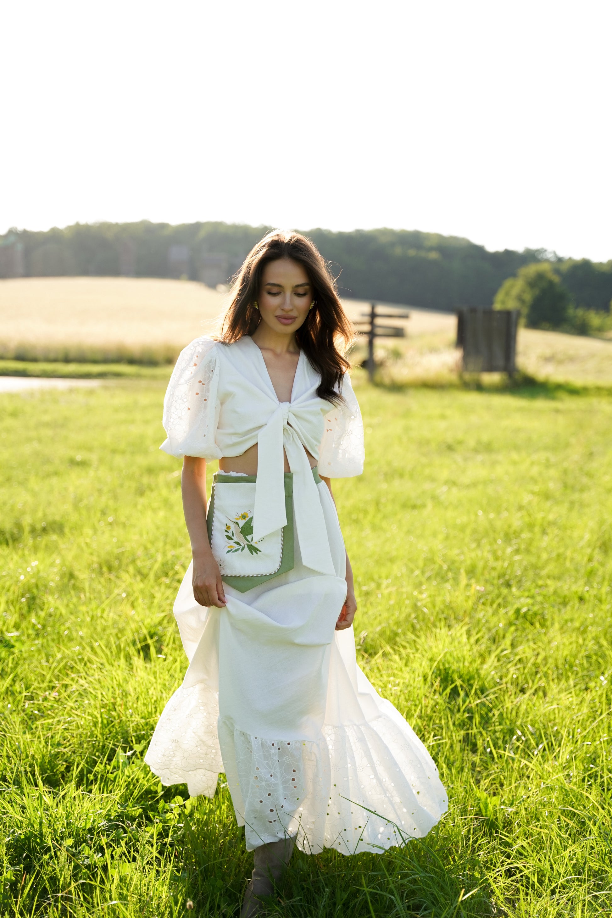 Цей жіночий літній топ із зав’язкою спереду - ідеальне втілення легкості та жіночності. Виконаний із натуральної тканини (поєднання льону та віскози), він забезпечує комфорт навіть у найспекотніші дні. Об’ємні рукави-ліхтарики оздоблені ажурною вишивкою прошвою, що додає виробу ніжності й вишуканості.