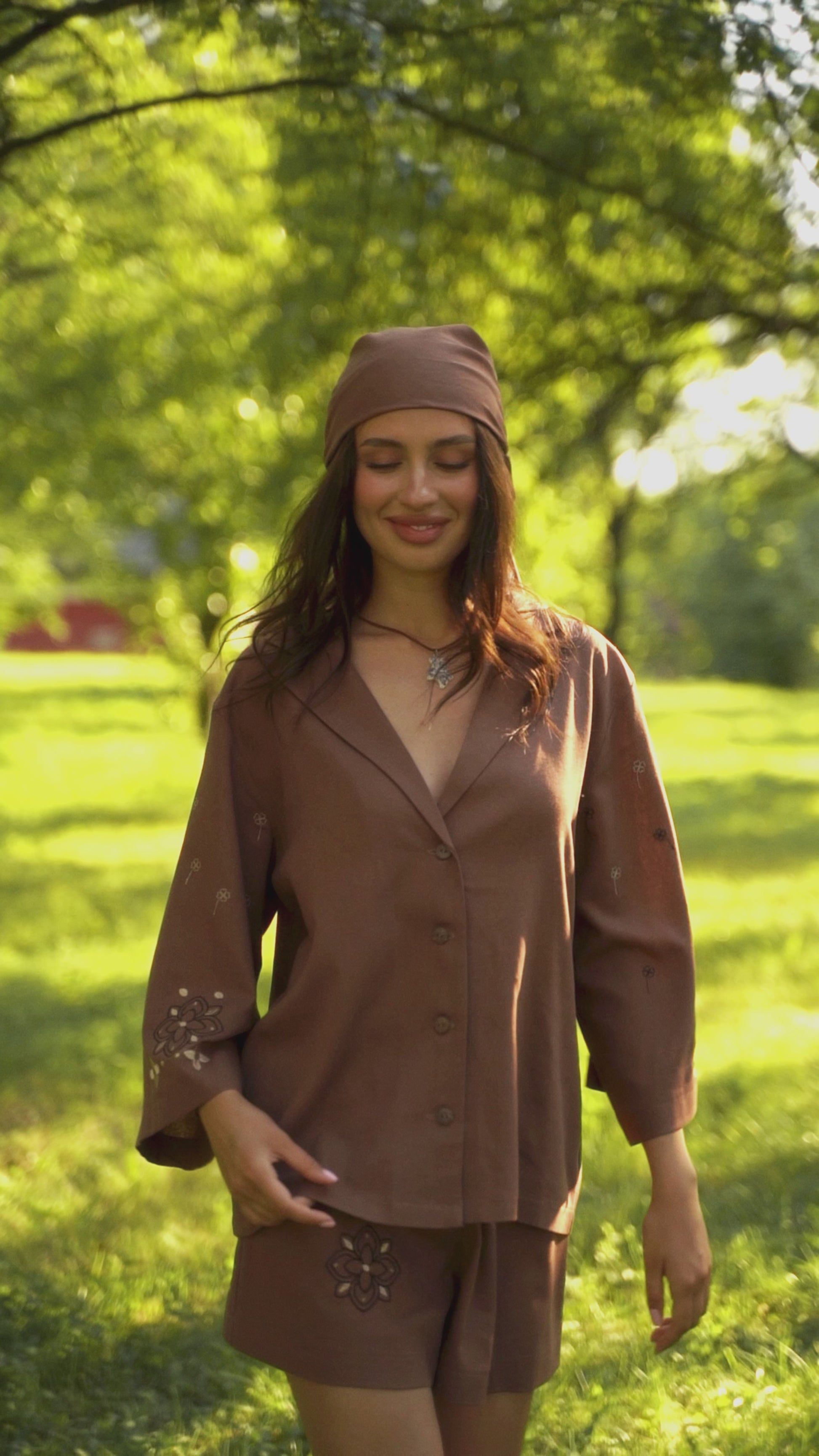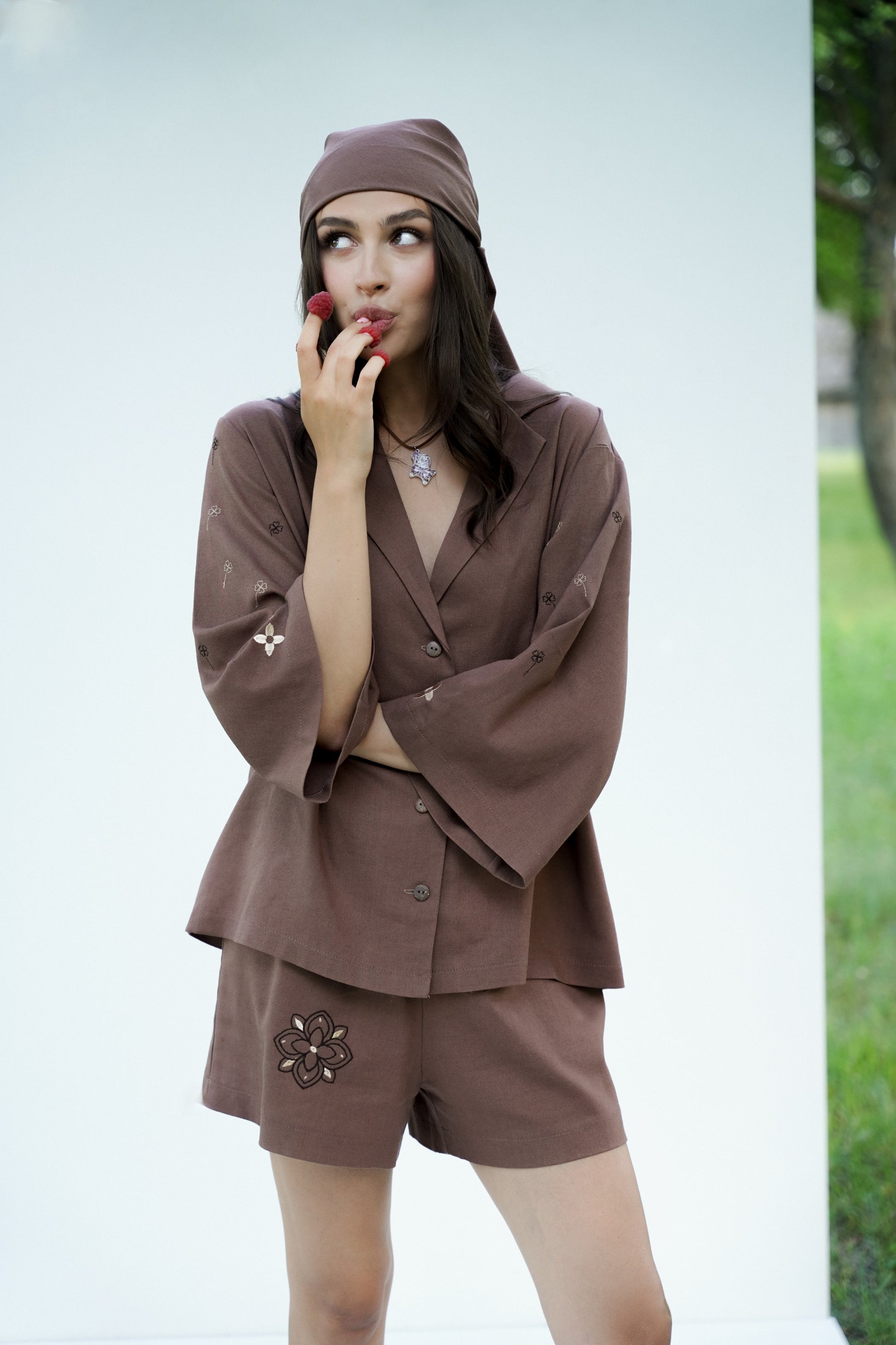 Укорочені шорти з декоративною вишивкою в поєднанні з кімоно створюють легкий етнічний акцент, не втрачаючи сучасної елегантності. Це ідеальний базовий комплект для тих, хто цінує комфорт, жіночність і стиль у натуральних тканинах.
