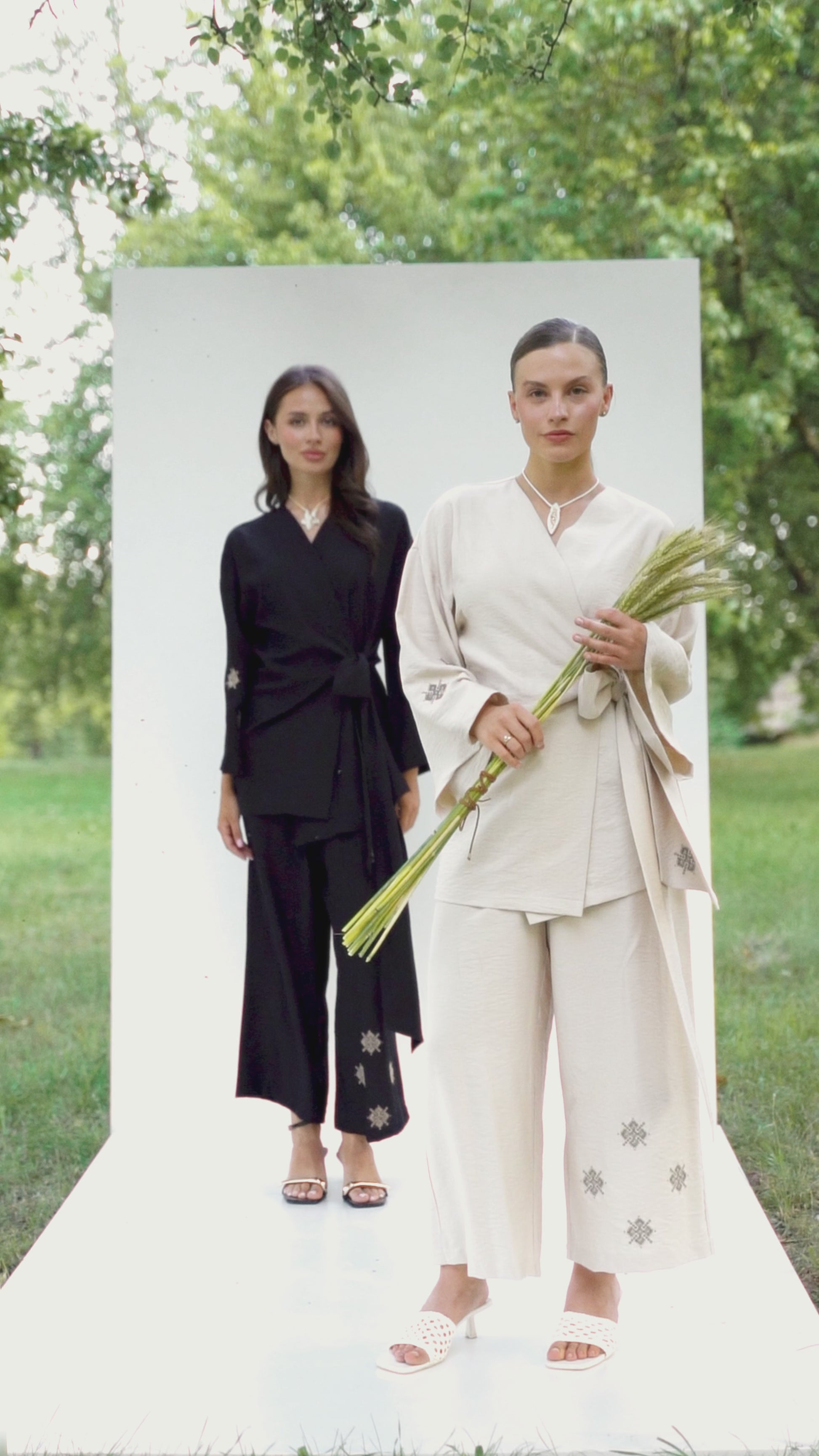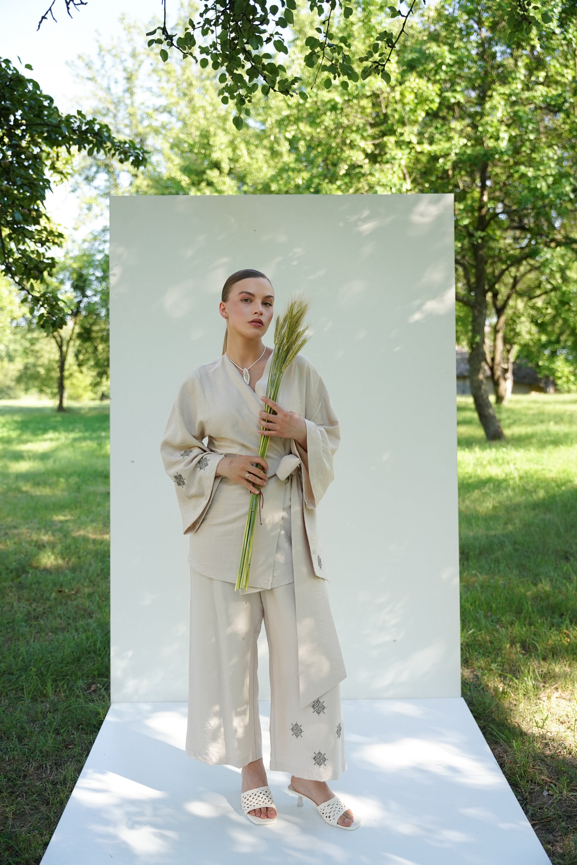 Цей костюм - ідеальний вибір для поціновувачок природної естетики, етичної моди та комфорту. Виготовлений із дихаючої натуральної тканини, він поєднує в собі простоту ліній, традиційні мотиви та сучасний крій. Широкі штани й кімоно на запах формують гармонійний силует, що не сковує рухів і дозволяє почуватися впевнено в будь-яких обставинах.