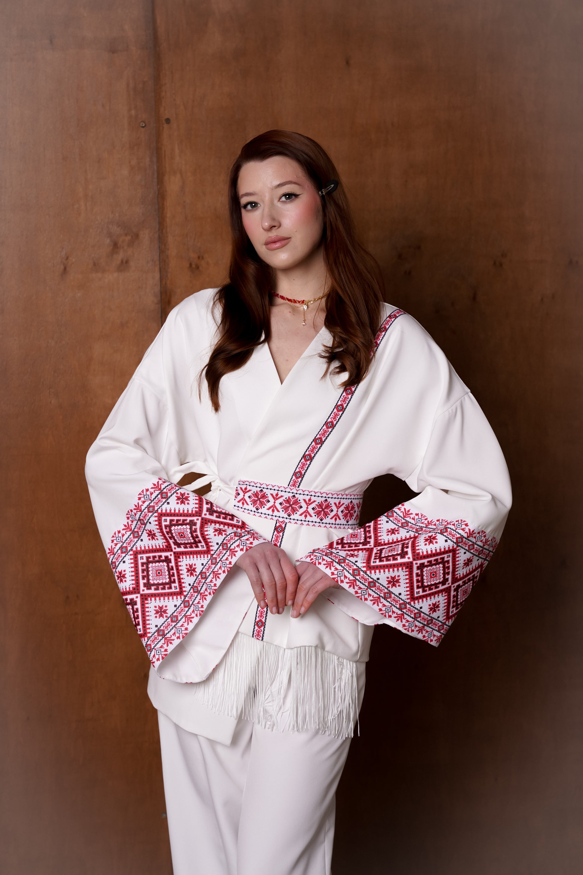 Це не просто кімоно - це модернова вишиванка в образі, створена для жінки, яка цінує глибину культури й силу стилю. Головний акцент - геометрична вишивка, розміщена на рукавах і поясі, що додає контрасту до чистого білого полотна. Вільний крій, розкішні рукави-крильця, акцент на талії - кожна деталь говорить про елегантність та самобутність.