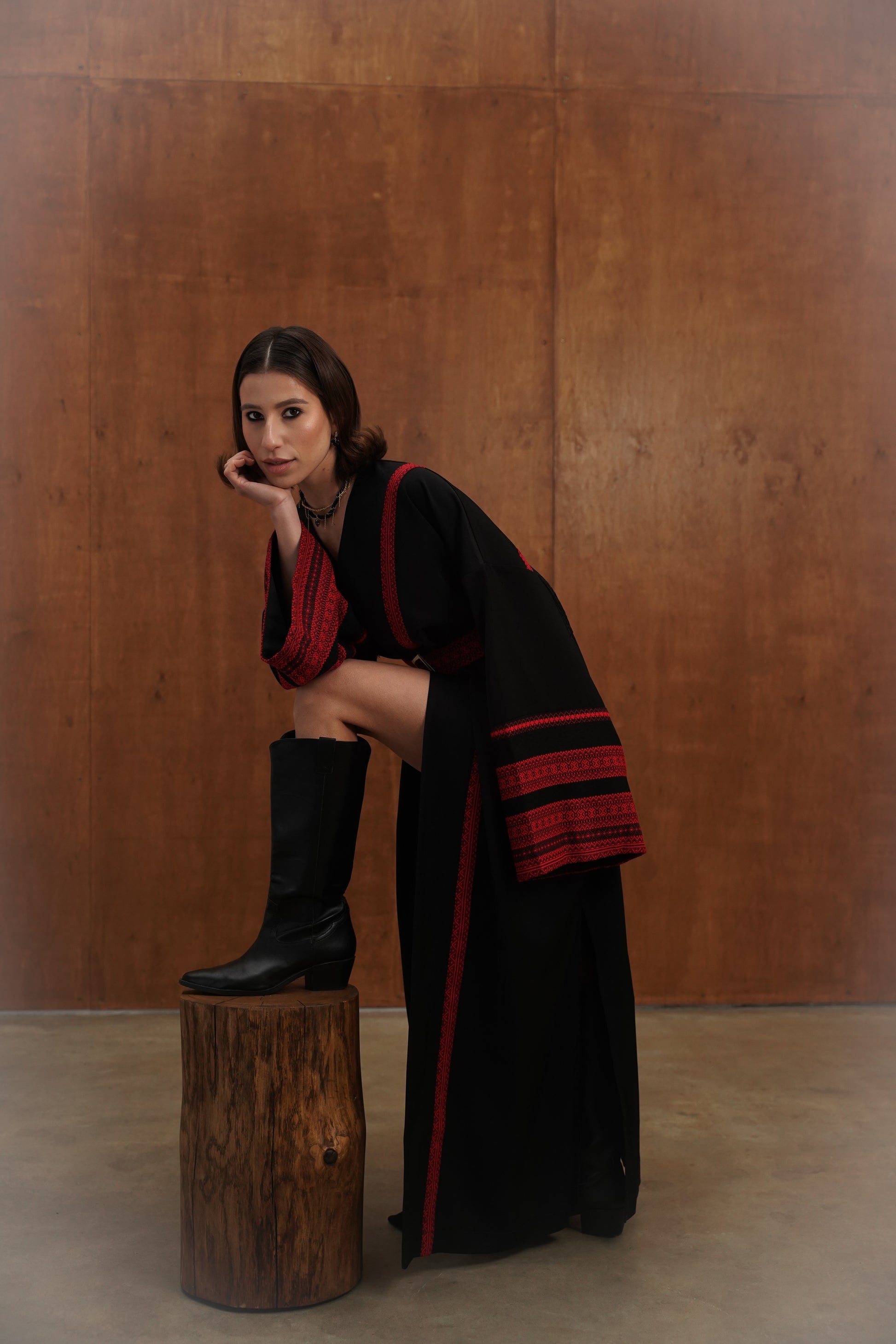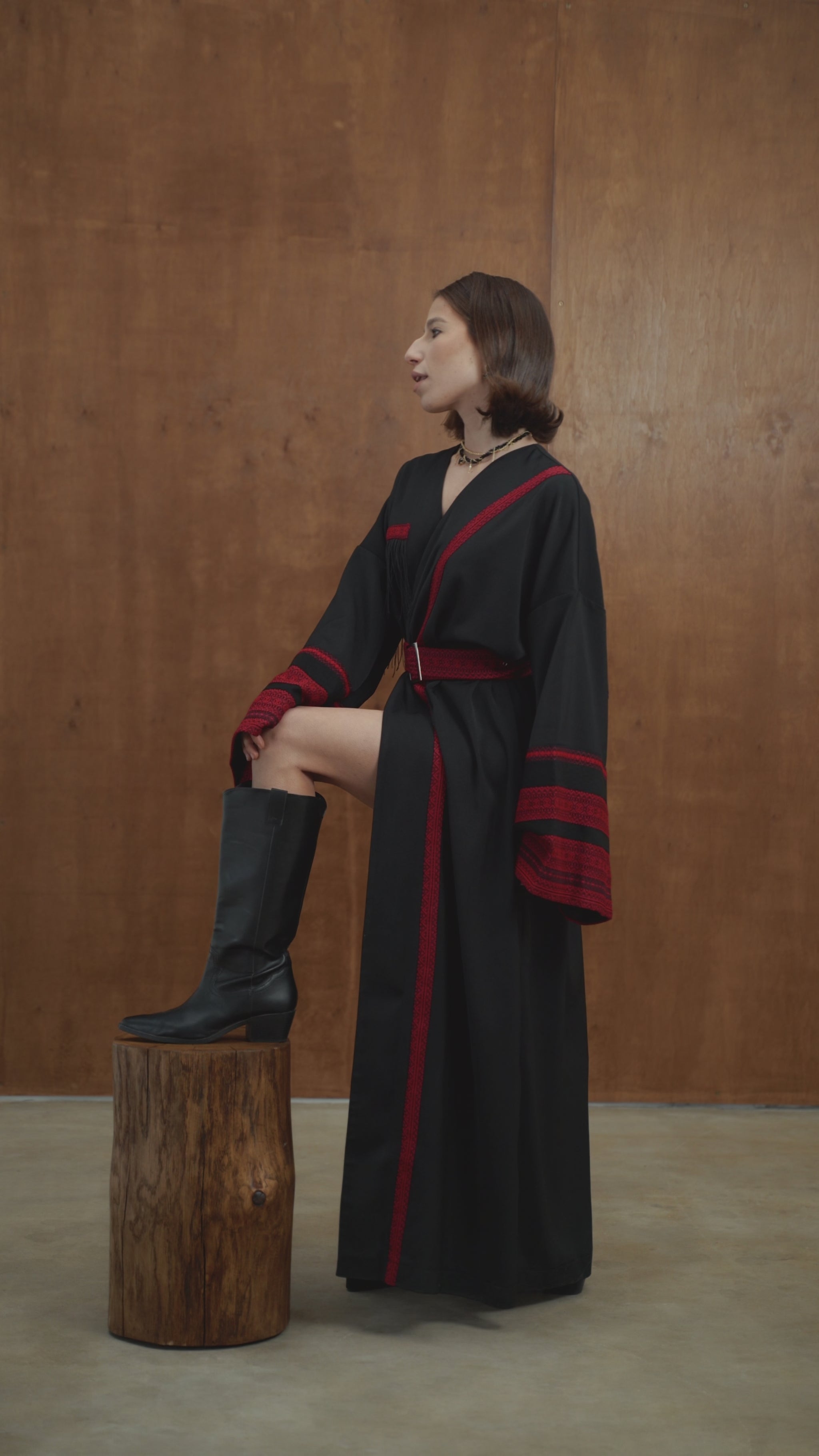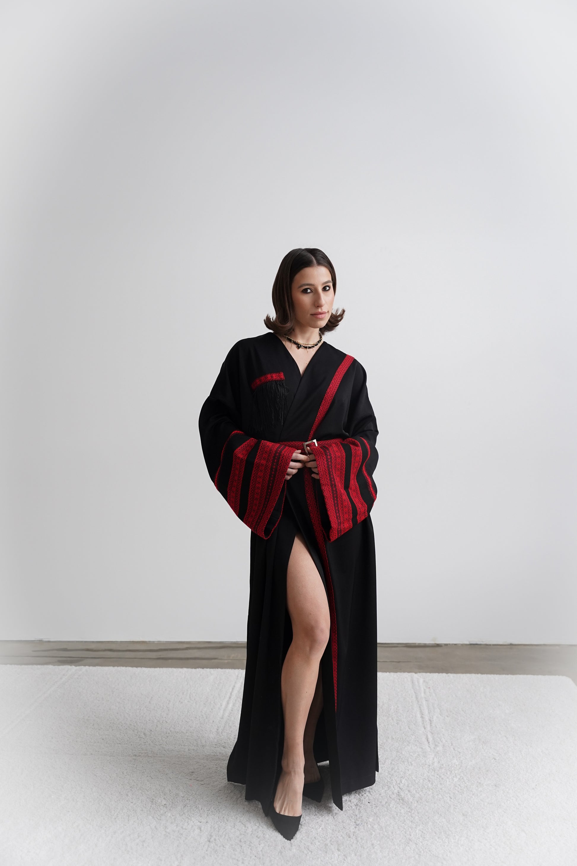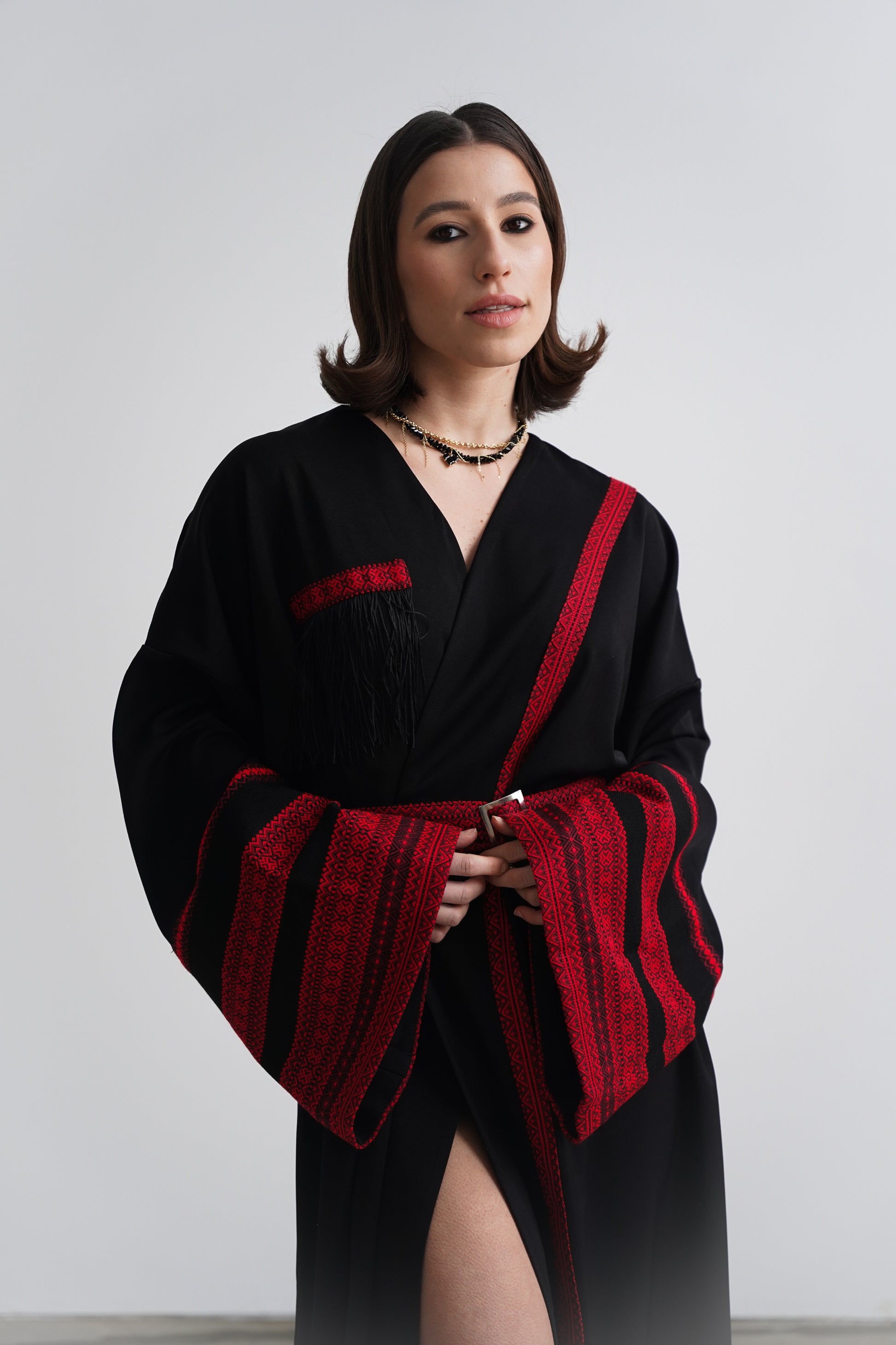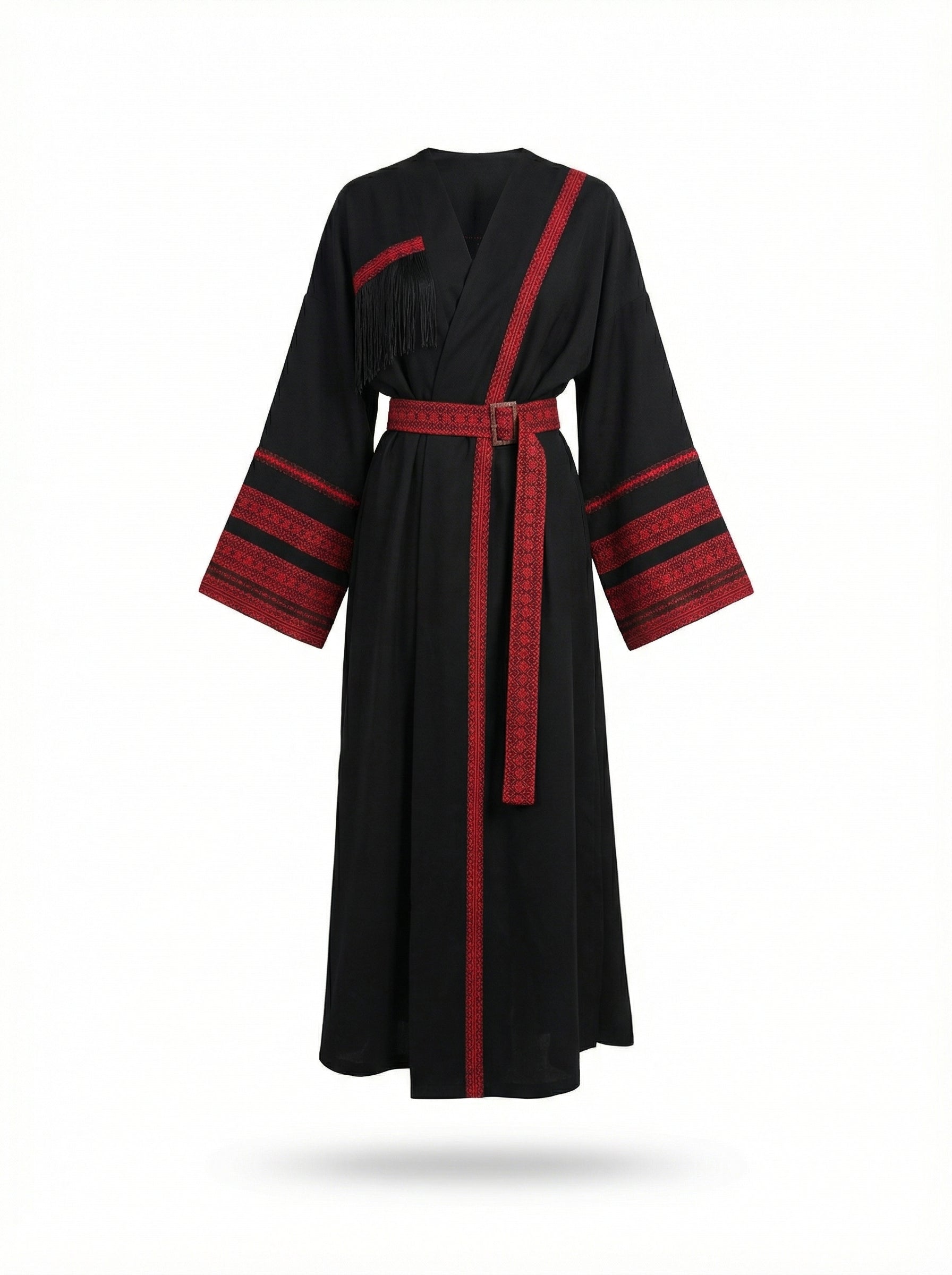 Це кімоно - не просто одяг, а справжня заява про стиль. Глибокий чорний колір, акценти у вигляді червоної вишивки та делікатна бахрома на грудях створюють унікальний баланс між традиційними мотивами та модною драматичністю. Широкі рукави, акцентований пояс із вишитим орнаментом і мʼякий перелив тканини роблять силует елегантним і впевненим.